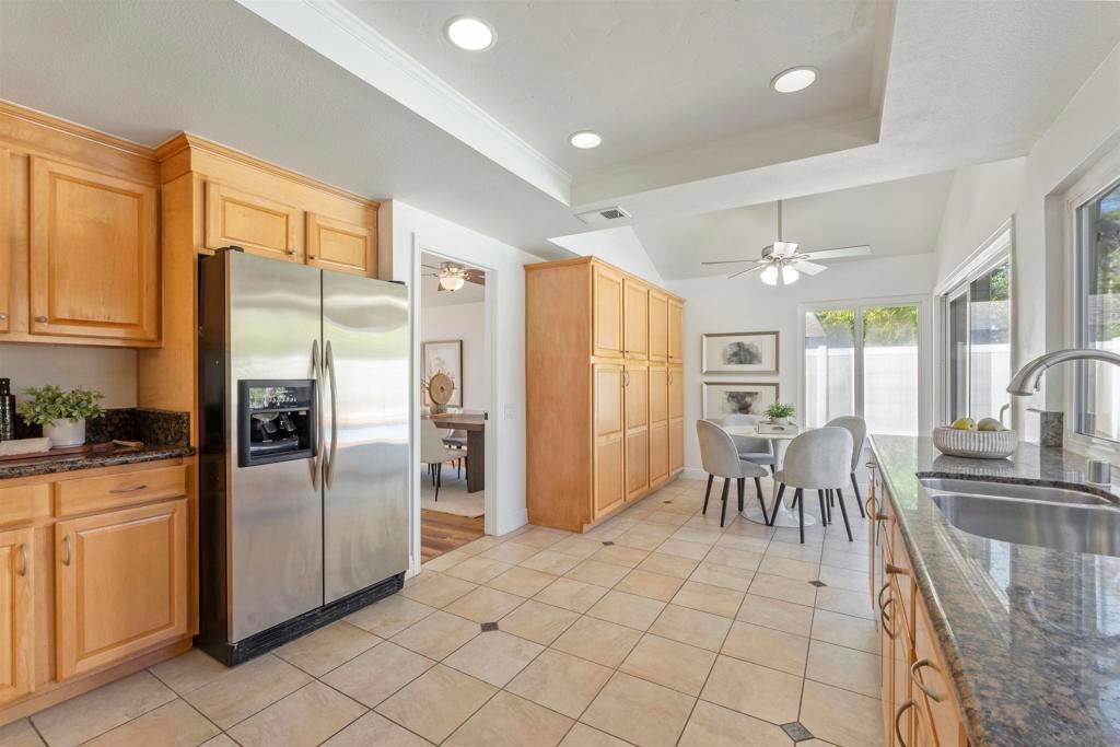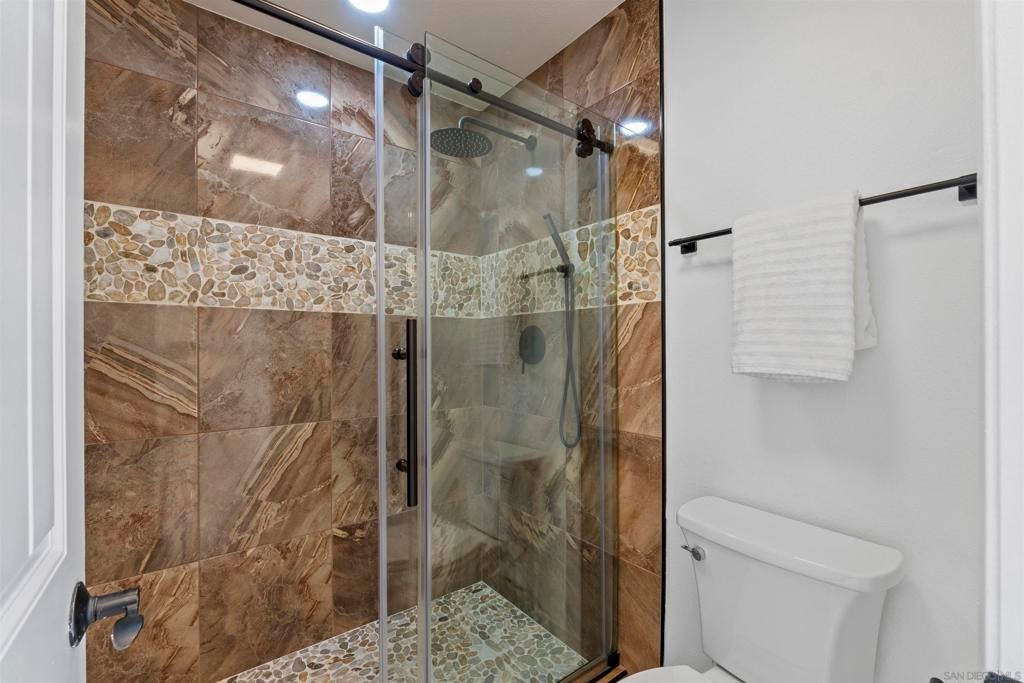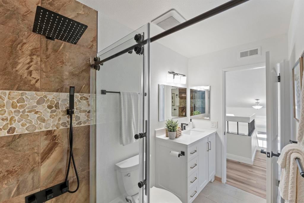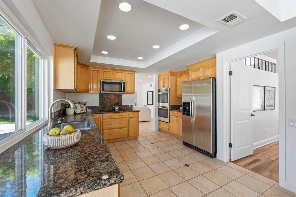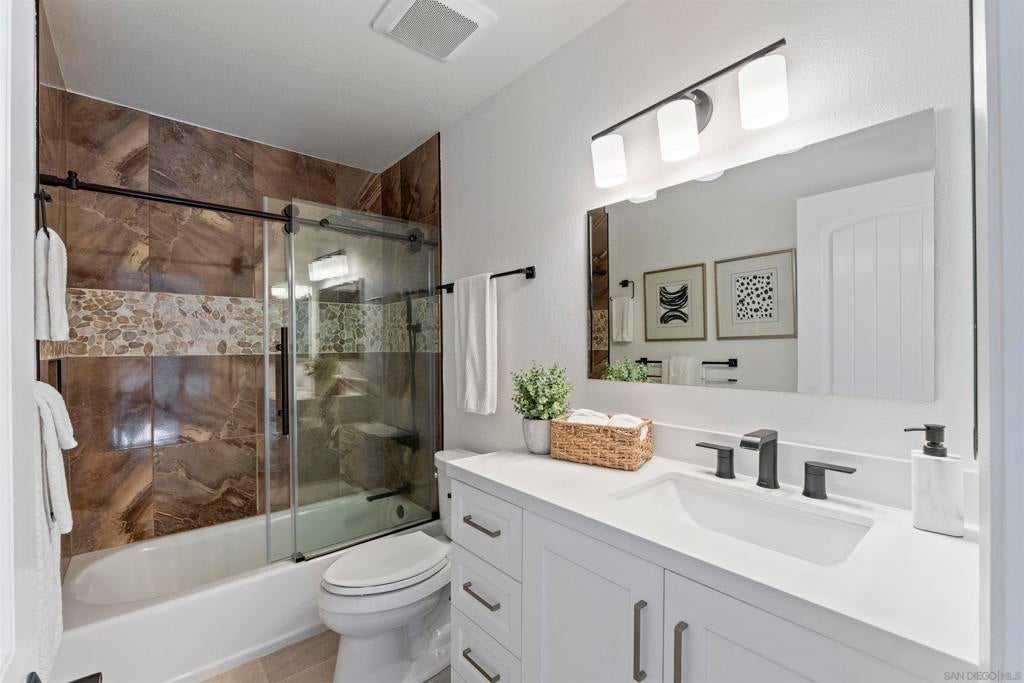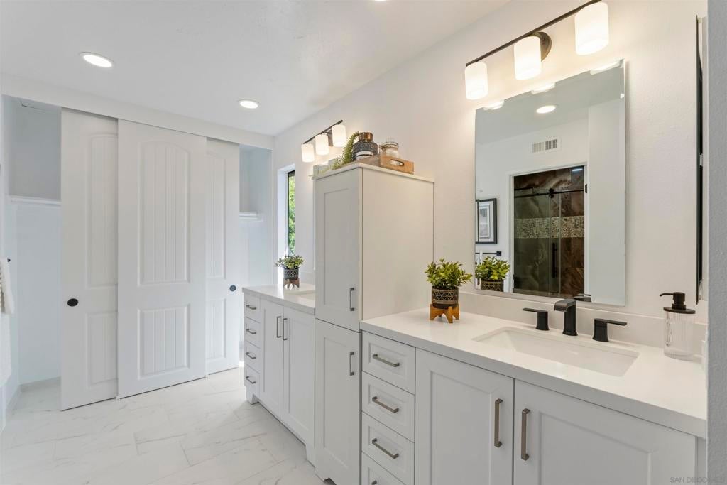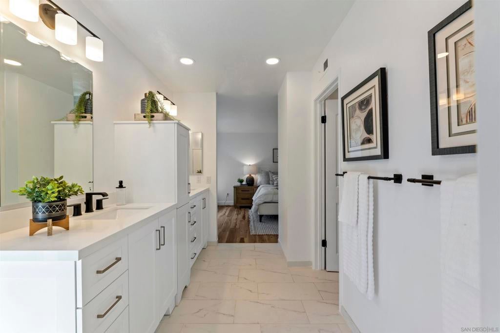 Located in the desirable Villa Trinidad community of Tierrasanta, this well-maintained two-story home sits on a canyon-side lot with a private pool and inviting outdoor space. Inside, soaring ceilings and abundant natural light highlight the spacious living and dining areas. The home offers 4 bedrooms and 3 fully remodeled bathrooms, including a convenient downstairs bedroom and full bath—ideal for guests, multi-generational living, or a home office.... See supplement The functional layout includes formal living and dining areas and a family room with a cozy fireplace. The kitchen features granite countertops, stainless steel appliances, and custom cabinetry. Upstairs, the primary suite includes a reading nook, while two additional bedrooms share a full bathroom. Additional highlights include updated LVP flooring throughout both levels, fresh interior paint, recessed lighting, and a newer HVAC system. The backyard is designed for easy outdoor living with a pool, artificial turf, and low-maintenance landscaping. Tierrasanta, known as the “Island in the Hills,” offers miles of trails in Mission Trails Regional Park, highly rated schools, community parks, and convenient access to I-15 and I-52, just minutes from Mission Bay, downtown San Diego, and the beaches.