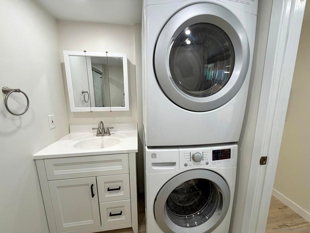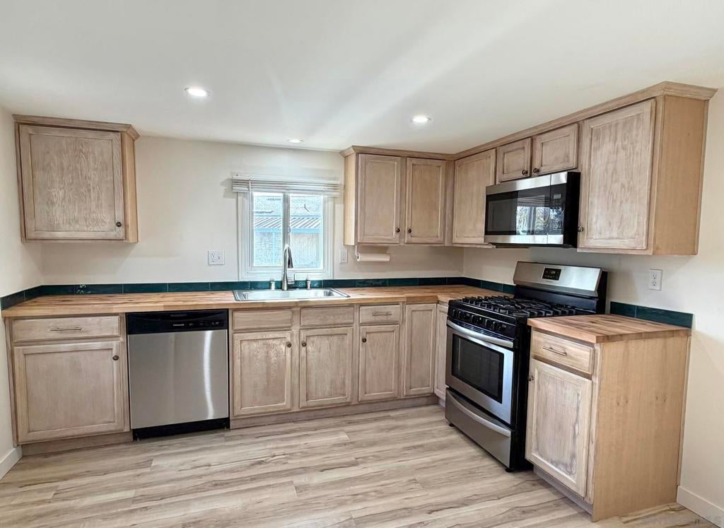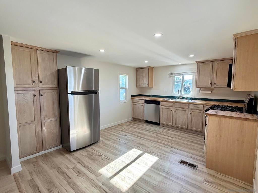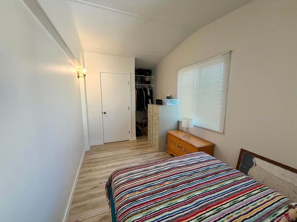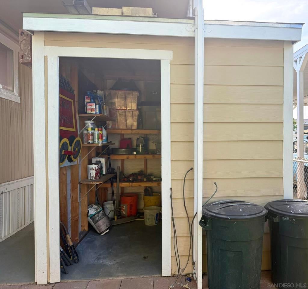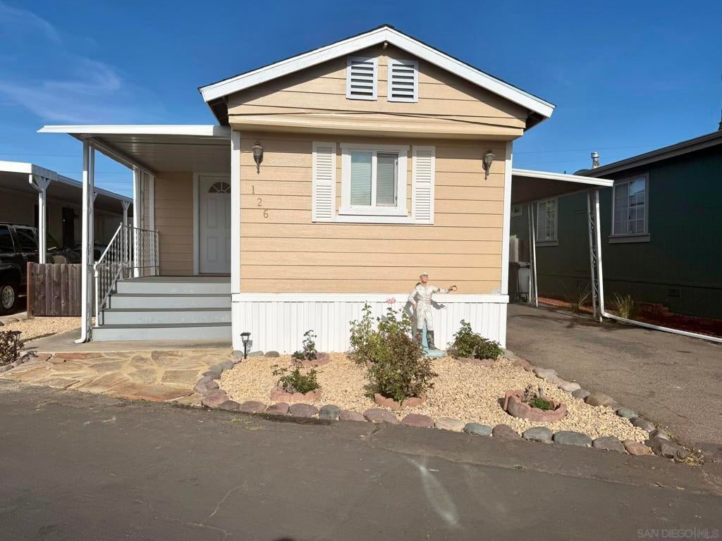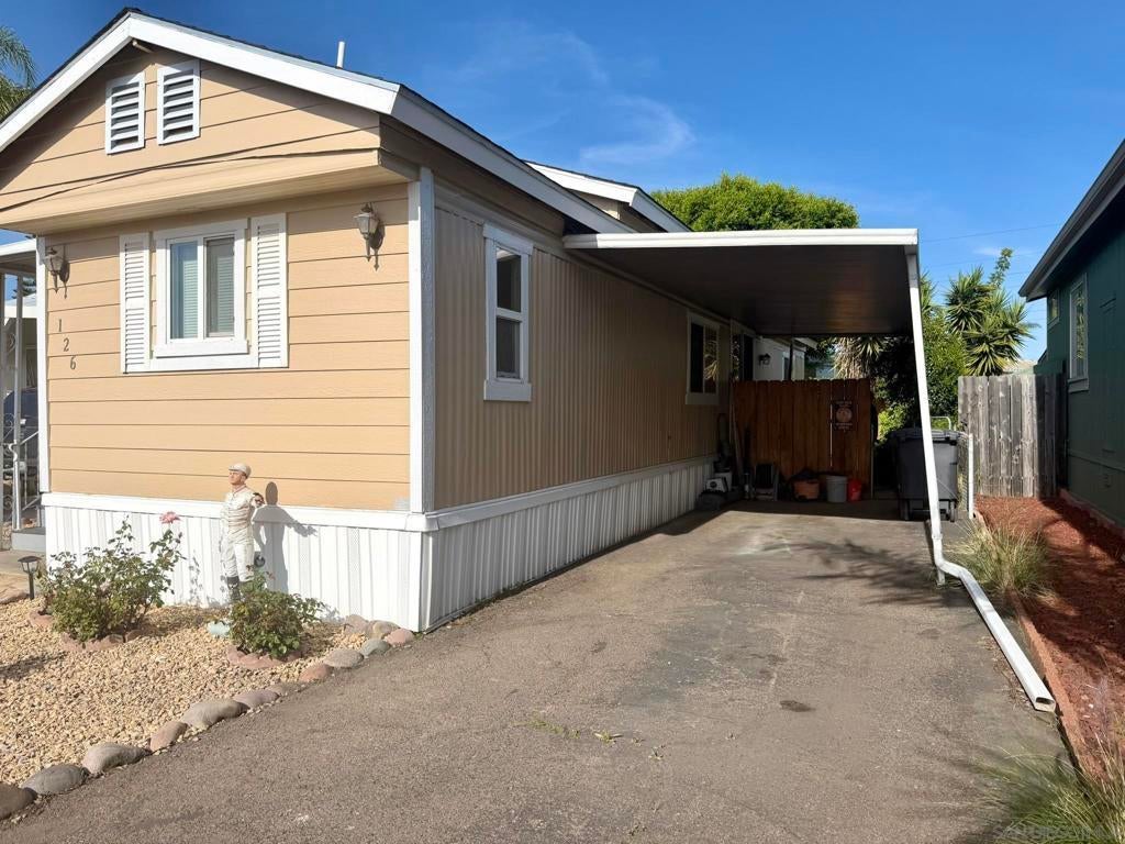 Fully remodeled 2-bedroom, 1 bathroom manufactured home centrally located in the heart of San Diego. This move-in ready home is part of an all ages, pet-friendly community park that features multiple swimming pools and a clubhouse. The home has been completely renovated and includes new vinyl flooring, new drywall, recessed lighting, and has been freshly painted in both the interior & exterior. The kitchen includes refinished and freshly painted cabinets, butcher block countertops, and a new sink, refrigerator and dishwasher. New roof in 2022. Stacked laundry is located inside the refinished bathroom. Covered carport driveway can fit 2 cars. Tool/storage shed in backyard for added convenience. Centrally located within 25 minutes to the beach and airport. Come check it out today!