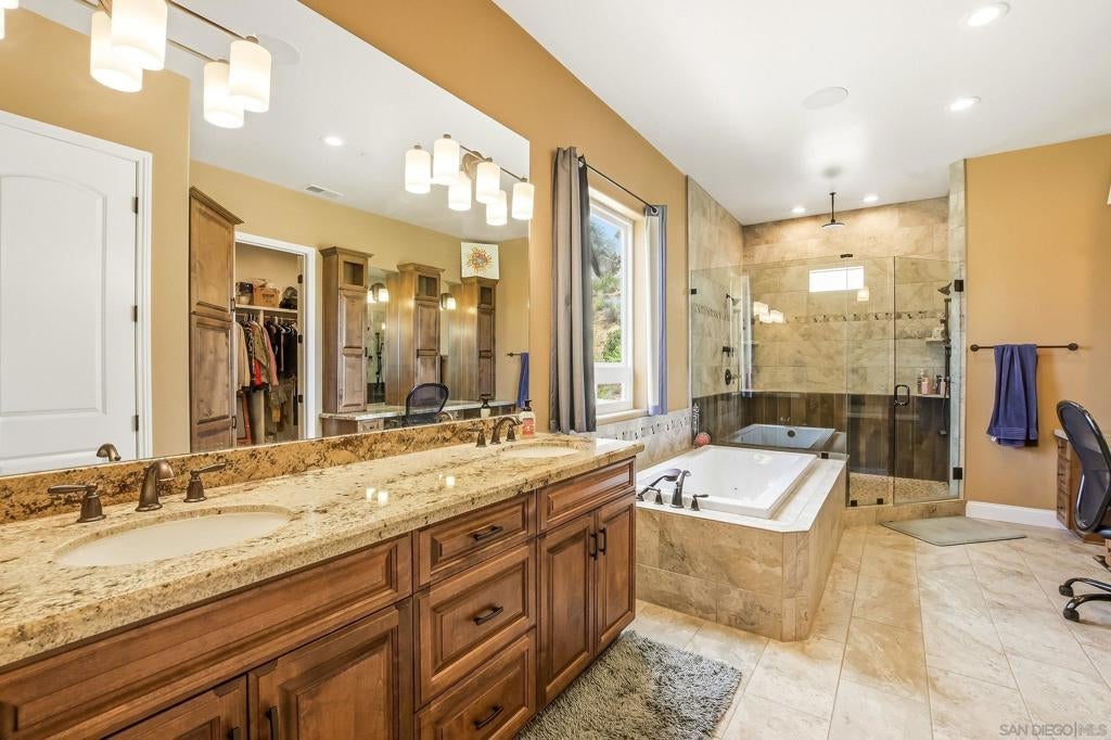 Experience the epitome of California living at 2043 Camino De Reimitz, Alpine. This sprawling custom-built home boasts a lavish 4,811 square feet of living space nestled atop a generous 6-acre lot. Plenty of land to add a second home (possibly a third home). With six bedrooms and five bathrooms, this residence offers an abundance of space for comfort and relaxation. Upon entering the gated street, you are welcomed by a private driveway paved entirely in cement leading into this grand estate. The house itself is a testament to architectural excellence with high ceilings that reach up to 11 & 18 feet, creating an airy and spacious atmosphere throughout. The interior design is impressive in its own right; featuring granite countertops, custom cabinetry, updated wiring throughout and dual-zone HVAC. The wide hallways measuring between 5-6 foot in width ensure easy movement within the house. Four bedrooms come complete with en-suite bathrooms for added convenience along with two additional guest bathrooms located near the kitchen and main hallway respectively. Outside, the property continues to impress with its expansive covered patio adorned with stamped cement overlooking the custom pool and spa area - perfect for hosting or simply unwinding after a long day. A sizable detached garage that spans over 1,500 square feet can accommodate up to four cars comfortably while also offering ample storage space. This home is not just about luxury but also about sustainability as it comes equipped with 24 paid solar panels that cover all electricity needs making it energy efficient. Beyond the confines of this stunning property lies the thriving community of Alpine which is fast becoming one of San Diego's most sought-after neighborhoods. Here you will find top-rated schools, beautiful parks, shopping centers and dining options just minutes away from your doorstep. Alpine offers residents a unique blend of rural tranquility coupled with modern amenities making it an ideal place to call home. Enjoy outdoor activities? Alpine has numerous hiking trails and natural parks where you can enjoy California's natural beauty. In essence, 2043 Camino De Reimitz, Alpine is not just a house but an experience. A place where luxury meets comfort and convenience; where every day feels like a vacation. Come and see for yourself what this exceptional property has to offer! Some photos are virtually staged...un-staged photos are included in media catalog.