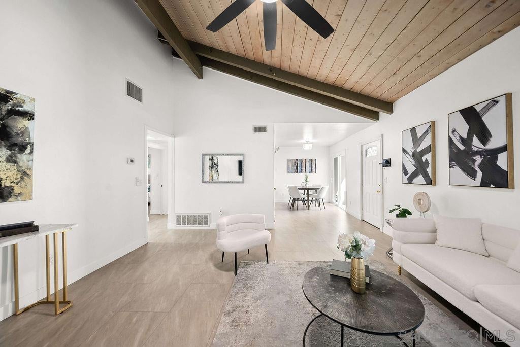 Light-filled and private, this single-story 2-bedroom, 2-bath condo offers vaulted ceilings with exposed beams, limited shared walls, and a functional layout designed for comfortable everyday living. Two private outdoor spaces, including an enclosed patio, provide great flexibility for relaxing or entertaining. Additional highlights include central HVAC, a solar system for improved energy efficiency, a dedicated carport, and a large private storage room with a full-size washer and dryer. Residents enjoy community amenities such as a pool, clubhouse, and dog runs, plus peace of mind from recent major improvements including a newer roof and upgraded electrical panels. Conveniently located near shopping, dining, schools, and daily essentials, this well-maintained home offers an excellent opportunity in a central El Cajon location.