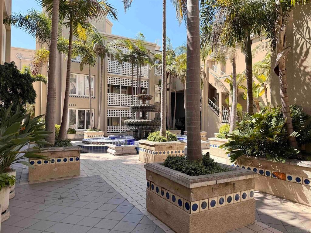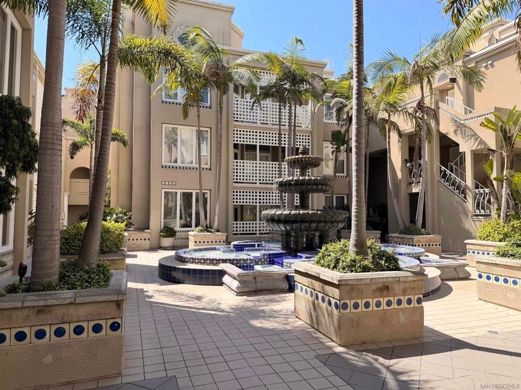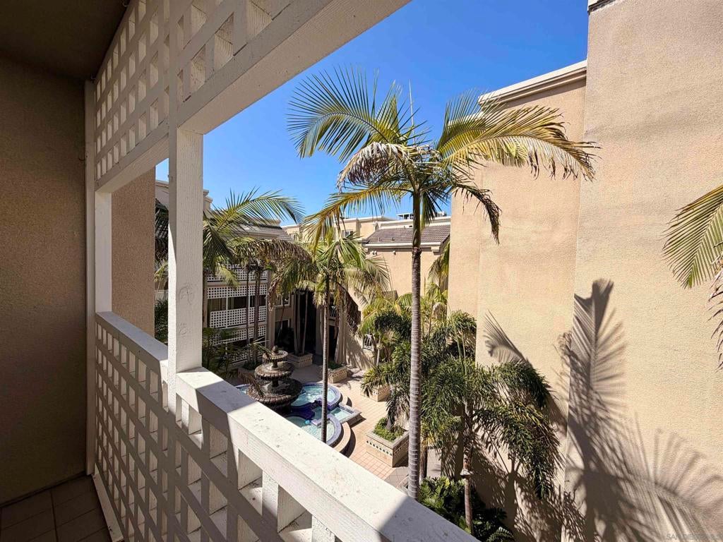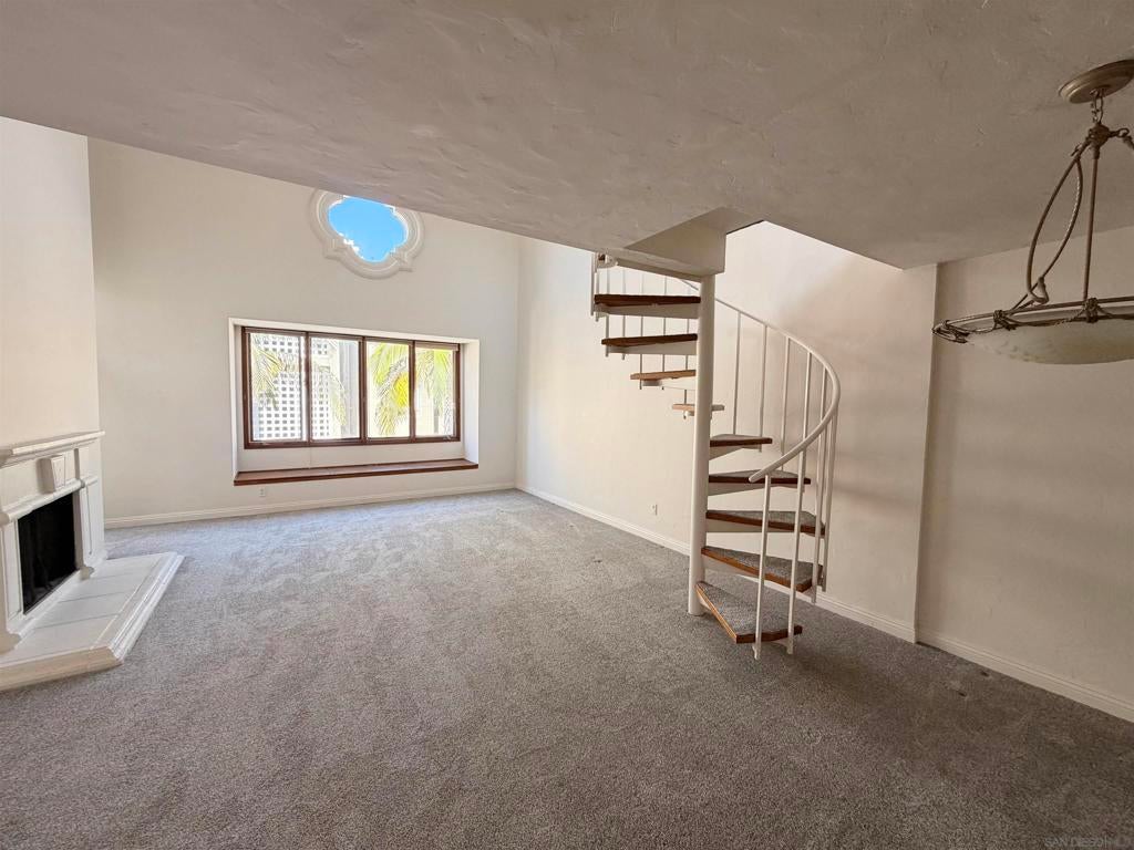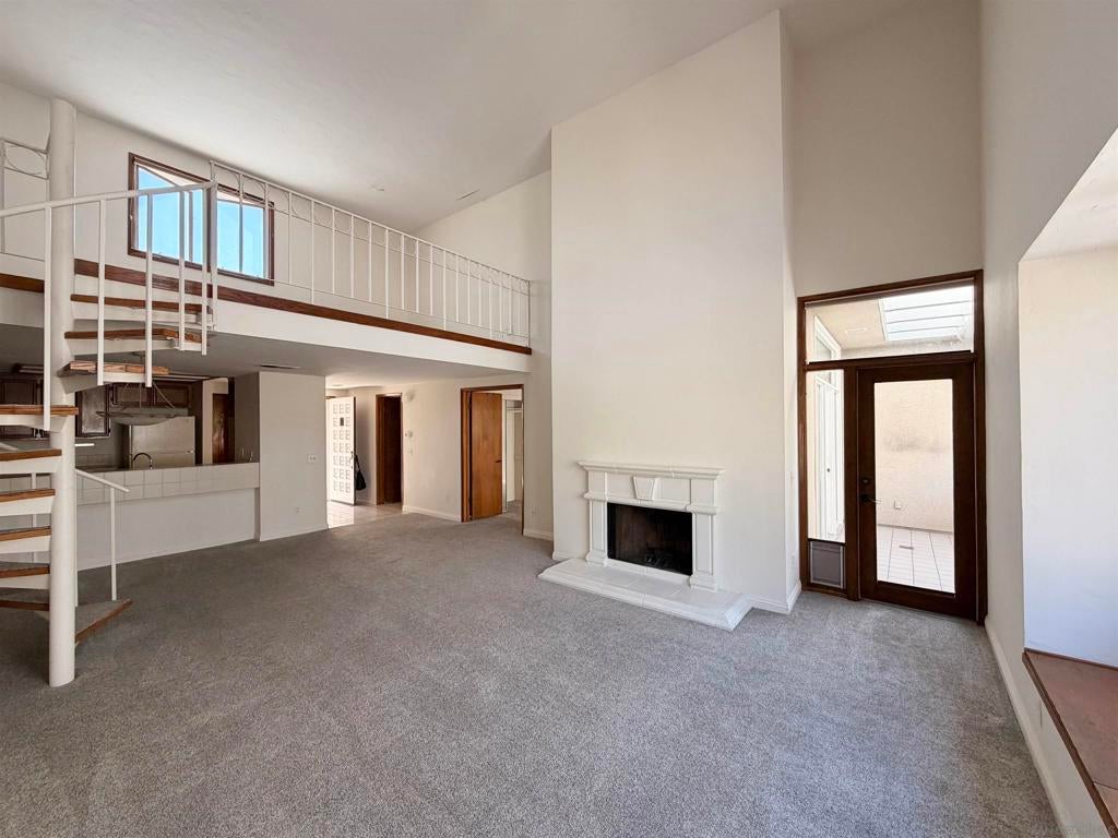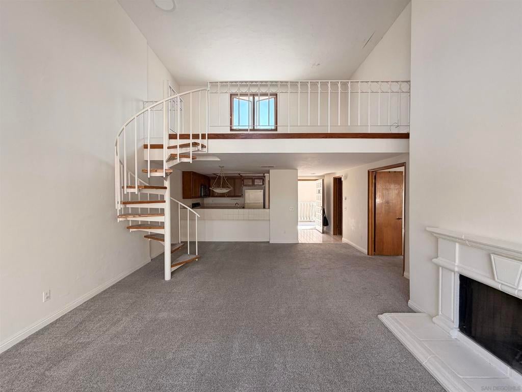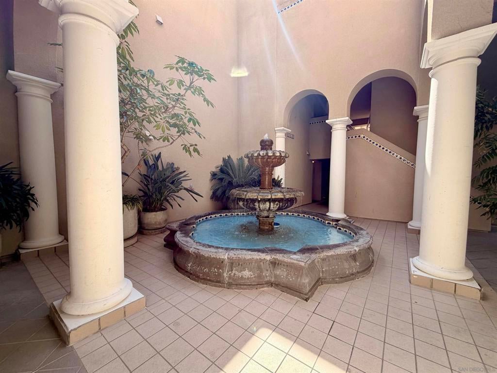 Beautifully designed residence in the heart of UTC featuring soaring ceilings and an open, light-filled layout. This unique unit offers a spacious living area with fireplace, large windows, and abundant natural light throughout. A charming spiral staircase leads to a versatile loft space—perfect for a home office, guest area, or additional living space. The kitchen opens to the dining and living areas, creating an ideal flow for everyday living and entertaining. Enjoy indoor-outdoor living with a private balcony overlooking a lush courtyard with fountain. The generously sized primary bedroom offers ample closet space and convenient access to the bathroom. Located in a well-maintained community with resort-style amenities including a pool, spa, and tennis courts. Assigned parking included. Prime location near UCSD, Westfield UTC, shopping, dining, and easy freeway access. Ideal opportunity for homeowners or investors seeking a central San Diego lifestyle.