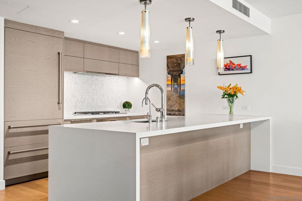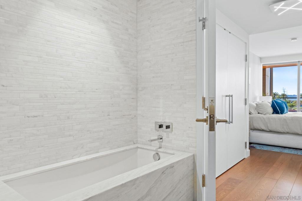 Experience luxury coastal living in this beautiful west-facing residence with soft sunset and glistening bay views. Featuring one of the largest private covered terraces at Pacific Gate, this unique floor plan offers an expansive outdoor retreat rarely found in high-rise living. The gourmet kitchen showcases touch-open cabinetry, Sub-Zero, Wolf, and Miele appliances, plus a wine chiller. The dining and living areas are enhanced with California Closets built-ins, including a multi-functional pantry, floating wine glass cabinet, and a built-in Napoleon electric fireplace. Control media, climate, lighting, and window shades with ease through the in-home panel or ELAN mobile app. The primary suite features dual California Closets valets and a spa-like bath with heated floors, walk-in shower, soaking tub, and LED mirror with integrated TV. Privately located along a quiet corridor in the building, this residence offers convenient access to the business center, conference room, and screening room, ideal for a work-from-home lifestyle. Pacific Gate amenities include 24/7 concierge and security, private yacht and luxury car fleet, resort-style pool and spa, sauna, steam room, fitness center, and outdoor spaces with BBQs, fire pits, and lounges. Residents also enjoy a community and screening room for hosting. Includes 2 premier parking spaces and a large private storage unit on P1. Ideally located in the heart of San Diego’s waterfront, just moments from top dining, parks, and everyday conveniences. Residence 307 brings together privacy, comfort, and a resort-style feel. The first all-glass Super Prime residential tower in San Diego offers an unprecedented waterfront lifestyle with sky-high amenities and picture-postcard views. Directly overlooking the waterfront, the 41-story tower contains an exclusive offering of homes designed by Hirsch Bedner Associates. Renowned New York-based architectural firm Kohn Pedersen Fox (KPF) created a landmark that reimaged the San Diego skyline. The custom-engineered glass walls dynamically reflect the hues of the sky and the Pacific Ocean. Pacific Gate has evolved the San Diego skyline and represents the future of the city. The building is comprised of two-nested curved glass towers that rise as a single column from a three-story ground floor retail podium on the north and west sides of the tower. Because of the building’s curves and exterior glass, Pacific Gate offers a striking viewing experience from every vantage point. Residents arrive home to a beautifully landscaped motor court with a private luxury car fleet, which leads to a double-height lobby with a 24-hour concierge and porter services. Two levels of amenities boast a residents lounge ideal for events and everyday use, the fitness center contains an extensive range of state-of-the-art equipment. Adjacent to the fitness center is the steam and sauna retreats that open up to the fourth-floor pool terrace fitted with poolside cabanas and glass surround.