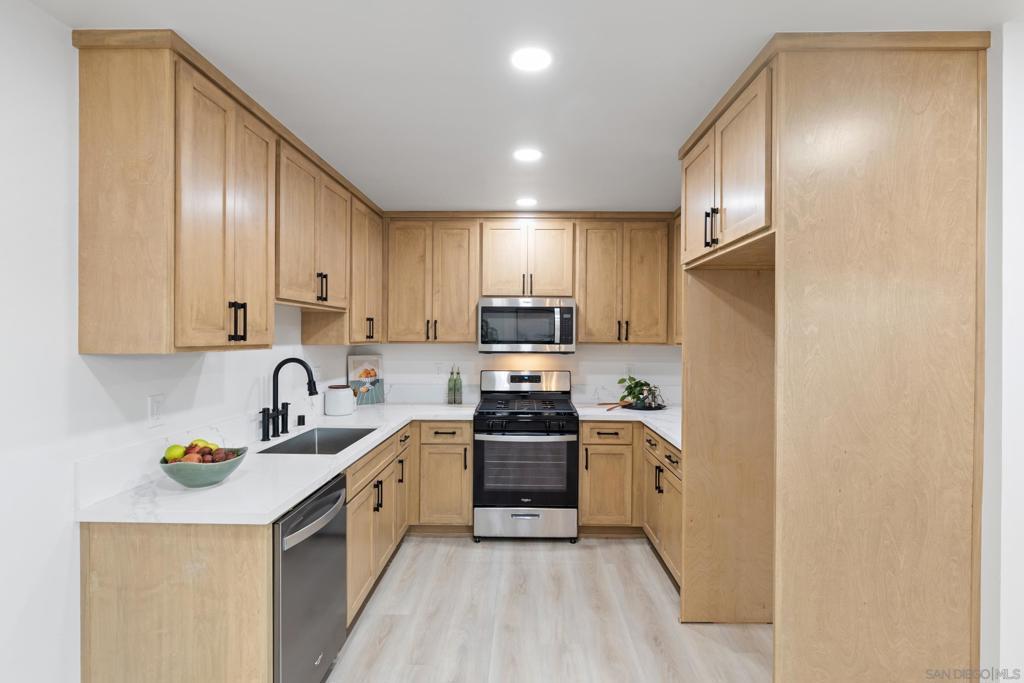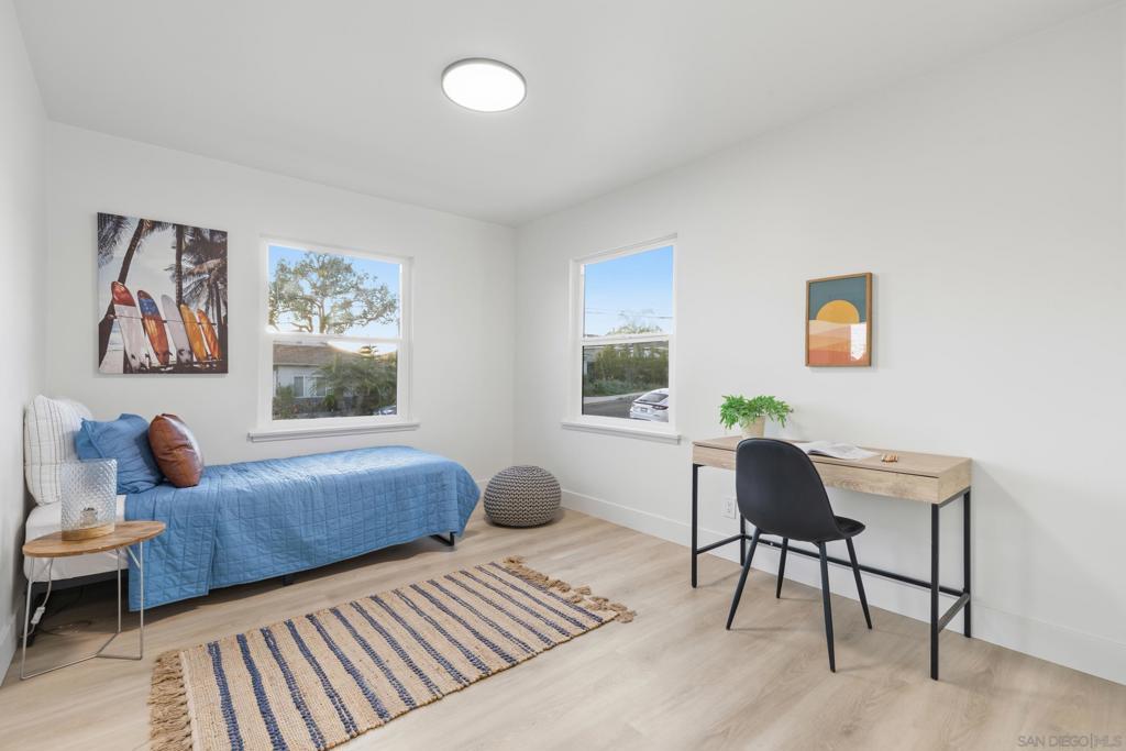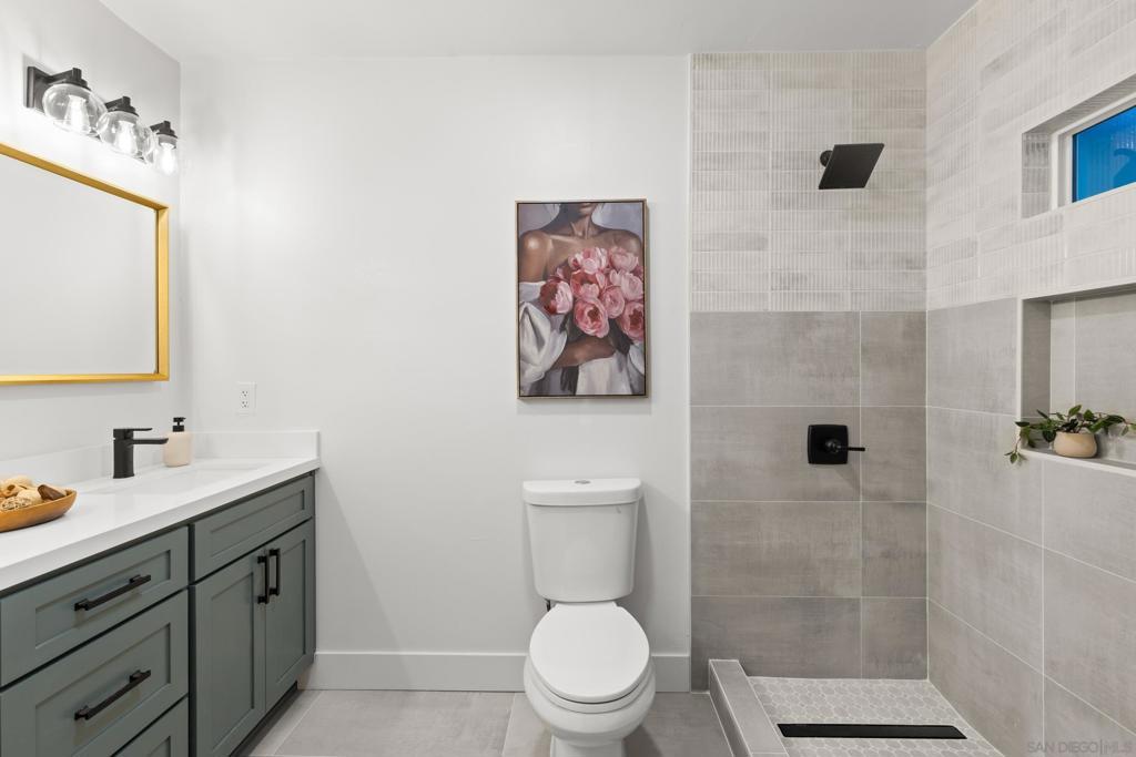 Beautifully remodeled home in San Diego offering the perfect blend of modern upgrades, character, and future potential. A detached garage presents an excellent ADU opportunity, while the long driveway provides ample parking for multiple vehicles. Inside, the spacious living room features a striking wood beam ceiling that adds warmth and charm, flowing into an open-concept layout designed for comfortable living and entertaining. The custom kitchen showcases river wash cabinetry, quartz countertops, stainless-steel appliances, and connects seamlessly to the dining area highlighted by a designer accent wall. The expansive primary suite serves as a private retreat with a spa-inspired bathroom, dual sink vanity, and an oversized tiled shower. Secondary bedrooms are generously sized, offering flexibility for guests, family, or a home office. Step outside to a large backyard with a covered patio, where you can relax or entertain while taking in scenic mountaintop views. A unique opportunity to enjoy a move-in ready home with added value potential in a convenient central San Diego location.