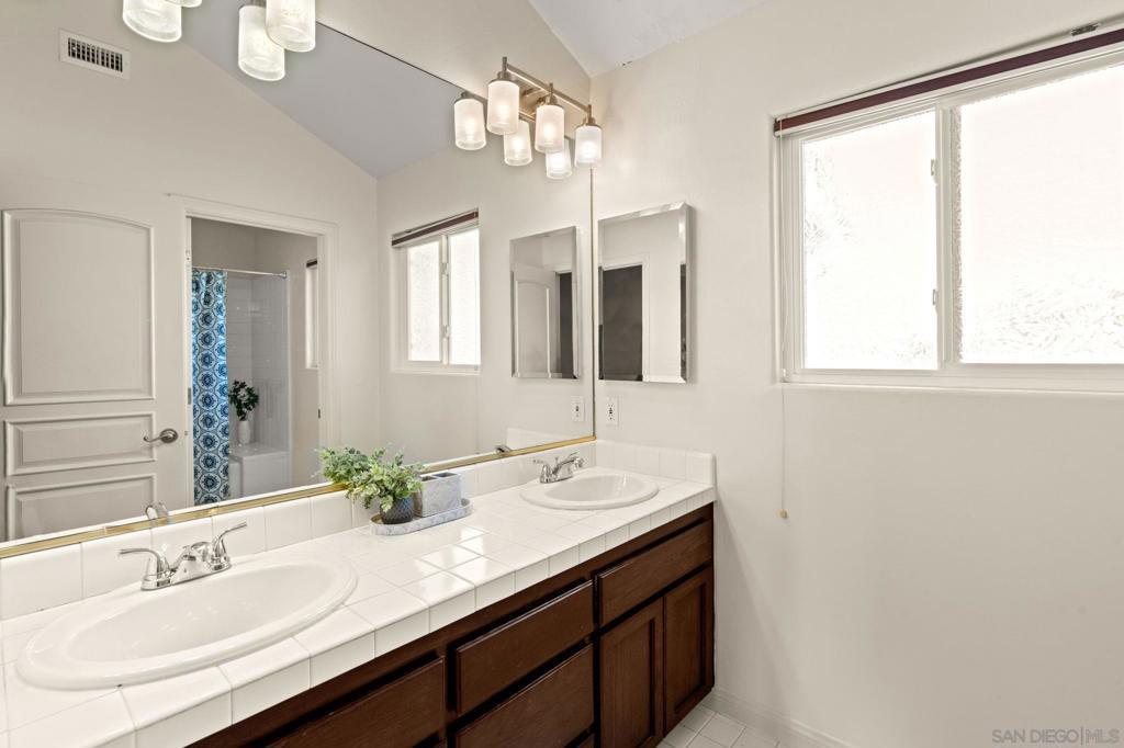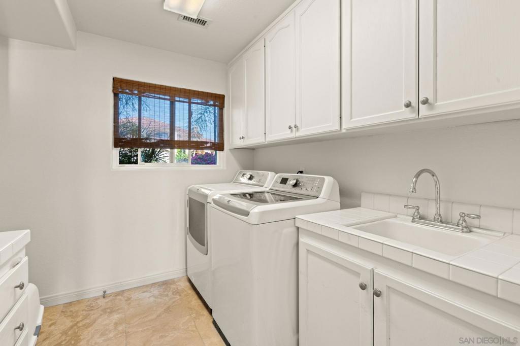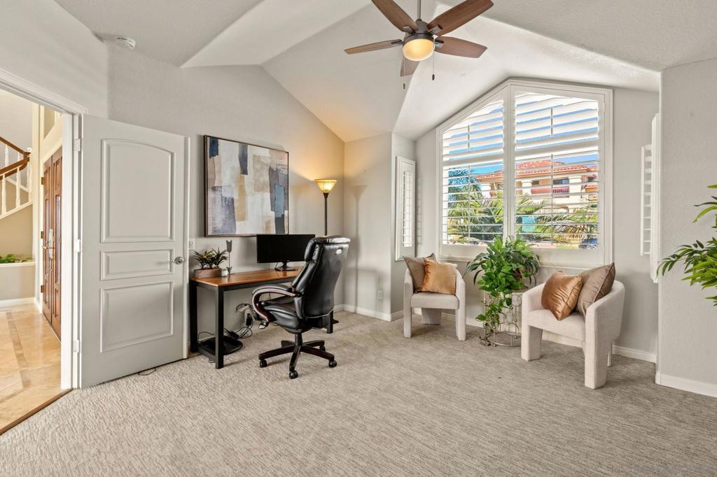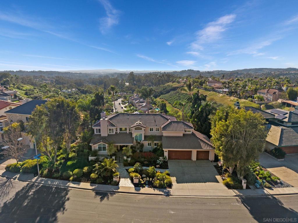 Custom Mediterranean bluff-top home in Scripps Ranch (South of Pomerado) offering 3,877 sq ft, 5 bedrooms, and 3.5 baths with sunset views and ocean glimpses on clear days. The main level features formal living and dining areas enhanced by architectural details, including columns, soaring ceilings, and curated lighting, creating expansive spaces ideal for both entertaining and everyday living. The chef’s kitchen is equipped with Dacor stainless steel appliances, quartz countertops, custom cabinetry, wine refrigerator, and warming drawer, and opens seamlessly to the family room; the true heart of the home; complete with fireplace, built-in shelving, soaring ceilings, and warm wood flooring. A main-level bedroom with full bath and direct backyard access provides flexibility for multigenerational living, guest suite, or home office. Upstairs, the primary suite retreat offers a private sanctuary with a fireplace, a sitting area, and a balcony for enjoying sunset views and glimpses of the ocean. Three additional generously sized bedrooms complete the upper level. The backyard is designed for entertaining and indoor-outdoor living, featuring a pool, spa, large deck, built-in BBQ, and dining patio, all set against a backdrop of spectacular elevated views. Recent upgrades include: new roof, two owned solar systems, Tesla EV charger, updated electrical panel, newer windows, central vacuum system, new water heater, and new carpet upstairs. Located minutes to I-15, shopping, dining, Scripps Ranch Community Park, and scenic trails, and served by top-rated schools. No HOA & Mello Ross!