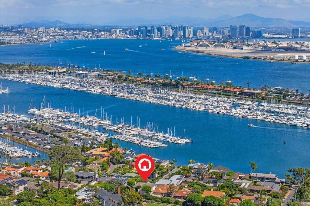 Located in the prestigious La Playa neighborhood of Point Loma, this wonderful home offers an opportunity to own in one of Point Loma's most coveted coastal enclaves. Set on an elevated lot, the home captures unobstructed, panoramic views of San Diego Bay, the downtown skyline, Coronado Island and the iconic Coronado Bridge—along with a dynamic, ever-changing backdrop of marina activity and sailboats on the water. This charming 4-bedroom, 2.5-bath home blends timeless character with thoughtful design. Remodeled in 1993 and lovingly maintained, it features an open floor plan filled with warmth and natural light. Highlights include two fireplaces, hardwood floors, elegant coffered ceilings, and extensive built-ins throughout. Expansive windows and both upper and lower view decks provide the perfect vantage points to soak in the stunning coastal scenery. An attached two-car garage offers convenient direct access, while a spacious 19x17 lower-level storage room provides exceptional flexibility for hobbies, storage, or future customization. With no neighbor on one side, the property enjoys added privacy and direct backyard access to Perry Street. Ideally located just moments from yacht clubs, the scenic Bessemer Trail, and Kellogg’s Beach, this home also benefits from a recorded view easement on two lower Perry Street properties—helping to preserve the remarkable vistas for years to come. Enjoy close proximity to Shelter Island, La Playa Village’s charming shops and restaurants, Liberty Station, and all that Point Loma has to offer. This is coastal living at its finest.
