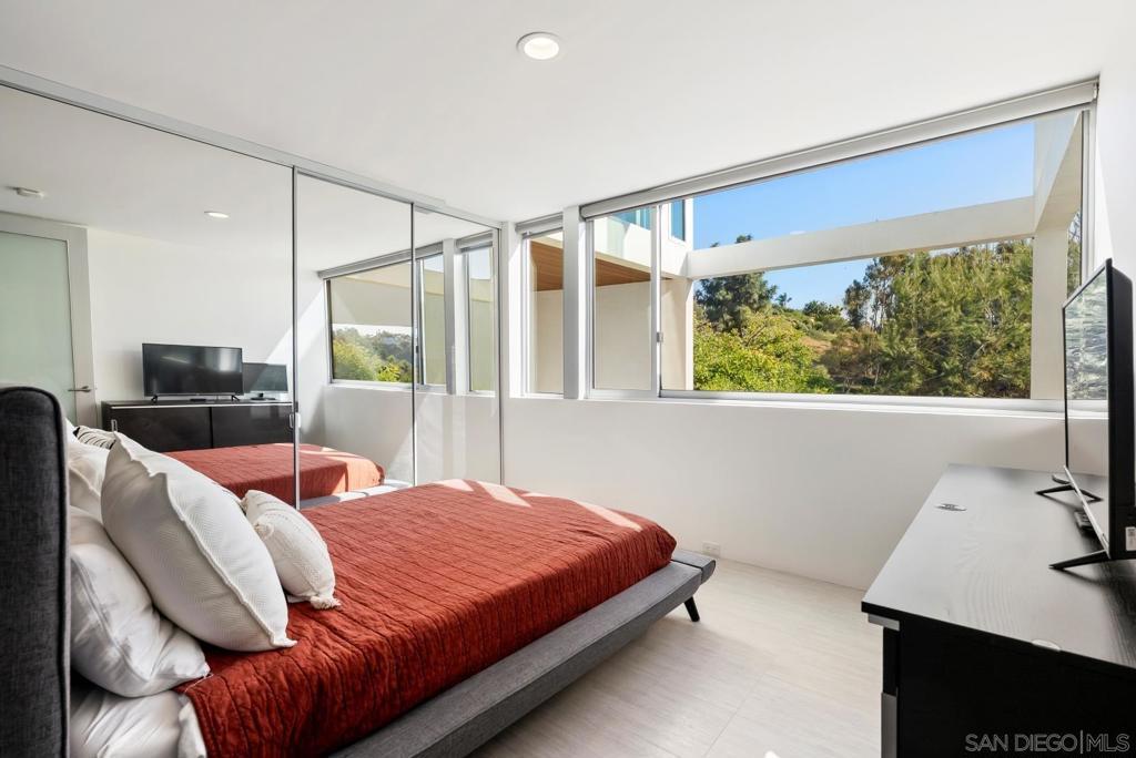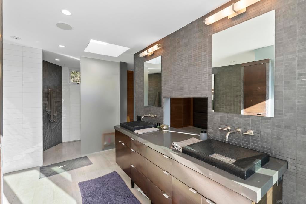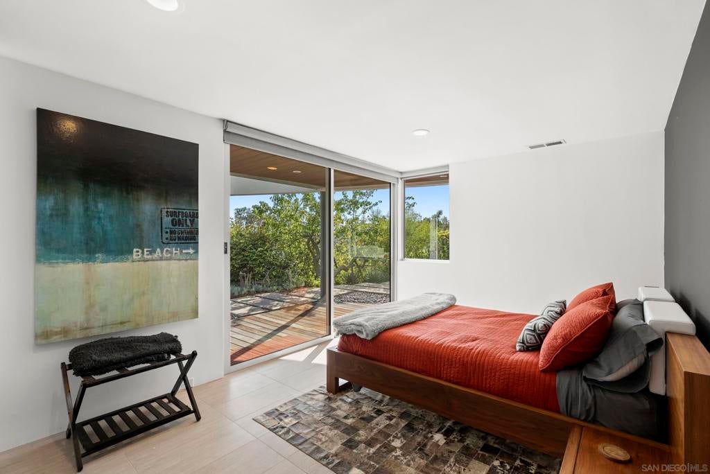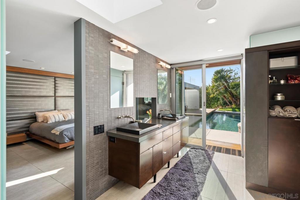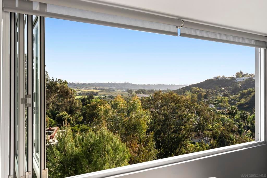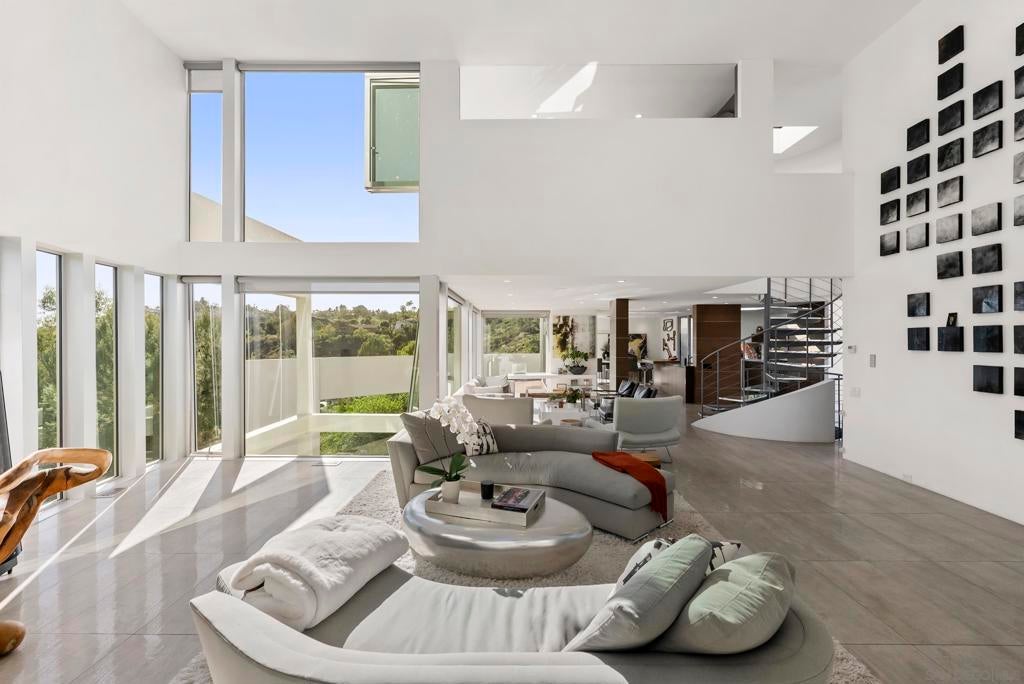This architecturally significant residence is positioned on over an acre of elevated, exceptionally private grounds in Del Mar, surrounded by mature landscape and natural beauty. Inside, a dramatic two-story living room framed by walls of glass and skylights captures expansive valley and hillside views, establishing an immediate connection between interior and exterior spaces. The floor plan unfolds with intention, enabling a natural flow between living areas that feel both open and grounded. The living experience spans multiple levels, each offering a distinct sense of space and perspective. The entry-level primary suite provides a quiet retreat with direct access to the outdoors. Below, three bedrooms and a secondary living area, anchored by a striking wine display, allow flexibility for guests, entertaining, or everyday living. At the top, a sculptural staircase leads to a private office with bath and access to a view deck overlooking the polo fields, easily adaptable as a fifth bedroom or creative workspace. Outside, the property transforms into a true retreat. A curved pool and spa anchor the grounds, surrounded by multiple lounge areas, an outdoor kitchen, and layered greenery that provide both privacy and atmosphere. From sunlit terraces to shaded gathering spaces, the setting is designed for both quiet moments and effortless entertaining. A home that lives like a private resort, where architecture, landscape, and light come together to create rare scale, privacy, and a sense of escape in one of Del Mar’s most sought-after rural settings.