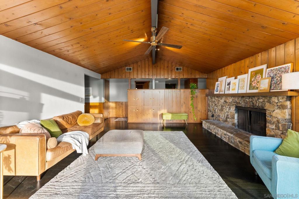 Mid-century modern hillside retreat with panoramic sunset and valley views. Extensively remodeled, this home blends timeless design with modern upgrades and seamless indoor-outdoor living. Vaulted wood plank ceilings and expansive glass bring in abundant natural light, while the living room’s stone fireplace opens to a wraparound deck—perfect for entertaining or enjoying San Diego sunsets. Designer kitchen with custom cabinetry, matte quartz countertops, brass hardware, statement backsplash, and premium KitchenAid appliances, including a concealed panel dishwasher. The primary suite features vaulted ceilings, engineered wood flooring, and direct deck access. Spacious bonus/flex room ideal for office, guests, or studio. Exterior highlights include Hardie siding, Milgard windows and doors, leased solar, drought-tolerant landscaping, fruit trees, and multiple outdoor living areas. Privately set in a natural setting yet just minutes from city amenities.