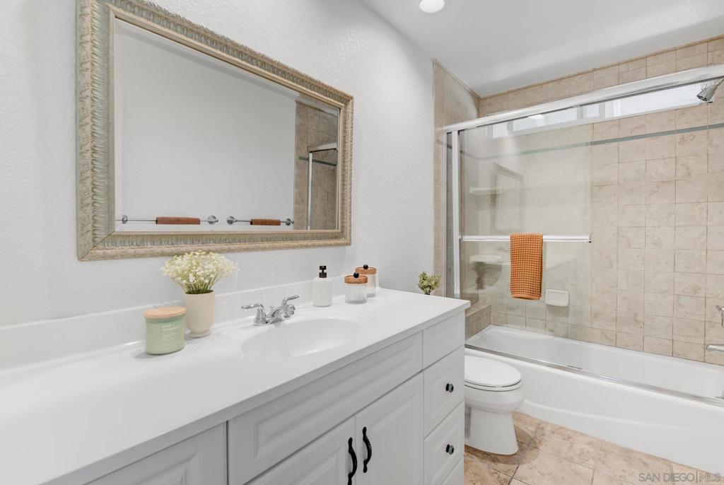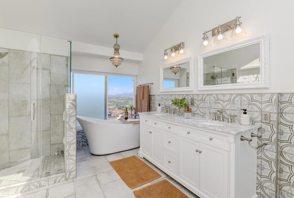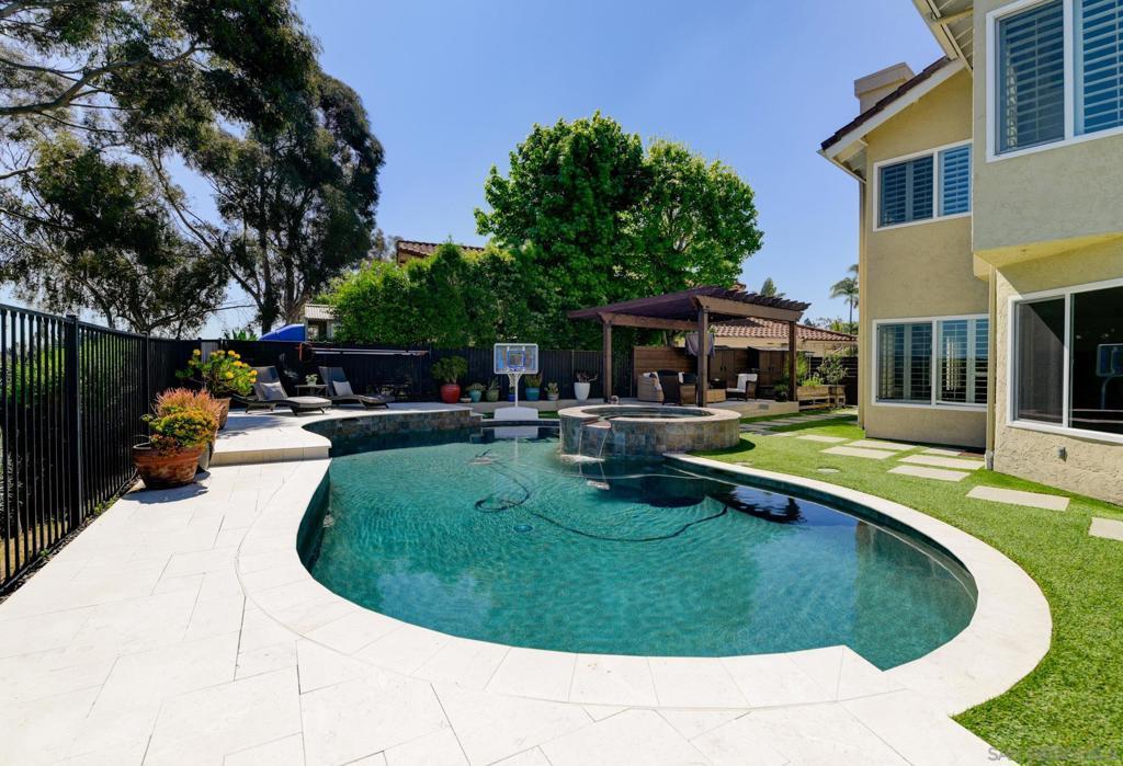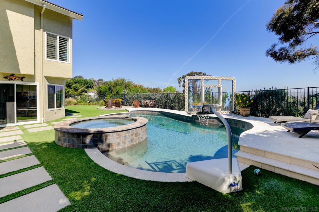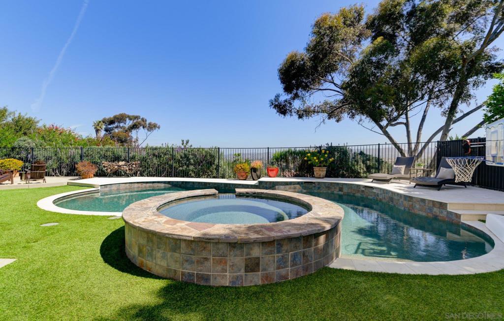 Striking hilltop location in the Terraces at Cantebria with panoramic hillside and mountain views, this beautifully upgraded home offers the perfect blend of comfort, style, and functionality. Thoughtfully renovated inside and out, the property features a newer roof, owned solar, fresh interior and exterior paint, and a fully reimagined outdoor setting with paver driveway and walkways, new landscaping, turf, irrigation, and landscape lighting. The backyard is a true retreat, complete with a stamped concrete patio, pergola, fire pit, putting green, planter beds, and a modern Pebble Tech pool and spa with river rock accents—ideal for entertaining. Located just a few minutes to the beach, this home is true California living at it's finest. Inside, the home is bright and inviting with gorgeous hardwood floors, designer paint, shutters, recessed lighting, dual pane windows and sliders, central air, and a whole house fan. The updated kitchen is complemented by upgraded appliances, while fireplaces in both the family room and primary suite add warmth and character. The recently renovated primary suite features a spa-like bathroom with soaking tub, custom shower, new dual vanity, all-new floor and wall tile, updated lighting and plumbing fixtures, and custom California Closets. Additional highlights include a One Water system, upgraded insulation, newer water heater, epoxy garage floors, and a spacious 3-car garage. Residents enjoy access to community pool, spa, and tennis courts, all just moments from shopping, dining, and everyday conveniences in the heart of Encinitas.