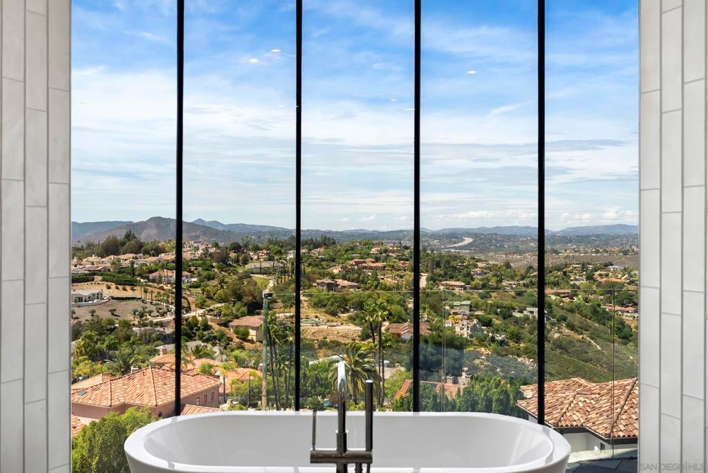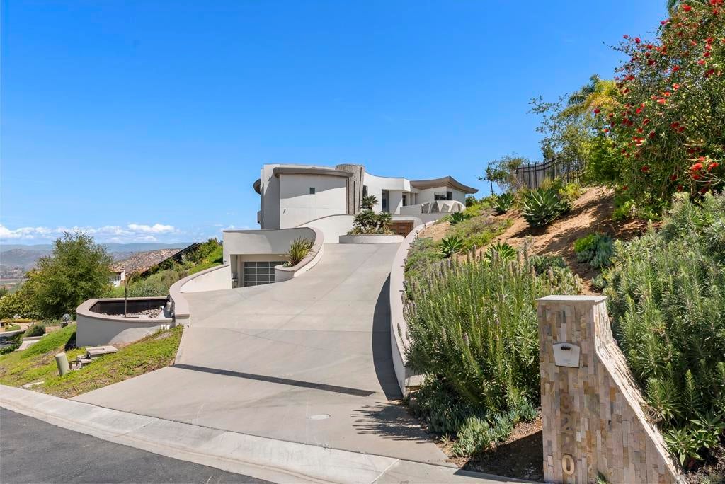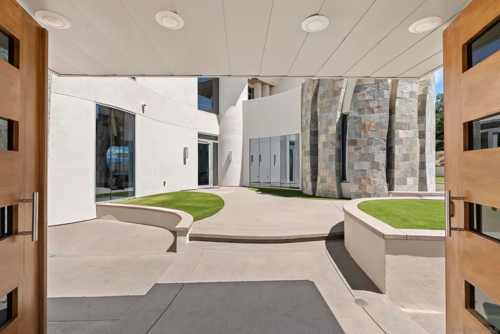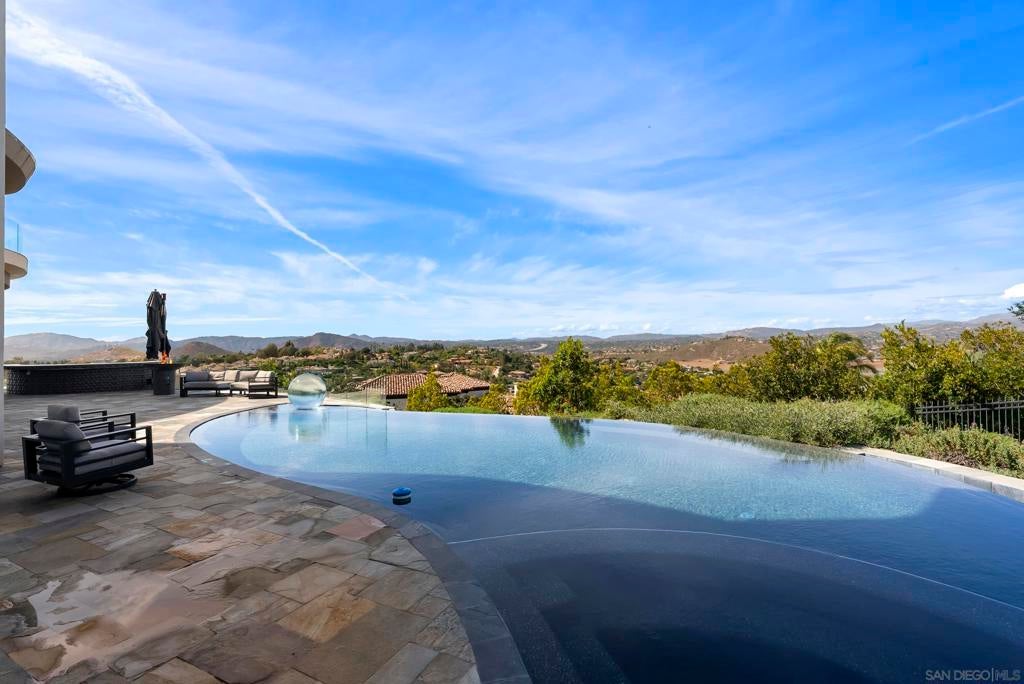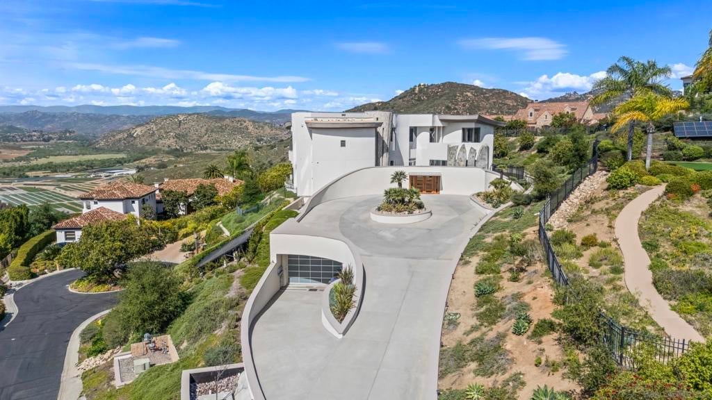 One of a kind resort like estate showcasing some of the most breathtaking views San Diego has to offer, this exceptional 11,080 square-foot home is gracefully set on a private one-acre lot. Designed as a true architectural masterpiece, the property offers unparalleled scale, elegance, and functionality—including an expansive garage accommodating approximately 20 vehicles. A grand driveway leads to a serene front courtyard, creating an immediate sense of privacy. Upon entry, walls of glass frame sweeping panoramic views in every direction, with each room thoughtfully designed to capture the home’s remarkable vantage point—perched as if atop of the world. The main level features an oversized living room and formal dining area, both highlighted by soaring ceilings and an abundance of natural light. The gourmet chef’s kitchen is impeccably appointed with premium stainless-steel appliances, large center island, and a spacious walk-in pantry. Adjacent to the kitchen, an inviting family room and informal dining area provide the perfect setting for everyday living. Completing the main floor are three generously sized ensuite bedrooms and private office. The upper-level primary retreat with truly unrivaled views creates a serene and luxurious escape. The primary suite boasts a spa-inspired bath with a striking freestanding soaking tub and expansive, custom-designed walk-in closets. The lower level is a haven for entertainment and leisure, featuring a car enthusiast’s dream garage, a state-of-the-art home theater, and a stylish bar. Outdoors, the estate continues to impress with a spectacular infinity-edge pool overlooking the surrounding landscape, a fully equipped outdoor kitchen, and multiple flat areas of turf for recreation and play. Fully owned solar enhances efficiency, completing this exceptional property.