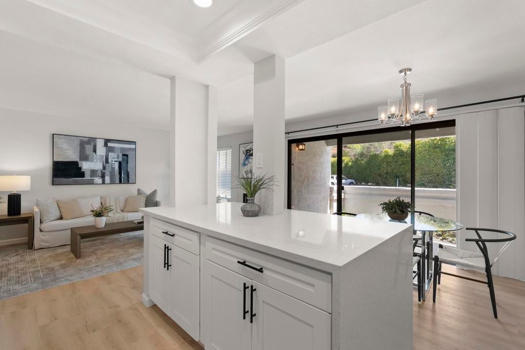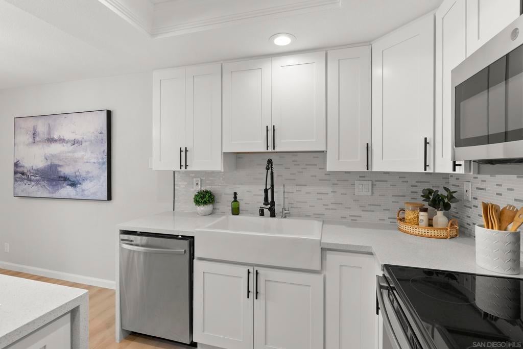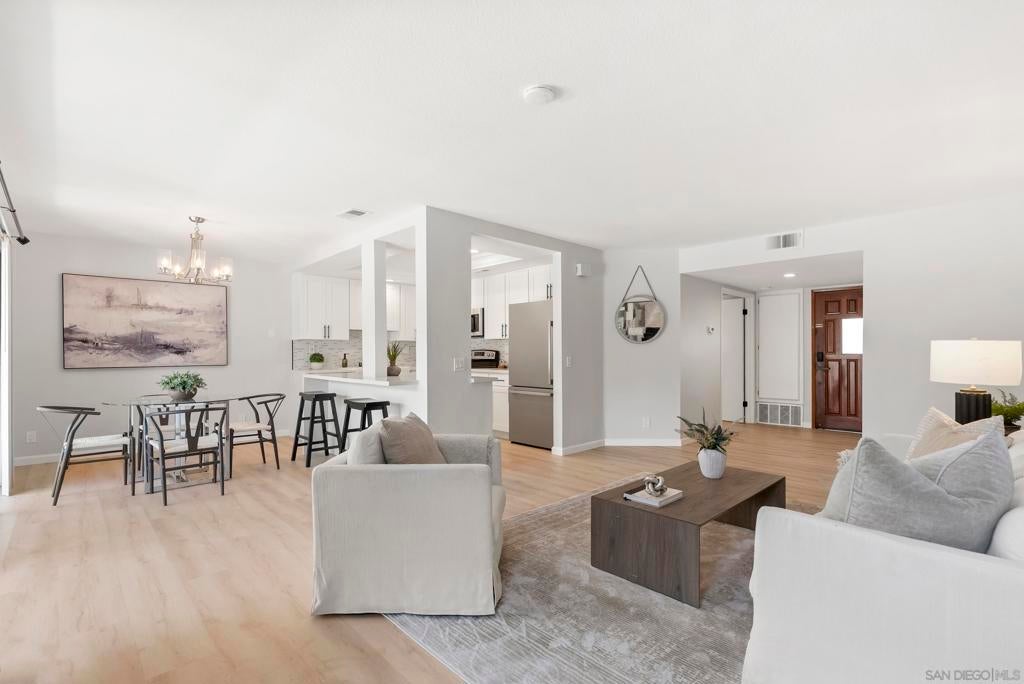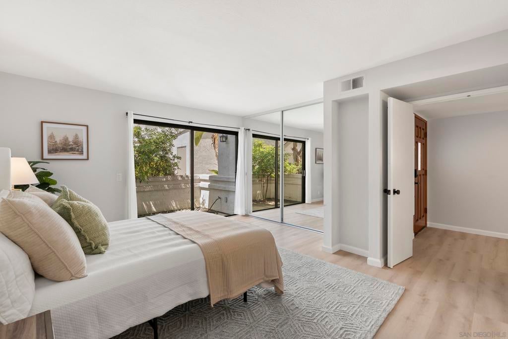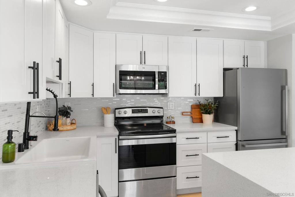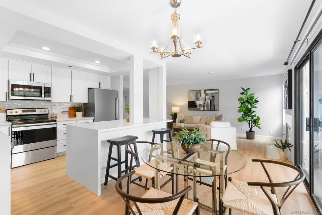 Welcome to Triple Crown - one of Solana Beach's most sought-after communities, tucked quietly west of the I-5. This fully remodeled condo sits in a quiet, private location overlooking a lush greenbelt, offering a peaceful retreat. Inside, you’ll find a fully remodeled kitchen featuring quartz countertops, updated cabinetry, and stainless-steel appliances, while a cozy gas fireplace anchors the living space - perfect for those cool coastal evenings. The spacious primary suite opens directly onto a private patio and includes an ensuite bathroom with a walk-in shower, all-new fixtures, and an updated vanity. A second private patio gives you even more outdoor space to breathe. Practical details are just as polished: stacked in-unit washer/dryer and a private detached one-car garage. Step outside and you're minutes from the Del Mar Racetrack, the Cedros Design District, boutique shops, and some of the best dining the North County coast has to offer. And just a 3 minute car ride or a 20-minute stroll to Dog Beach. Whether you're walking the shoreline or grabbing a table at a favorite local spot, this location puts it all within reach without sacrificing the quiet, tucked-away feel that makes Triple Crown so special.