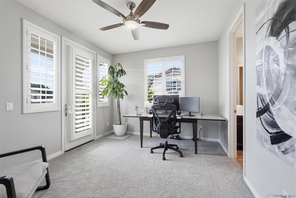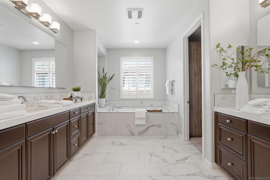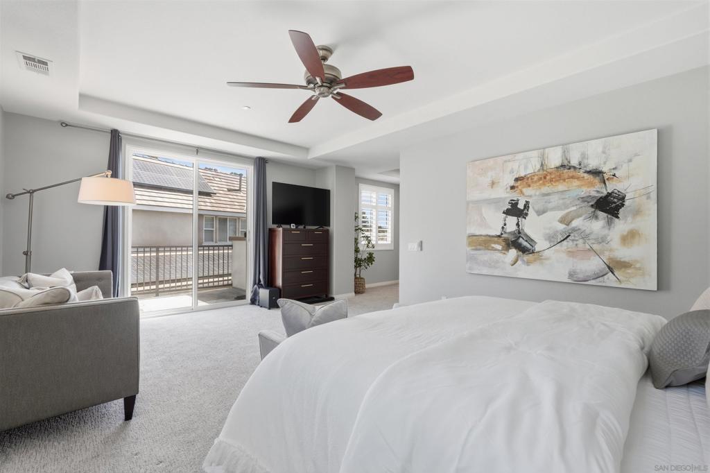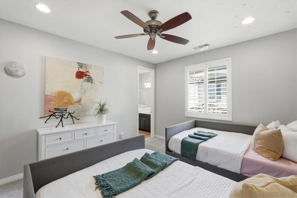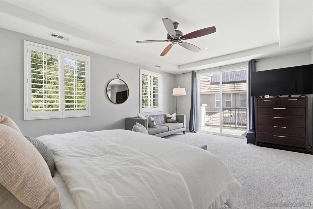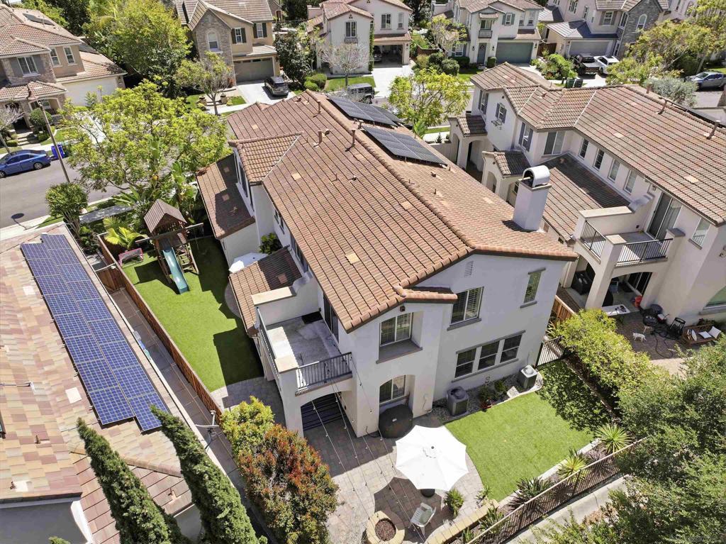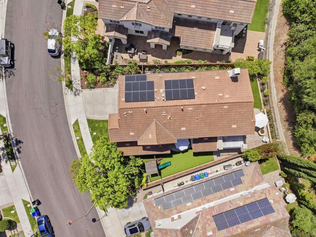 Situated on a serene tree-lined cul-de-sac in coveted La Costa Greens, this 5-bedroom, 4-bath home combines Casual Elegance with resort-style living. The open-concept floor plan features a beautifully remodeled kitchen with custom lighting, fine finishes and high-end appliances, flowing seamlessly into the luxurious light filled living and dining areas. The spacious primary suite includes a private balcony and spa-like en suite bath with an impressive walk-in closet boasting custom wood built-in cabinetry. Additional highlights include owned solar, upstairs laundry room, downstairs guest bed and bath, and a spacious low-maintenance turf backyard. Also enjoy access to The Presidio at La Costa Greens with pool, spa, fitness center, clubhouse, tennis, and pickleball courts. Just a short stroll to Alga Norte Aquatic Center/Sports park and Top-rated Poinsettia Elementary, and minutes from exclusive shopping, fine dining, and world-class beaches, this residence presents a rare opportunity to experience elevated North County living.