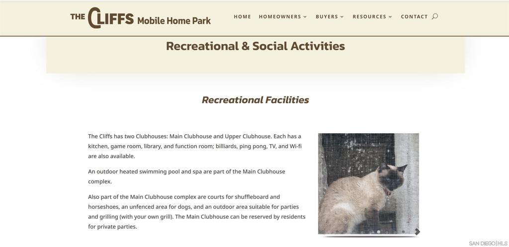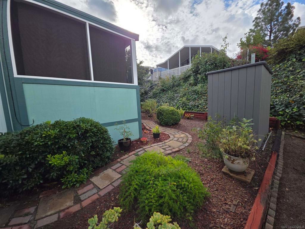 Manufactured home at The Cliffs: A 55+/21+ Community east of Mission Valley in Allied Garden. Enjoy comfort, convenience, and canyon views in this charming 1991 manufactured home located minutes from shops, restaurants, parks, and major highways. This move-in ready home features 2 bedrooms, 2 full baths, and a bonus private covered sunroom off the primary bedroom, great for plants, reading, or creating a cozy workspace. The living room, dining area, and hall have luxury vinyl plank flooring, and both bedrooms include soft carpet and remote-controlled ceiling fans. You’ll stay comfortable year-round with double-pane and bay windows, 2 mini split units system with heating and AC (1 in the living room and 1 in the primary bedroom), plus central heating throughout. The kitchen is bright and functional with a 5-burner gas stove, counter-depth stainless steel fridge, full-size dishwasher, and plenty of cabinet space. Vinyl flooring throughout and carpet in the 2 bedrooms. The indoor laundry room includes a full-size front-loading washer and gas dryer with extra storage. Step outside to a well-kept backyard filled with roses and greenery, along with two storage sheds for your tools and belongings. The 2 car tandem carport provides convenient parking, and guests parking are just around the corner. Tucked away in a quieter part of the community, away from the main clubhouse and pool, this home offers extra privacy while still giving you access to all The Cliffs amenities. The Cliffs has 2 Clubhouses: Main Clubhouse and Upper Clubhouse. Each has a kitchen, game room, library, and function room; billiards, ping pong, TV, and Wi-fi are also available. An outdoor heated swimming pool and spa are part of the Main Clubhouse complex. Also part of the Main Clubhouse complex are courts for shuffleboard and horseshoes, an unfenced area for dogs (25lbs or smaller), and an outdoor area suitable for parties and grilling (with your own grill). The Main Clubhouse can be reserved by residents for private parties. The Cliffs has a lending library of more than 2,000 books, audiobooks, DVD movies, puzzles, CDs, and even a few vinyl albums! The library collection is split between the Main and Upper Clubhouses. Space rent is $1721.48