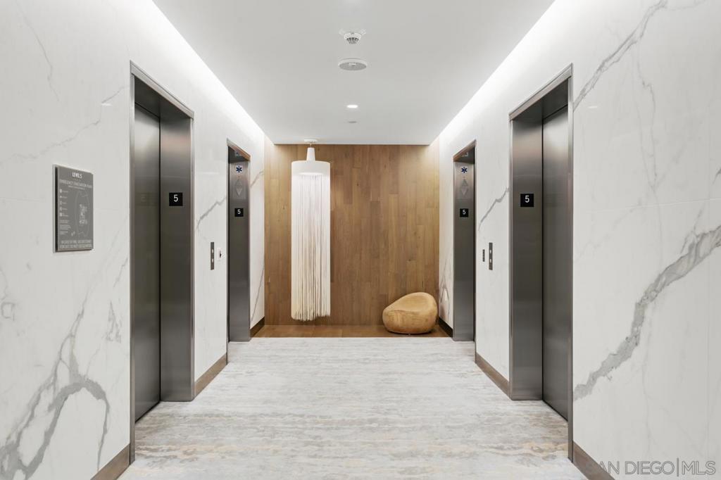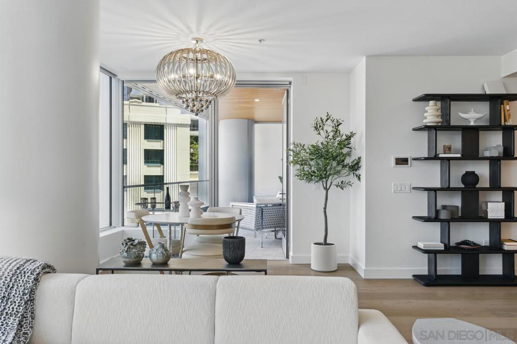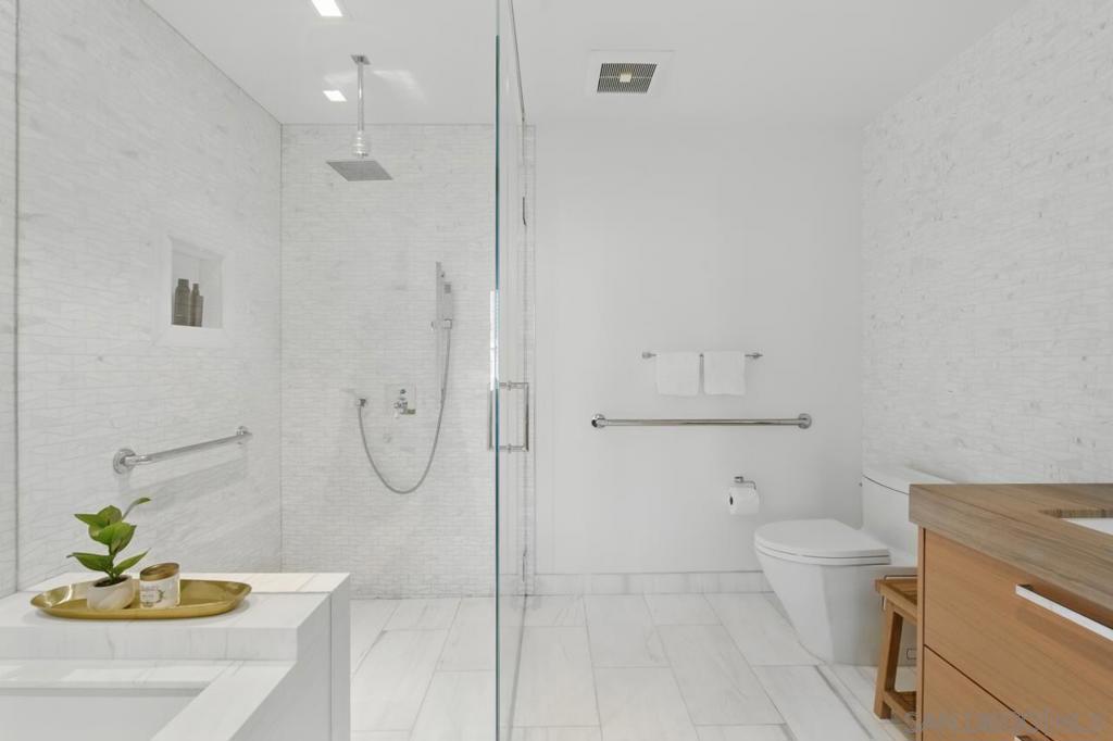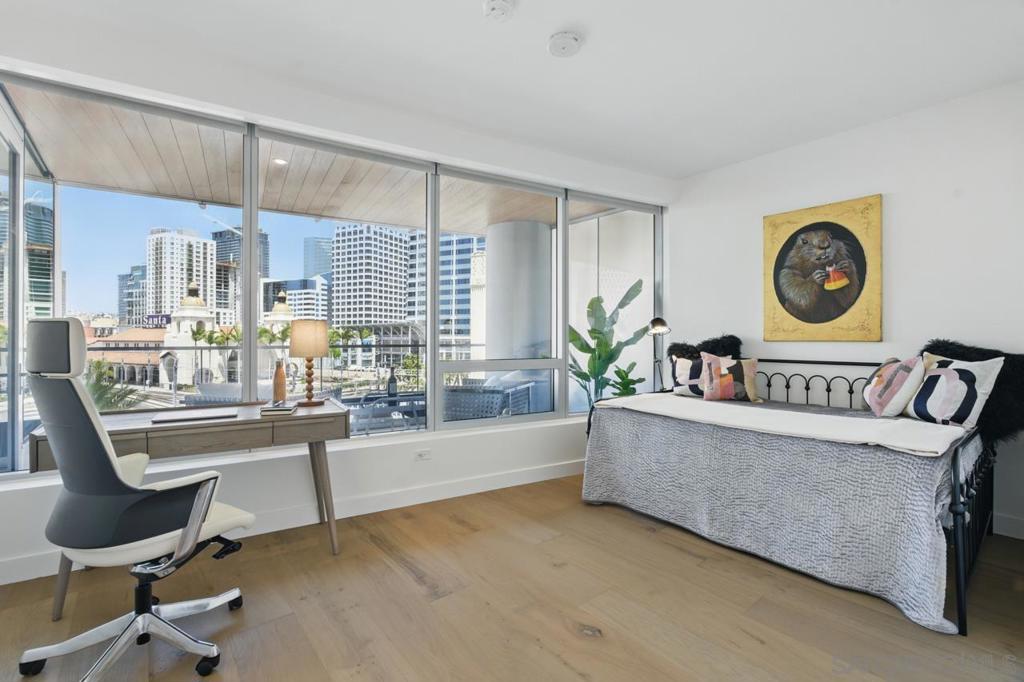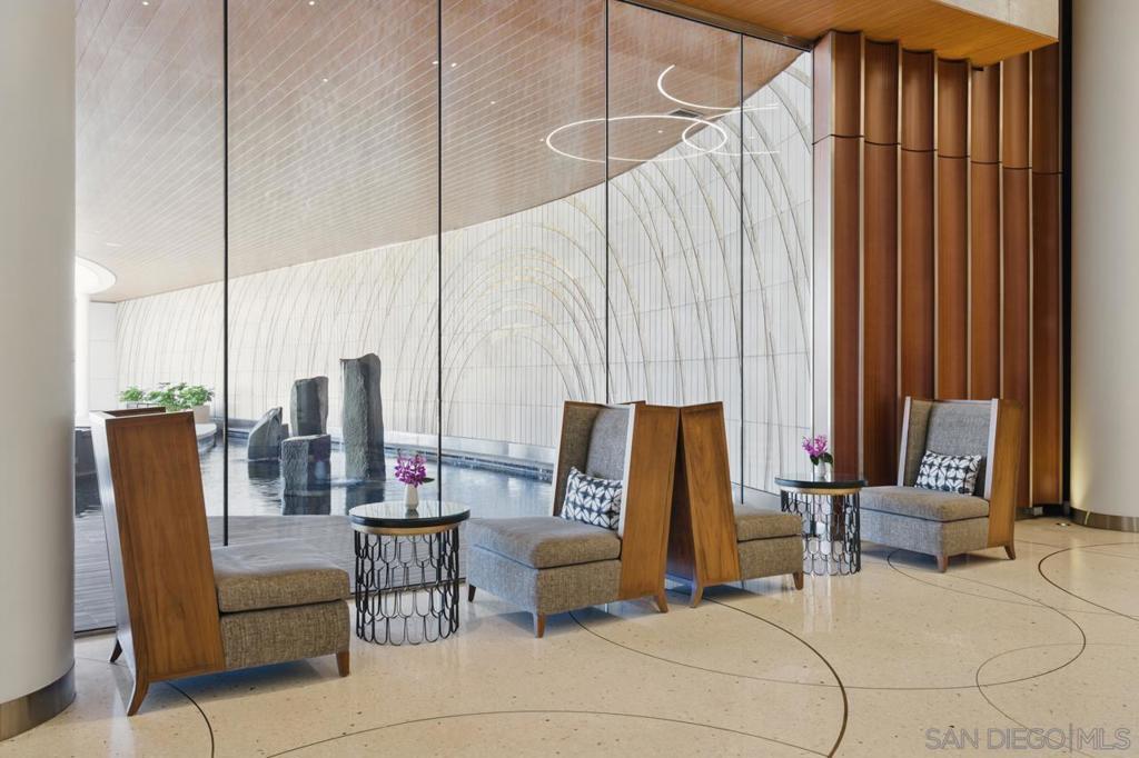 Turnkey and ready to enjoy day one! Designer furnishings included. Discover refined coastal living at the Super Prime building Pacific Gate, the crown jewel of San Diego’s skyline. This updated and unique residence is one of just 5 units on the 5th floor and has a layout and placement equivalent to an ‘06 unit and is just one floor above the amenity deck for ultimate convenience. This home features designer lighting and an audio visual system with premium surround sound, floor-to-ceiling windows with automatic shades, high end Wolf and Sub-Zero appliances, motorized upper cabinets made of walnut, luxury hardwood flooring, marble tile, and more. The spacious primary suite offers sunny tree top views and is joined by a spa-inspired bathroom featuring heated floors, a walk-in shower, soaking tub, dual vanities, and an LED mirror with integrated TV. Attached is a custom walk-in closet offering elevated storage. The second bedroom makes a fantastic office or cozy guest quarters. A generously sized and covered (shaded) private outdoor area extends directly from the main living space. This home also includes fantastic underground parking. The unit has two premium ADA accessible corner parking spaces (not tandem!) and two! private storage lockers all located on P1. Residents at Pacific Gate enjoy unparalleled amenities: 24-hour concierge service, a 45-foot yacht share, luxury car fleet, movie lounge, business center, doggy station, bike room, residents’ lounge with catering kitchen, a fully equipped fitness center featuring a sauna and steam room, and a resort-style pool terrace with cabanas and grilling stations just one floor below. Next door to some of San Diego’s best waterfront restaurants and cultural destinations. It’s the ultimate living and travel hub location.