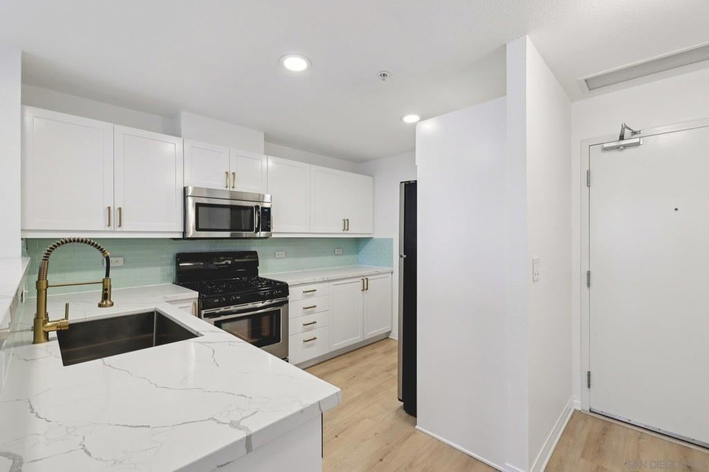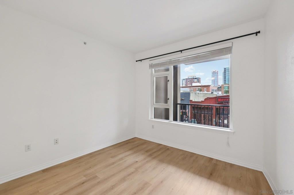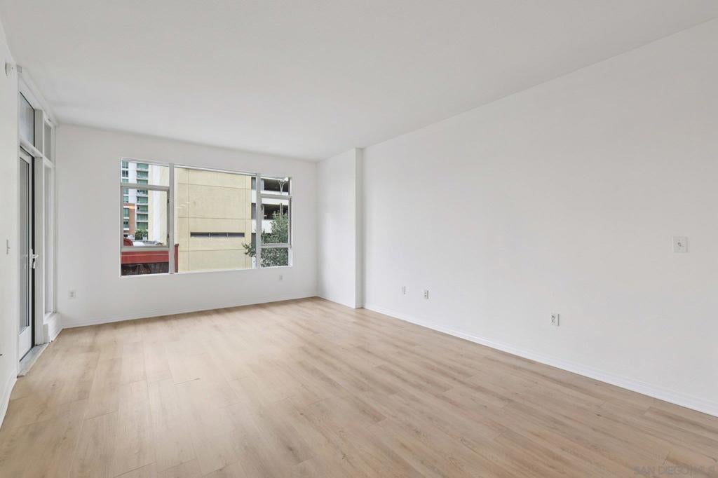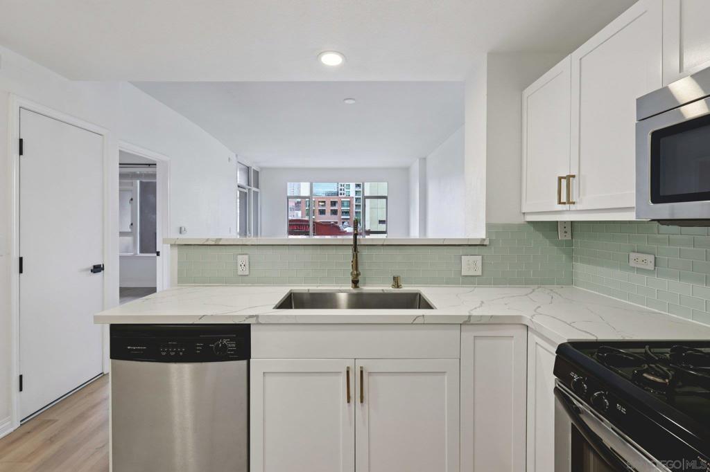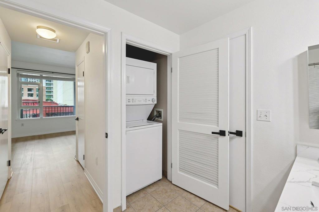 Light and bright, this spacious one-bedroom condo at Trellis on 5th offers the ultimate downtown lifestyle. The sleek, modern interior features a neutral color palette, open floor plan, and large picture windows that fill the space with natural light. The updated kitchen boasts quartz countertops, a glass tile backsplash, breakfast bar seating, and stainless steel appliances—perfect for entertaining. The bedroom accommodates a king-size bed and includes ample closet space, and a large updated bathroom with dual access. Additional highlights include in-unit laundry and one secure parking space. Residents enjoy resort-style amenities such as a 24-hour fitness center, BBQ courtyard, parcel lockers, and nightly on-site security. Ideally located in the East Village/Gaslamp district, you’ll have easy access to restaurants, cafés, nightlife, Petco Park, the Rady Shell, and scenic harbor walks—perfect for those seeking a vibrant urban lifestyle or a stylish pied-à-terre.