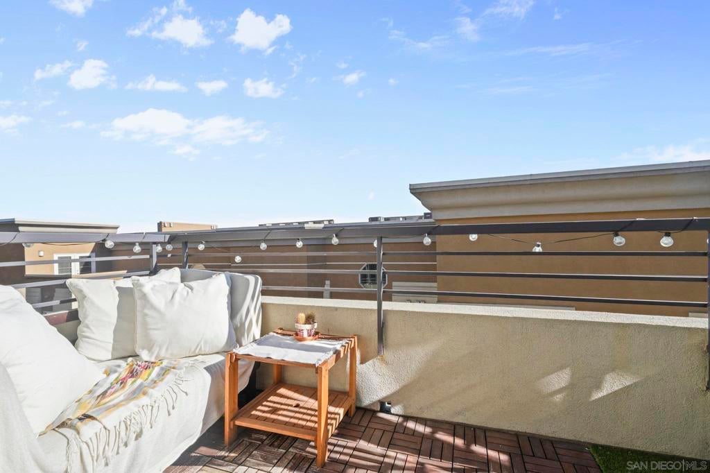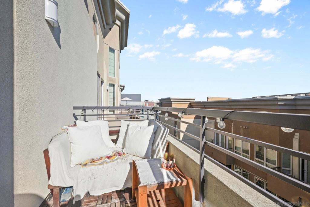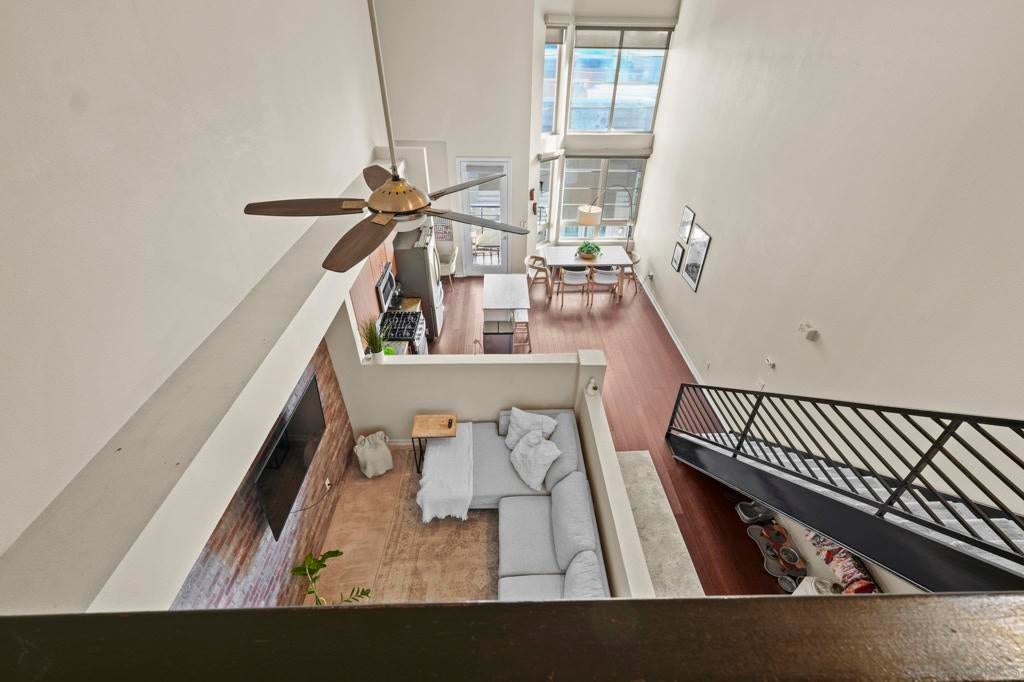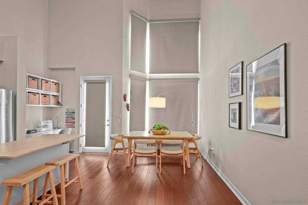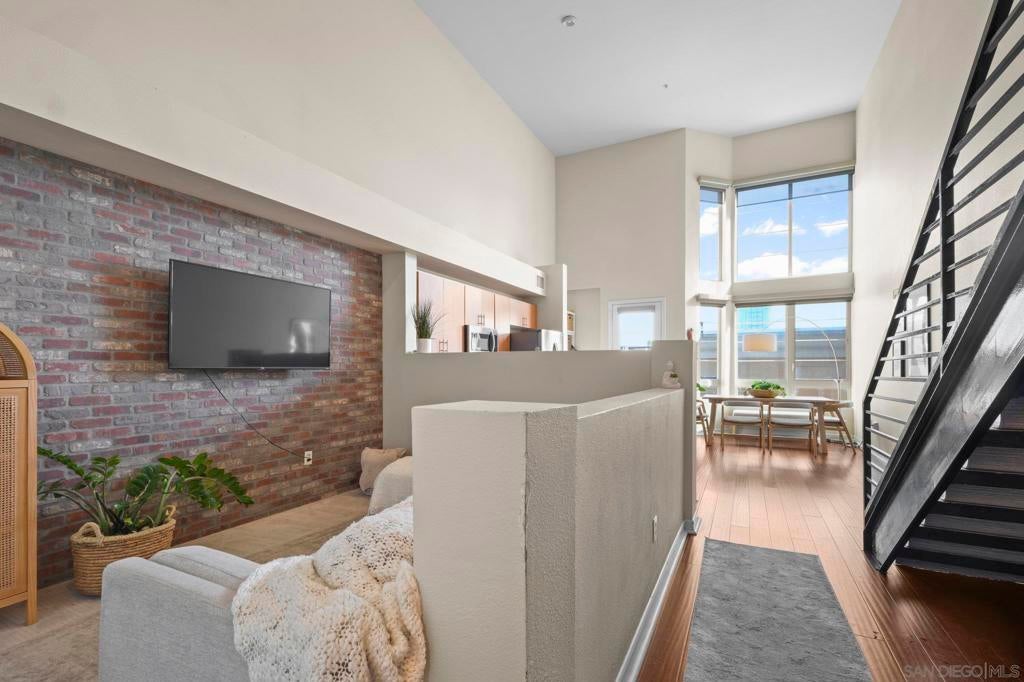 Rare top-floor loft in East Village. Two-story condo features soaring ceilings, dramatic floor-to-ceiling windows, and abundant natural light throughout. The open layout offers urban character with a brick accent wall, engineered hardwood floors, and a spacious kitchen with granite countertops and a gas range. Enjoy skyline views from your balcony, plus upgraded motorized shades with both light-filtering and blackout options. This is a true loft. Ideal for buyers seeking volume, light, and something beyond the typical downtown condo. In-unit washer and dryer, storage cage in garage, and turnkey ready to move in. Union Square offers resort-style amenities: a gym, hot tub, sauna, community room, and electric car charging. Ideally located adjacent to City College, restaurants, local breweries, and Petco Park. Easy freeway access (5, 94, 163). With major redevelopment underway in East Village, now is the time to buy. VA approved and ready for its next owner - come live the loft life today!
