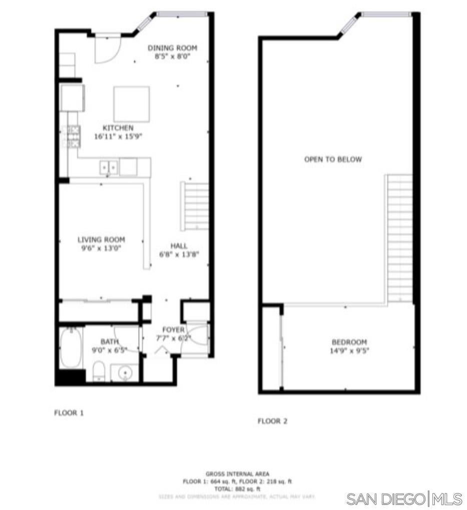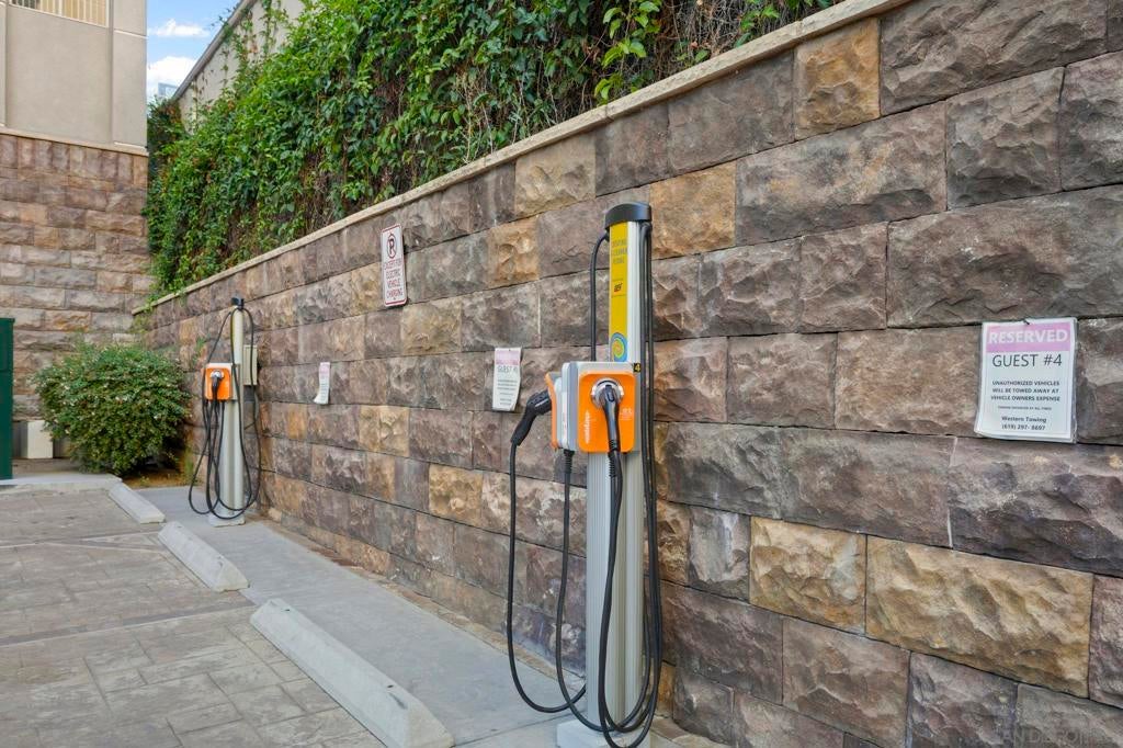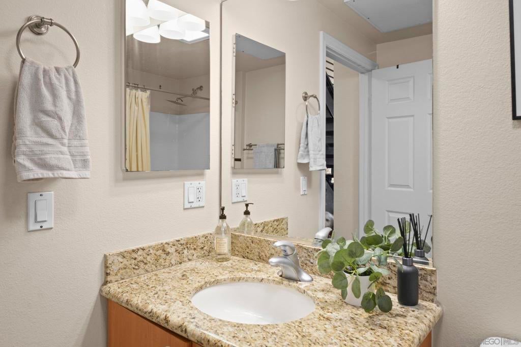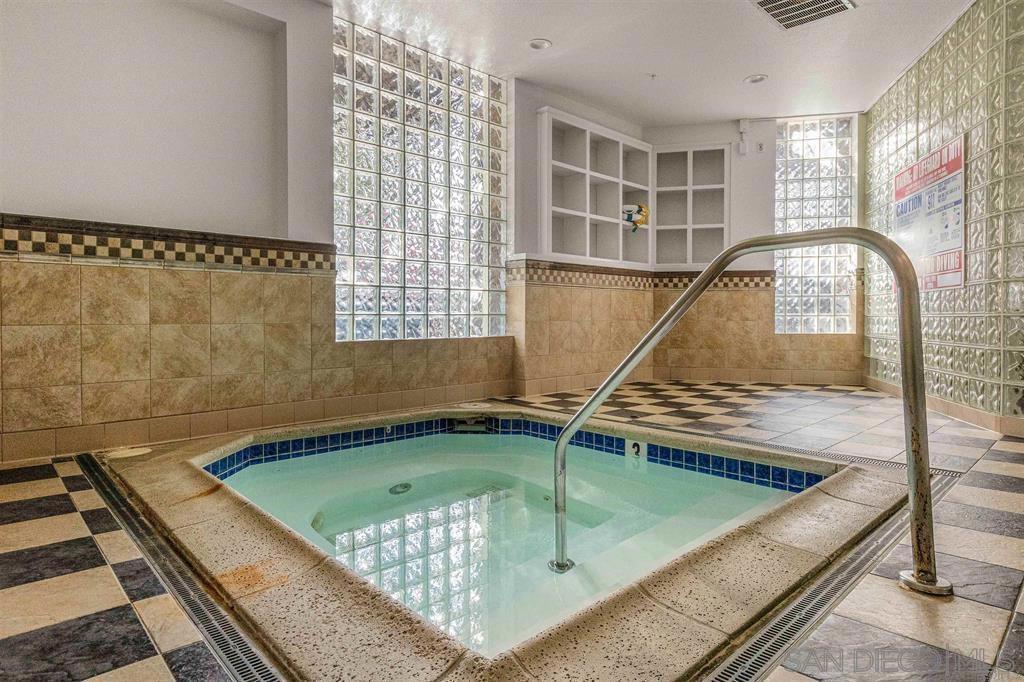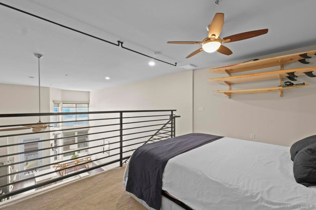 Rare top-floor loft in East Village. Two-story condo features soaring ceilings, dramatic floor-to-ceiling windows, and abundant natural light throughout. The open layout offers urban character with a brick accent wall, engineered hardwood floors, and a spacious kitchen with granite countertops and a gas range. Enjoy skyline views from your balcony, plus upgraded motorized shades with both light-filtering and blackout options. This is a true loft. Ideal for buyers seeking volume, light, and something beyond the typical downtown condo. In-unit washer and dryer, storage cage in garage, and turnkey ready to move in. Union Square offers resort-style amenities: a gym, hot tub, sauna, community room, and electric car charging. Ideally located adjacent to City College, restaurants, local breweries, and Petco Park. Easy freeway access (5, 94, 163). With major redevelopment underway in East Village, now is the time to buy. VA approved and ready for its next owner - come live the loft life today!