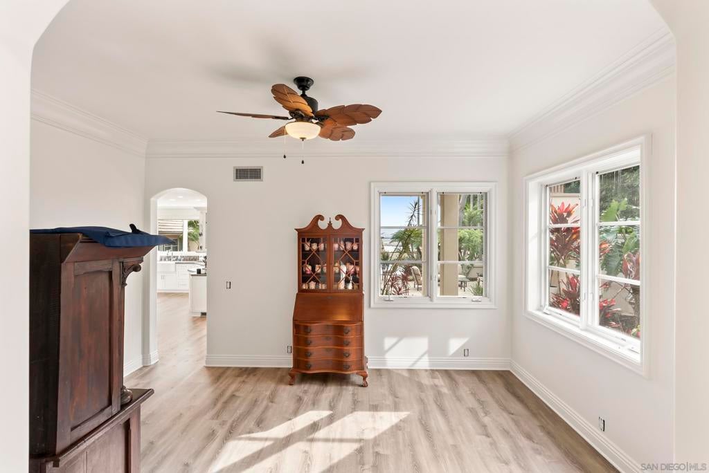 Now offered at $6,198,000, representing exceptional value in the coveted La Playa & Wooded Area. Elevated on a prestigious, quiet street, this bespoke residence sits on a rare ½-acre lot capturing sweeping panoramic views of Coronado, San Diego Bay, and the downtown skyline. The home is designed for entertaining, featuring a dramatic double-height living room, curved staircase, and a modern chef’s kitchen with custom quartz countertops. The resort-style grounds are exceptional, terracing down the oversized backyard to reveal a complete resort experience: an outdoor BBQ & Bar, waterfall pool & spa, fire features, putting green, and a sport court (pickleball ready). Multiple lounge areas overlook these amenities, creating the ultimate private retreat. The property includes a detached ~700 SqFt 2-bedroom guest house (ideal ADU, office, or gym combination), a 3-car garage with Tesla charging, and solar. Two gated entrances ensure privacy and ample parking. The oversized primary suite features a fireplace, expansive bathroom, and stunning views. A must-see value for the neighborhood.