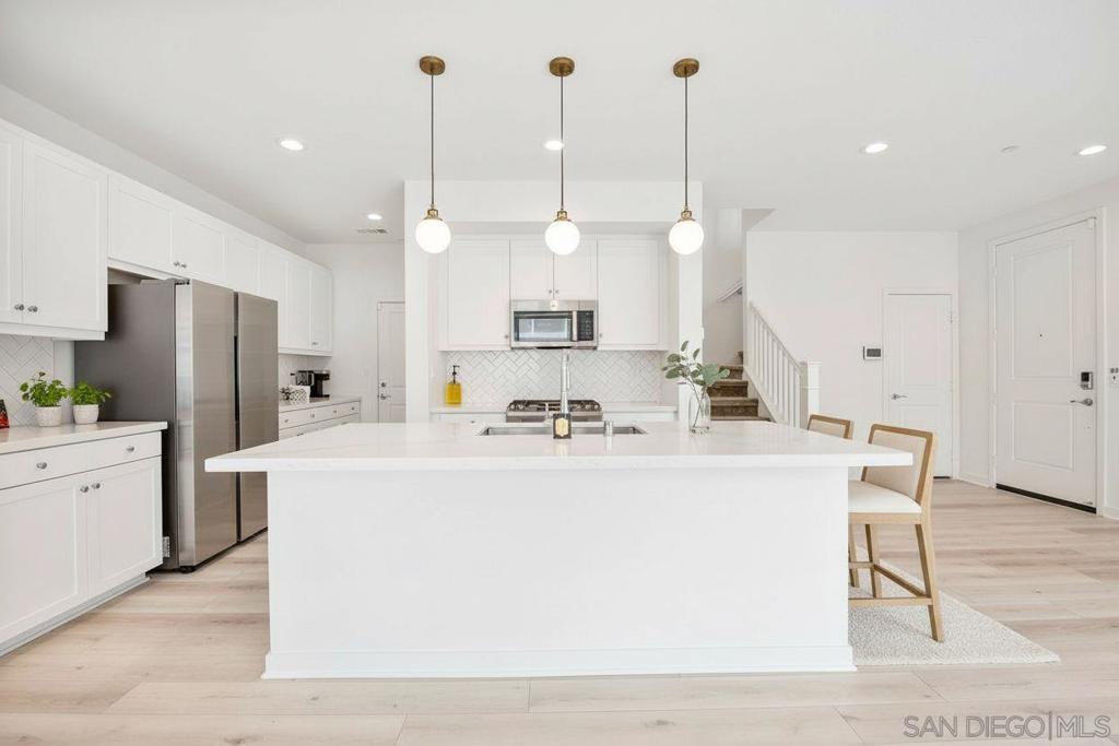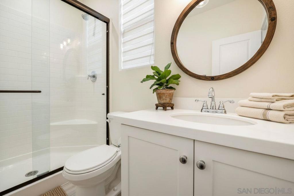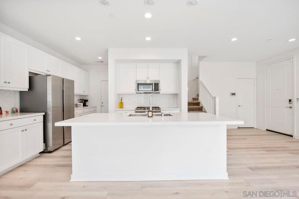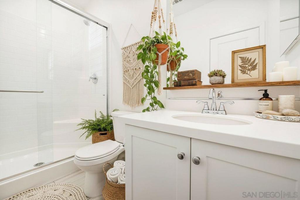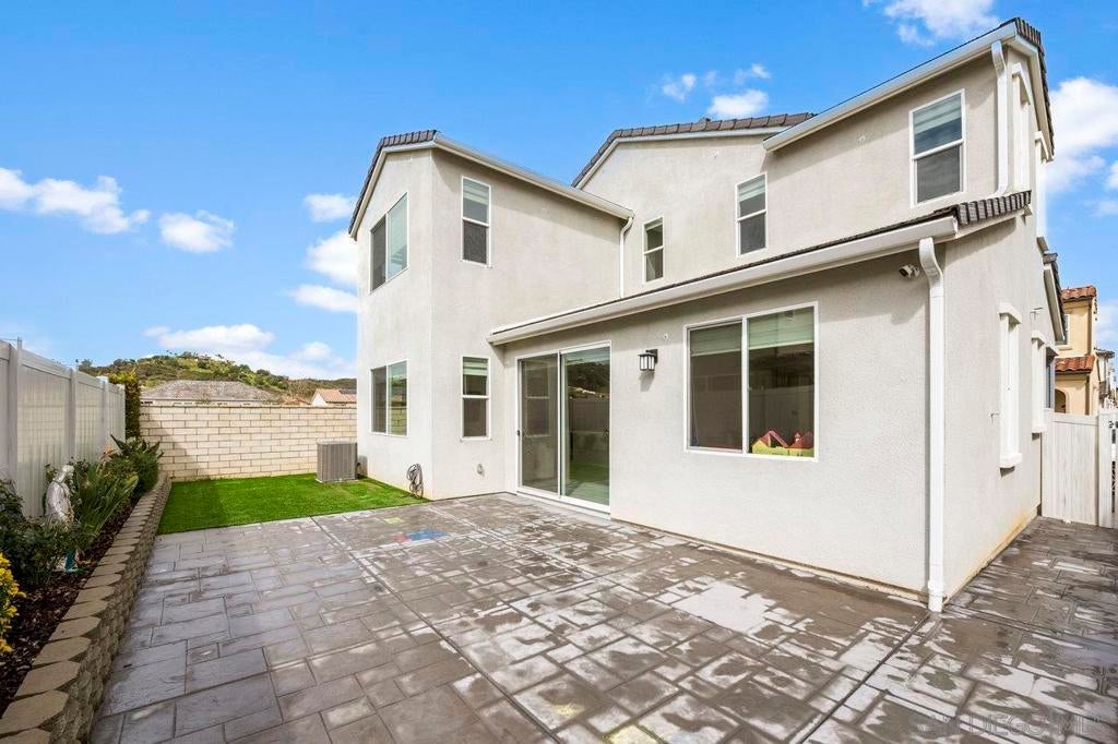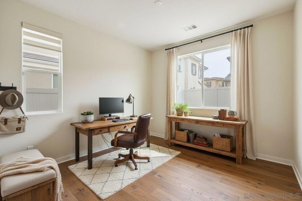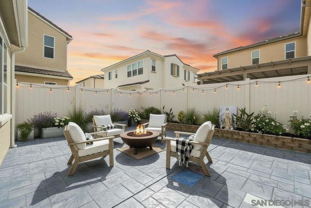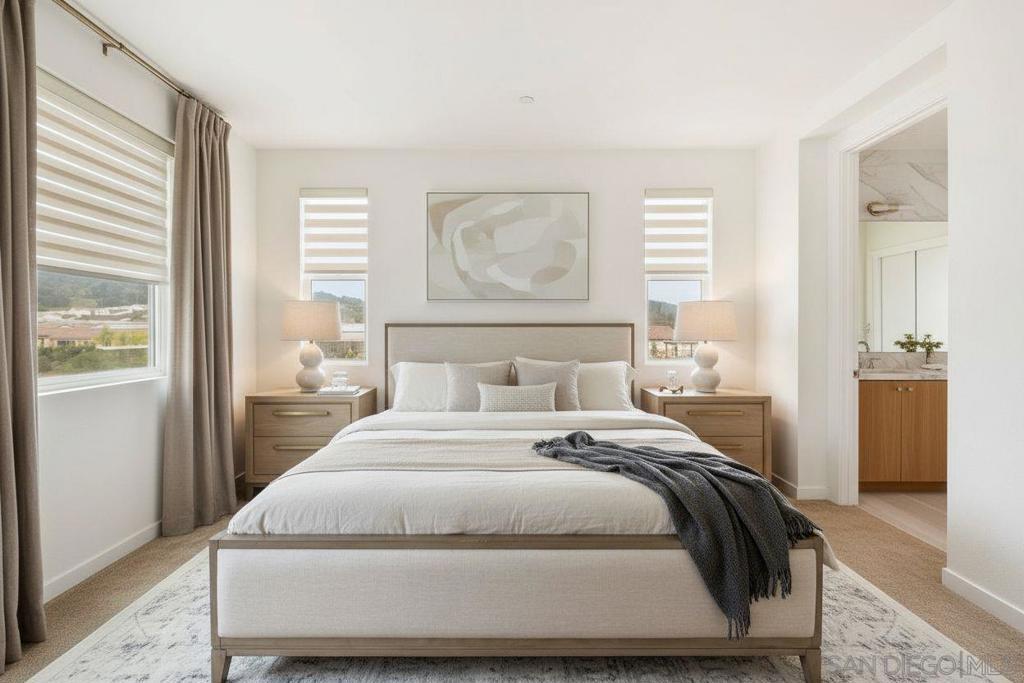 Very rare floorplan with 4th bedroom and full bathroom DOWNSTAIRS! Also, end of street lot is VERY rare...this allows you to park up to two cars in your driveway (only end lots have this option). This impressive home boasts a generous 2,046 square feet of living space on a substantial lot of 2,983 sq ft. The property offers four bedrooms and three bathrooms, providing ample space for comfort and convenience. The layout includes a bedroom and full bathroom on the first floor. Perfectly positioned at the end of a motor court and adjacent to open greenbelt space, this home provides extra privacy and stunning mountain views that can be enjoyed all year round. Convenience is key with driveway parking available for guests. This home is equipped with modern amenities including a tankless water heater, energy-efficient lighting and appliances, complete HVAC system, (10) Solar Panels (PAID OFF) - all designed to enhance your living experience while promoting sustainability. Kitchen enthusiasts will appreciate the stainless GE appliances, upgraded fixtures throughout the house, shaker cabinetry, custom marble countertops with 4” backsplash throughout. New plank vinyl flooring enhances the overall aesthetic appeal of this residence. Lighting plays an integral role in setting the mood for any room; hence recessed lighting has been installed throughout the house. Additional features include custom mesh shades ($19K), an oversized walk-in pantry and walk-in closet in the primary bedroom offering plenty of storage options. UN-STAGED PHOTOS ARE SHOWN WITHIN THE PICTURES ATTACHED & TAGGED. Over $30k has been invested in backyard upgrades: turf installation, planter additions & pavers – perfect for outdoor entertaining. The garage is finished making it suitable for various uses such as a workshop or additional storage area. Located within Park Circle community, residents have access to two pool/spas, BBQ facilities, outdoor patio/lounge areas and a clubhouse. Fitness enthusiasts will enjoy the fitness center, multiple parks & trails along with pickleball courts and basketball courts located nearby. For pet owners there's also a dog park within easy reach. The I-15 Freeway is just 15 minutes away, ensuring easy commutes. The Park City Commons retail and dining establishments are within walking distance of this home, offering a plethora of options for shopping and dining. Valley Center in California is a vibrant community with a variety of amenities to cater to diverse interests. From shopping centers, restaurants, parks, and recreational facilities, everything you need is at your fingertips. Experience the best of Valley Center living at 27748 Heritage Ln - a place where comfort meets convenience in an extraordinary setting!