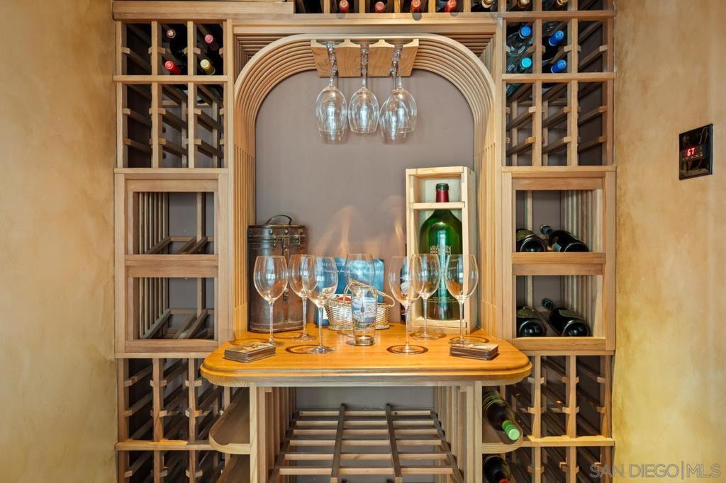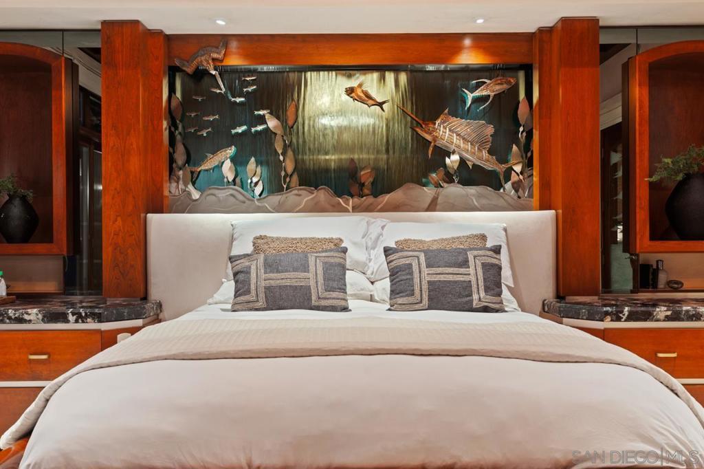 Perfectly positioned on a coveted end-cap lot within Mariner’s Point, one of San Diego’s most tranquil and sought-after stretches of bayfront, this residence offers a rare balance of architectural artistry and effortless livability. Thoughtfully designed with intention, the home features hand-finished African Babinga and Hawaiian Koa cabinetry, solid cherry doors, bespoke stonework, and deep-edge wraparound granite countertops. Oversized bay-facing windows and custom etched-glass doors frame soft morning light and water views, while a striking 500-gallon saltwater aquarium serves as a living art centerpiece.Refined interior upgrades include a climate-controlled wine room, coffered ceilings, and a chef’s kitchen equipped with a 60” Viking range, dual ovens, espresso system, and wet bar. Smart-home integration includes Crestron A/V, Vantage lighting, and Paradigm sound. An approximately 817 sq ft garage with built-in cabinetry, capacity for up to four vehicles, two oversized steel roll-up doors, and two additional dedicated parking spaces provides exceptional functionality for bayfront living. The primary suite opens to a private deck with sweeping bay views and offers a cedar-lined walk-in closet and spa-inspired bath with dual steam shower and deep jetted soaking tub. Outdoors, the private yard sits immediately adjacent to the sand and features an alfresco kitchen, tranquil water features, integrated lighting, and natural-gas tiki torches. Evenings are highlighted by shimmering moonlit reflections and nightly fireworks across the bay, truly a resort-like waterfront setting! This custom bayfront residence was thoughtfully rebuilt in 2006 with an uncompromising focus on craftsmanship, materials, and livability. Situated on a coveted end-cap lot along Mariner’s Point, the home enjoys a rare combination of privacy, calm water frontage, and immediate proximity to the sand within one of Mission Bay’s most desirable enclaves. Interior spaces are defined by extensive custom millwork and hand-selected materials, including African Babinga and Hawaiian Koa wood cabinetry, solid cherry interior doors, bespoke stonework, and sculpted deep-edge wraparound granite countertops. Oversized bay-facing windows and custom etched-glass doors were intentionally designed to capture natural light and frame water views throughout the day. At the center of the home, a 500-gallon custom saltwater aquarium constructed with museum-grade glass serves as a striking architectural focal point and living art installation. Additional interior features include coffered ceilings, a climate-controlled wine room integrated into the dining area, and a built-in buffet with warming drawer and custom Carillon dining suite accented by rosewood inlay. The chef’s kitchen is equipped with a professional Viking appliance suite, including an approximately 60” range with dual ovens, dual Fisher & Paykel drawer dishwashers, built-in espresso system, sunken wet bar area, and THG (France) polished-nickel fixtures—designed for both performance and entertaining. Smart-home and comfort features include Crestron A/V integration, Vantage programmable lighting, whole-home audio with Paradigm speakers, CAT5 wiring, ADT security, and a three-zone HVAC system with ongoing service. The primary suite offers sweeping bay views and opens to a private deck overlooking the water. The spa-inspired bath features a Starphire-glass dual steam shower, deep jetted soaking tub oriented toward the bay, and a cedar-lined walk-in closet with concealed storage and safes. Upper-level spaces include a custom billiard lounge and dual office areas with Hawaiian Koa cabinetry, offering flexibility for work, recreation, or retreat. Outdoor living is designed as a seamless extension of the home, with a built-in alfresco kitchen featuring BBQ, sink, refrigerator, and kegerator, complemented by tranquil water features, integrated landscape lighting, and natural-gas tiki torches. The yard sits immediately adjac...