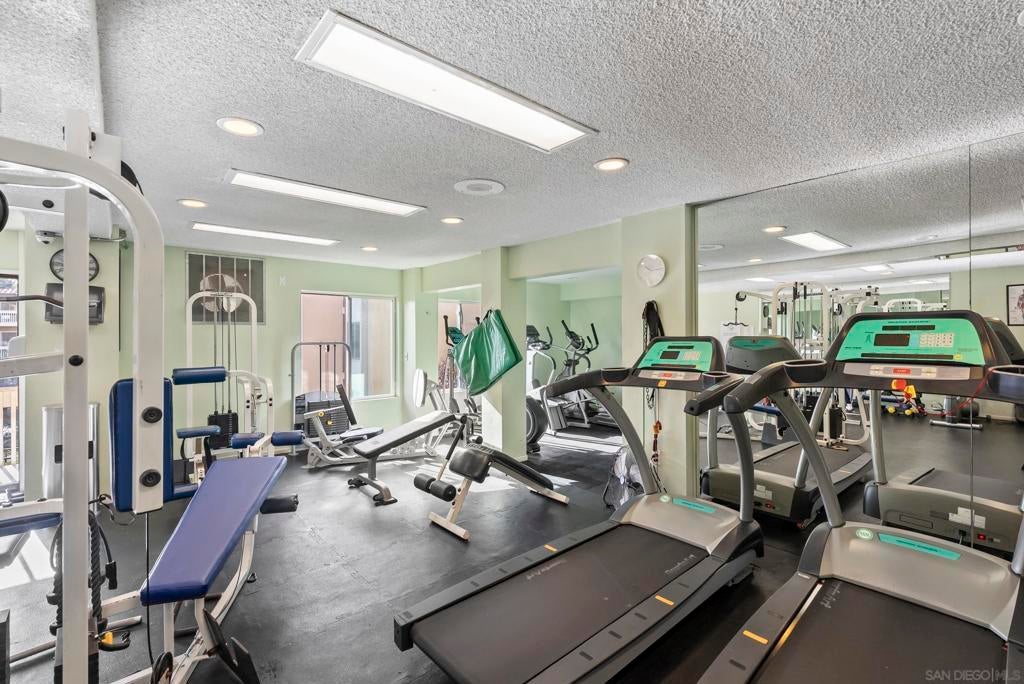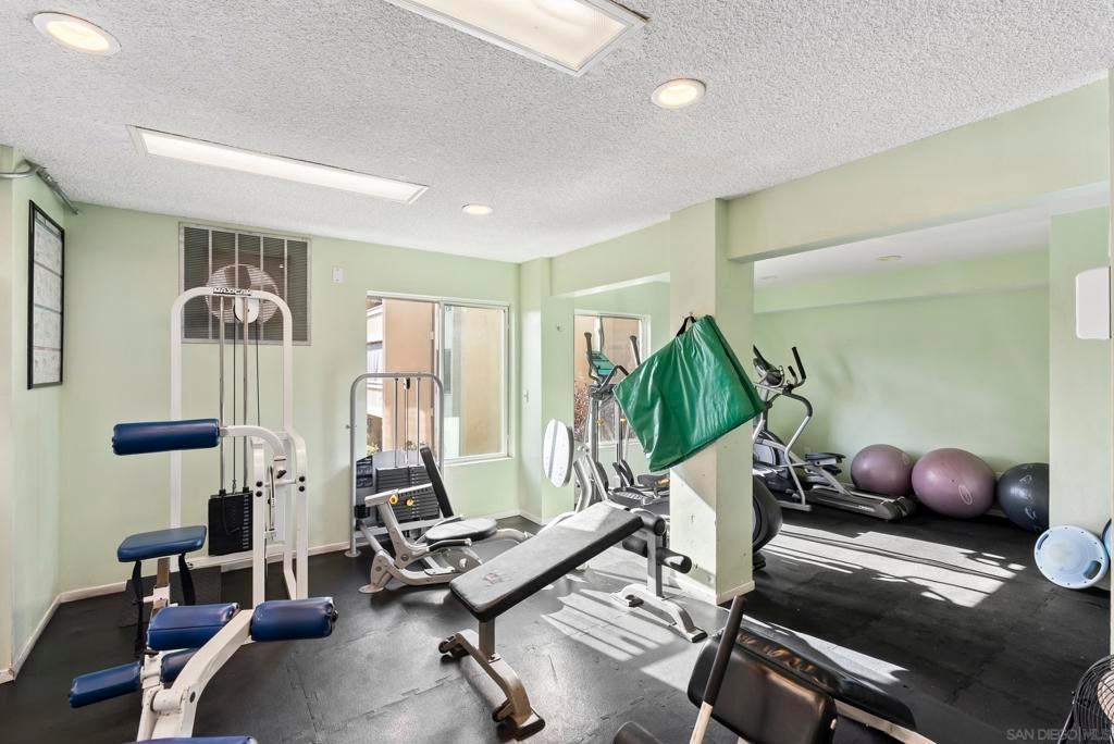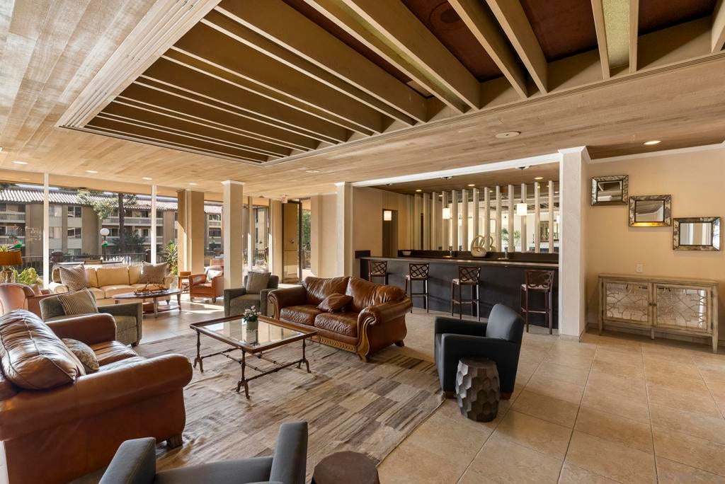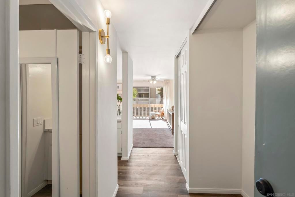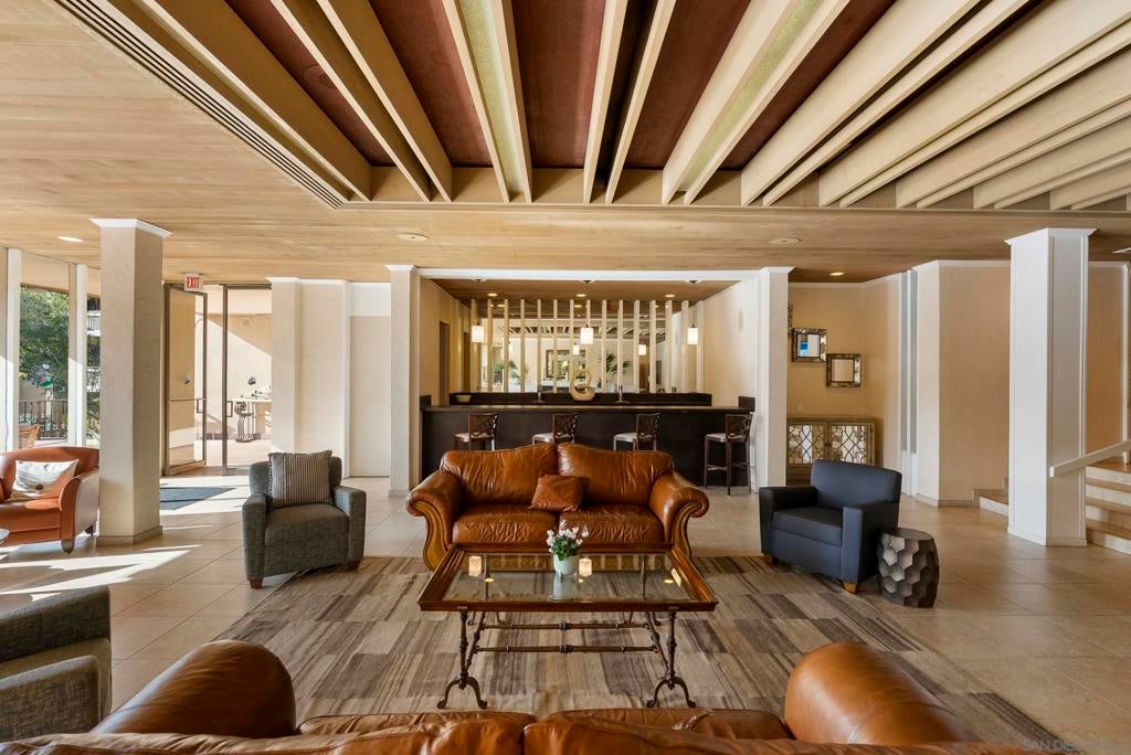 Welcome to resort-style living in the heart of Pacific Beach at The Plaza. This spacious and quiet interior second-floor STUDIO with 1 secure gated garage parking space (#137), offers an exceptional opportunity to enjoy the SoCal lifestyle at an affordable price point. Just minutes from the beach, dining, and everyday conveniences. Elevated above the courtyard, the unit features an oversized 8 ft X 5 ft private patio overlooking the peaceful pool and greenery, creating a perfect indoor-outdoor retreat. Recent upgrades (see suppl) include a new electric panel, updated bathroom w/ new vanity | lighting | quartz counters | refinished bathtub surround, and brushed gold light fixtures throughout, offering both comfort and an elevated style. Convenient community laundry right next door so no neighbor on one side and quiet interior location. Inside, the layout is impressively functional for a studio, with a large 6 ft X 9 ft entry area ideal for additional storage, a full-size kitchen w/ modern appliances, and a convenient eat-at bar that opens seamlessly to the living space. The living area provides ample space for flexible furniture arrangements, making it easy to create distinct living, sleeping, and work-from-home zones. The Plaza community is known for its unmatched amenities, including 5 tennis courts, 4 swimming pools, a well-equipped gym, sauna, BBQ areas, massive community room and extended outdoor deck overlooking the beautiful central water feature, billiard room, library, and lush landscaped grounds that feel like a year-round resort. Located just a 3-minute walk to shopping, restaurants, and nightlife along Garnet Avenue, and less than 2 miles from the beach, this home offers effortless access to everything Pacific Beach is known for. Walk, bike, or cruise to the sand while enjoying a low-maintenance lifestyle that doesn’t break the bank. A rare value in one of San Diego’s most desirable coastal communities.