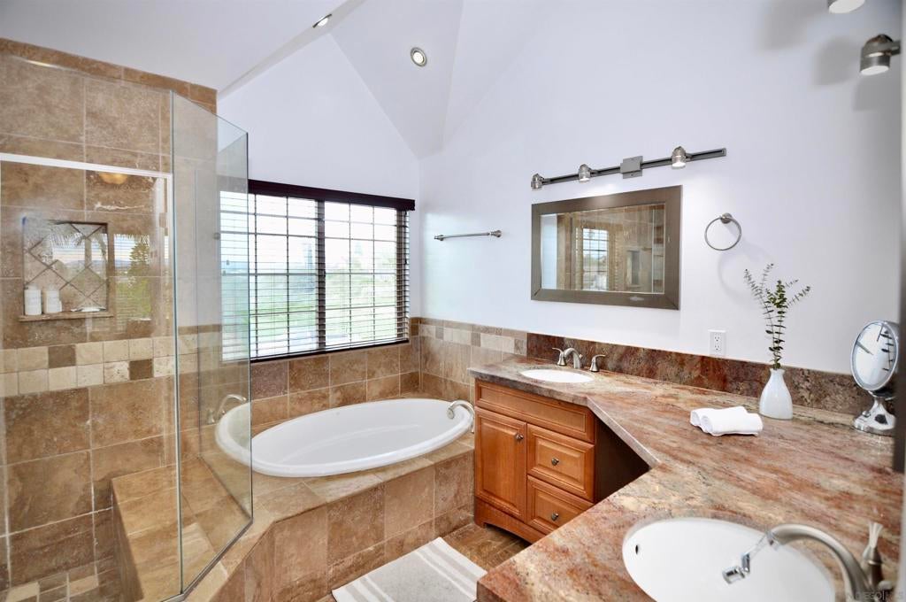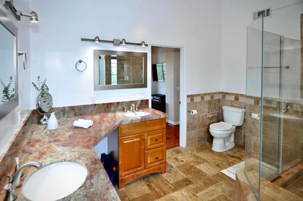 COASTAL LIVING with OWNED SOLAR, VIEWS & NO HOA! This spacious 5BR/4BA home, just minutes from the beach, offers two en-suite primary bedrooms upstairs—both with deck access and sunrise views, in addition to two other bedrooms and full bath. The open kitchen flows into the family and dining areas, perfect for entertaining. Additional bedroom/office, and full bath downstairs. Enjoy a beautifully maintained backyard retreat with multiple patios, fire pit, Cal swim spa, and upper deck for relaxing lounging with views. Energy-efficient with dual-pane windows, updated baths, replaced roof before paid solar installation that covers annual electric use—including for the heated pool/spa. Located in a quiet, established neighborhood near Ivey Ranch/Rancho del Oro and N Santa Fe Ave. Epoxy garage, low maintenance landscaping, and no HOA complete this exceptional find!