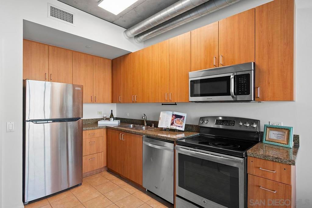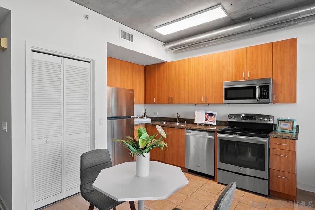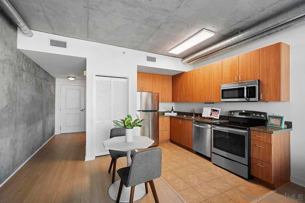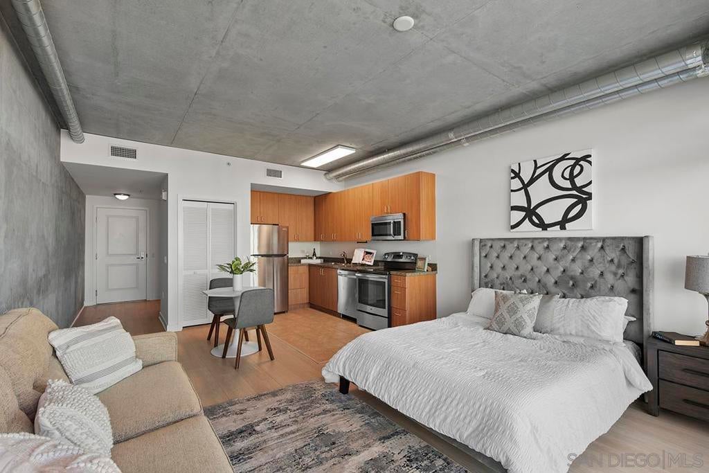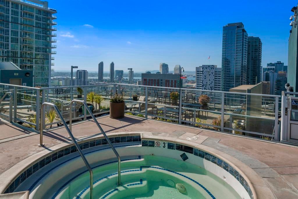 Elevate your urban lifestyle with this Smart Corner residence, ideally positioned in the vibrant heart of East Village. This east-facing studio is a true vantage point showcasing views of the city skyline, Balboa Park, distant mountains, and even glimpses of the iconic Coronado Bridge from your own balcony. Designed with an industrial-chic aesthetic, the home features stylish concrete accents and exposed ductwork that pair beautifully with the recently installed luxury vinyl plank flooring, creating a modern, loft-inspired atmosphere. The kitchen is equipped with updated stainless appliances, while the bathroom offers a practical shower/tub combination. Fresh interior paint and a secured parking space add to the comfort and convenience. Exceptionally versatile, this studio serves perfectly as a smart investment property, an efficient live-work space, or a serene urban retreat. Discover the ease of Downtown living in this East Village pied-à-terre, where dining, culture, and transit are just steps away. Smart Corner is an all-encompassing hub of work, play, shop, and live! It is conveniently located near the 163 freeway, I-5, Highway 94, Petco Park, the Gaslamp Quarter, and Balboa Park. A trolley station located directly below the building ensures Smart Corner has all an urban dweller could want. Amenities include a roof-top sun deck with spa, a barbecue area, gym, and wet bar on the 20th floor, and fully equipped exercise room. Welcome home!