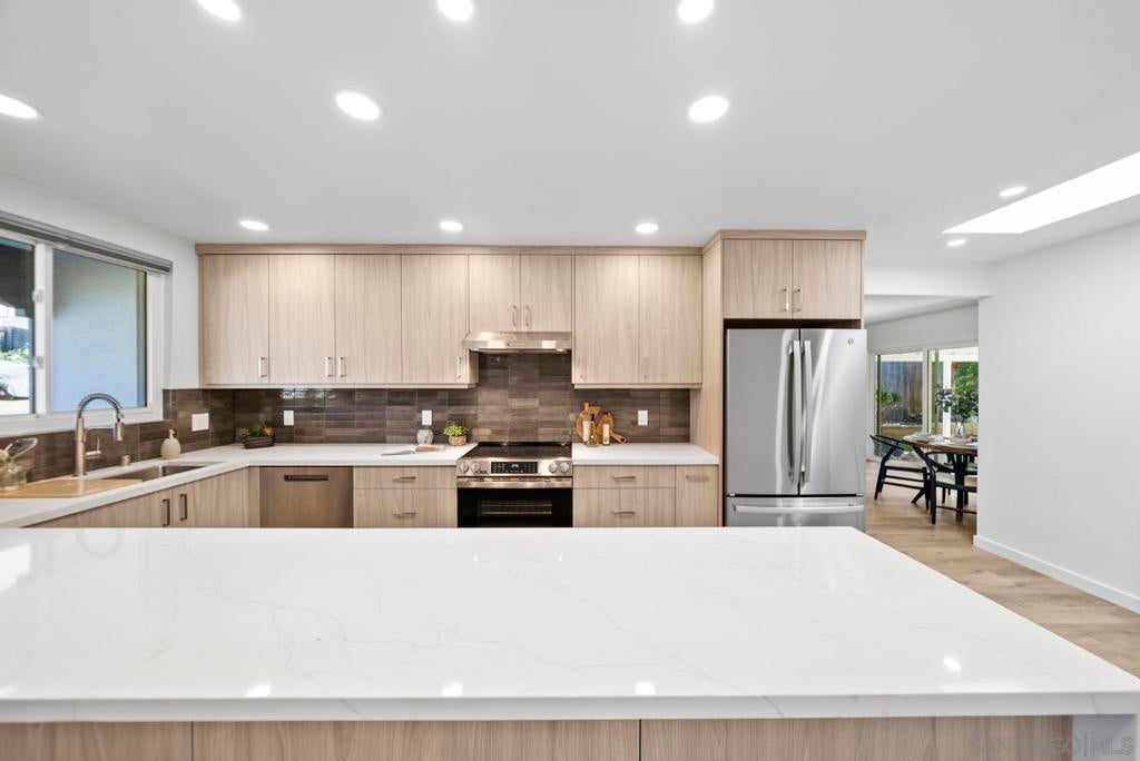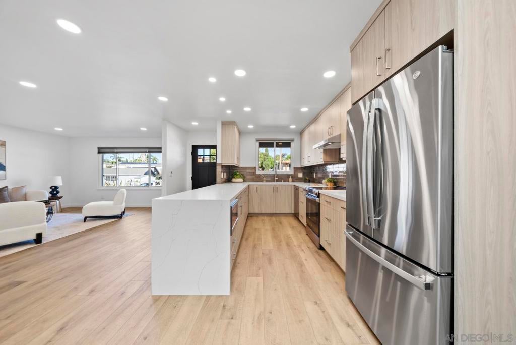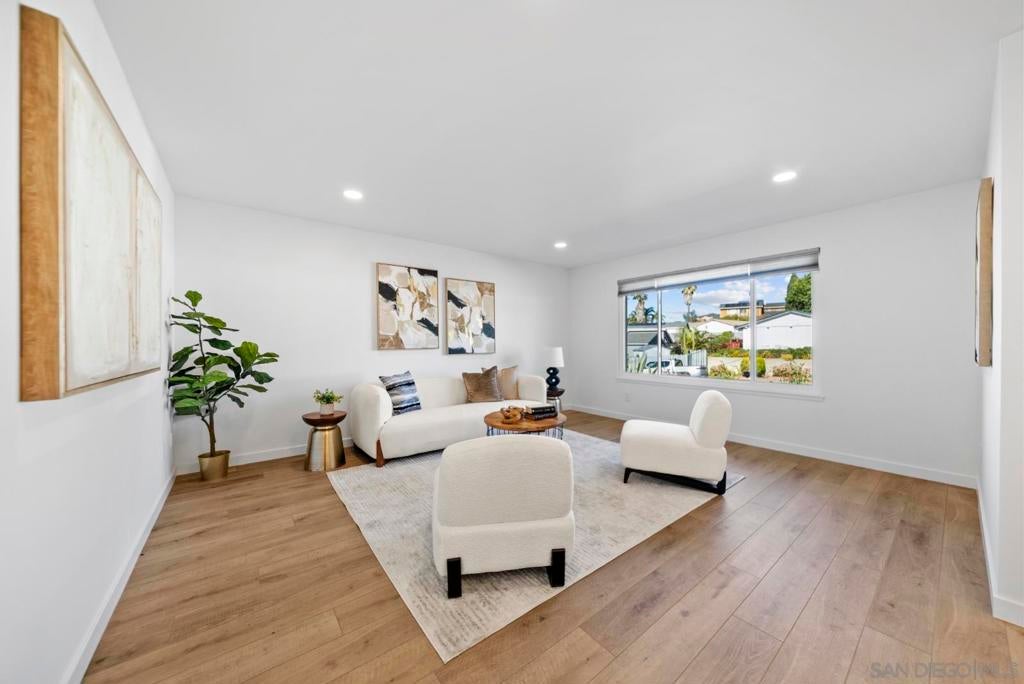 Beautifully remodeled single-story home with exceptional curb appeal in the highly desirable Alcala Knolls neighborhood, ideally located just half a mile from Francis Parker School and the University of San Diego. This is not a flip. This home was thoughtfully renovated by the owners for their own use, with quality, comfort, and functionality in mind, before deciding to sell. First time on the market in 50 years. The kitchen has been completely reimagined and features brand-new custom cabinetry, new countertops, and new appliances, offering a clean, modern space ideal for everyday living and entertaining. Both bathrooms are entirely new, showcasing stylish finishes, tiled showers, and a spa-like feel. Throughout the home, you’ll find all-new lighting, flooring, doors, hardware, smooth wall texture, and fresh interior and exterior paint. A custom fireplace surround and mantle adds warmth and character to the living space. The finished garage includes tile flooring and built-in cabinetry for excellent storage. Step outside to a spacious backyard with a covered patio and ample flat, usable land, perfect for outdoor dining, play, or future expansion with perhaps an ADU in the future.