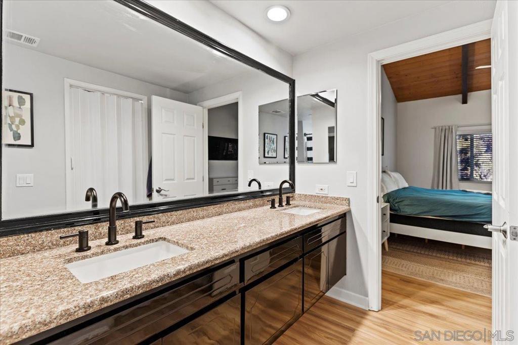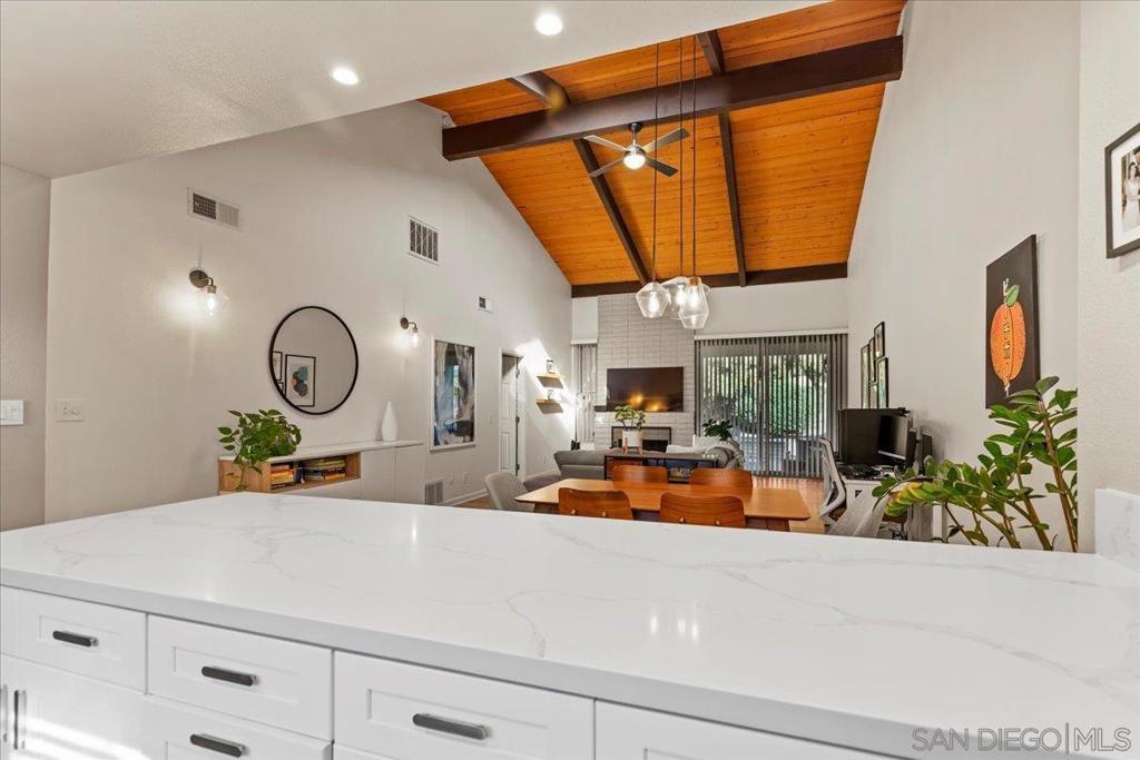 Nestled within the tranquil Stoneridge community of Poway, this beautifully updated single-story townhome offers an exceptional blend of architectural character and modern comfort. Soaring wood-planked, beamed ceilings create an immediate sense of warmth and volume, while the thoughtfully renovated kitchen showcases quartz countertops, designer cabinetry, stainless steel appliances, and generous storage. The expansive living and dining areas are filled with natural light and enhanced by luxury vinyl plank flooring, all centered around a timeless brick fireplace. Oversized dual-pane sliding doors extend the living space outdoors to a private tiled patio overlooking a serene desertscape hillside—perfect for relaxing or entertaining in peaceful surroundings. Inside, two generously sized bedrooms provide ideal separation and comfort, each featuring walk-in closets. The primary suite impresses with cathedral beamed ceilings, dual-sink vanity, extensive cabinetry, and a custom-organized walk-in closet. Additional highlights include recessed lighting, skylight, central air conditioning and heat, dual-pane windows, ceiling fans, and an attached garage with washer and dryer hookups. Residents enjoy access to a sparkling pool and spa, ample guest parking, and an HOA that covers water, trash, sewer, roof and exterior maintenance, and common area care. Ideally located within the highly regarded Poway Unified School District, this home offers close proximity to shopping, golf courses, Bernardo Winery, Lake Poway, and an abundance of scenic hiking and biking trails.