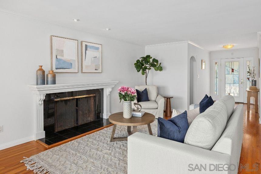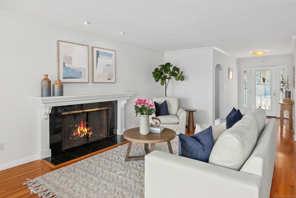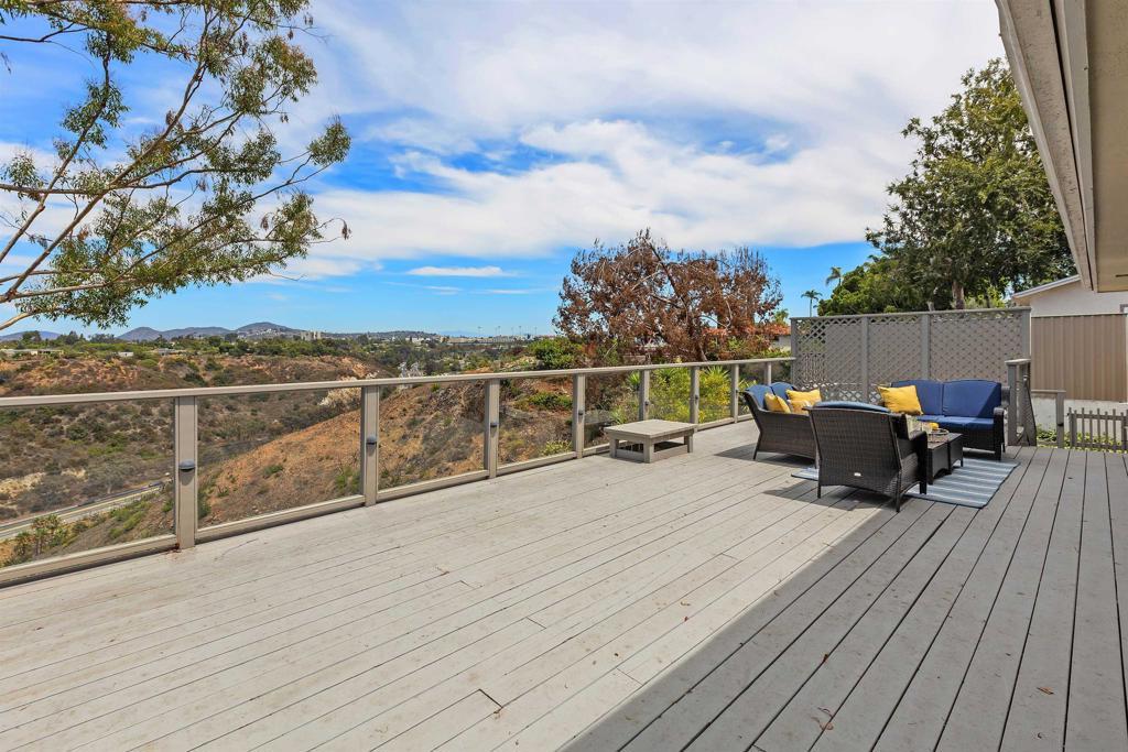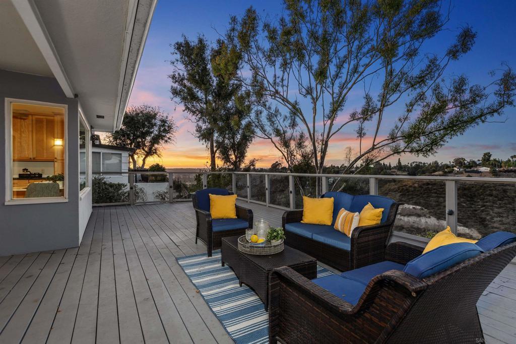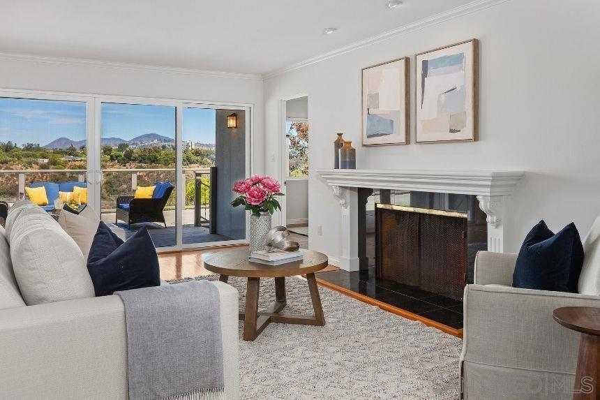 Nestled on a canyon lot, this airy and inviting Talmadge home offers panoramic views and beautifully landscaped front yard with excellent curb appeal. Step through the charming stained-glass front door into a formal entry, where your gaze is immediately drawn to the sweeping canyon beyond. Hardwood floors and warm wood trim flow throughout the home, complementing the cozy fireplace in the living room. The spacious primary suite features a recently remodeled bathroom blending comfort with modern style... Lovely kitchen offers abundant cupboard and counter space and eating bar, and opens to a cheerful breakfast room with a large picture window framing the canyon view. Sliding glass doors from the living room lead to an expansive deck, with a sleek plexiglass view through railing, perfect for entertaining. Additional highlights include a direct-entry garage (with Tesla wall charger) and thoughtful layout, ideal for both relaxed family living and lively gatherings.