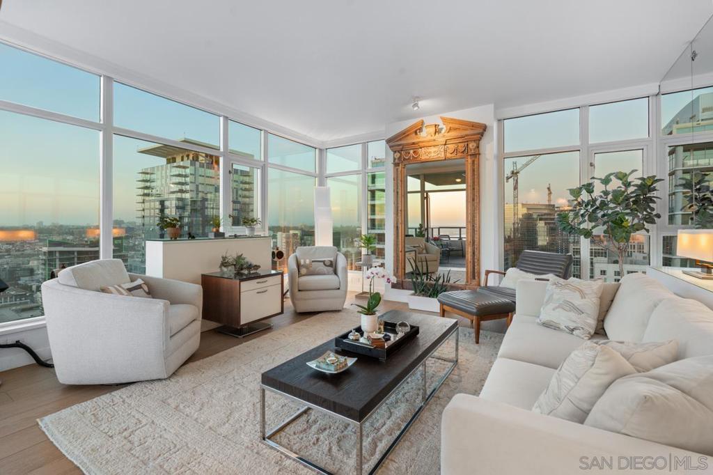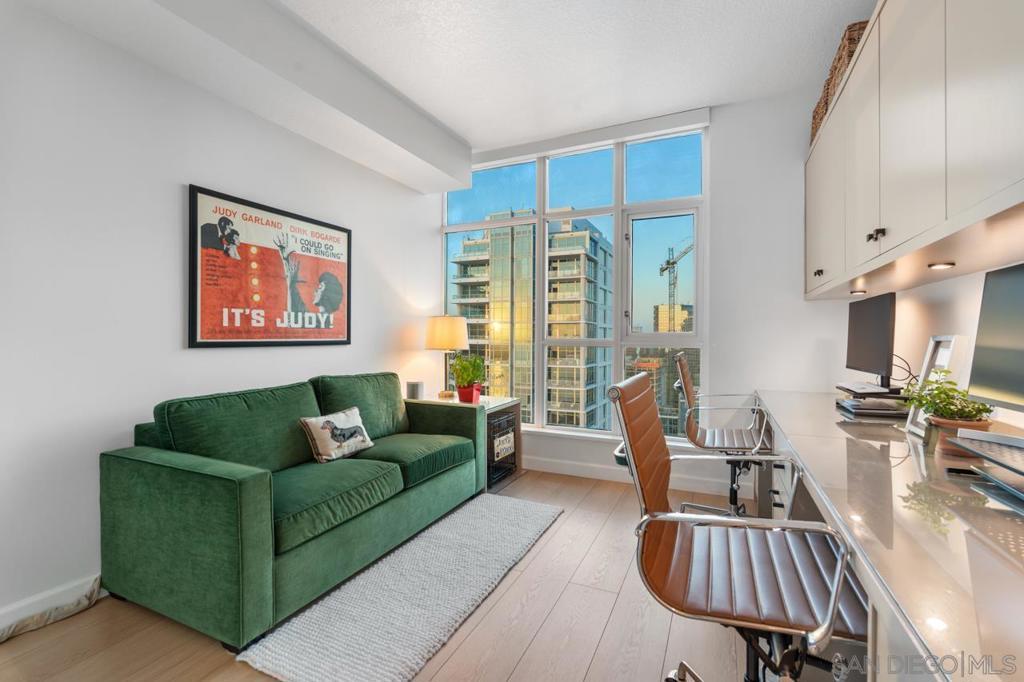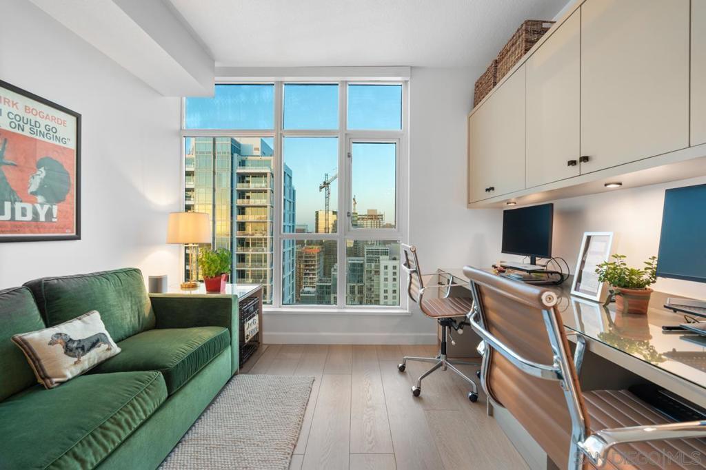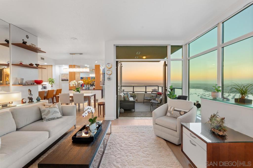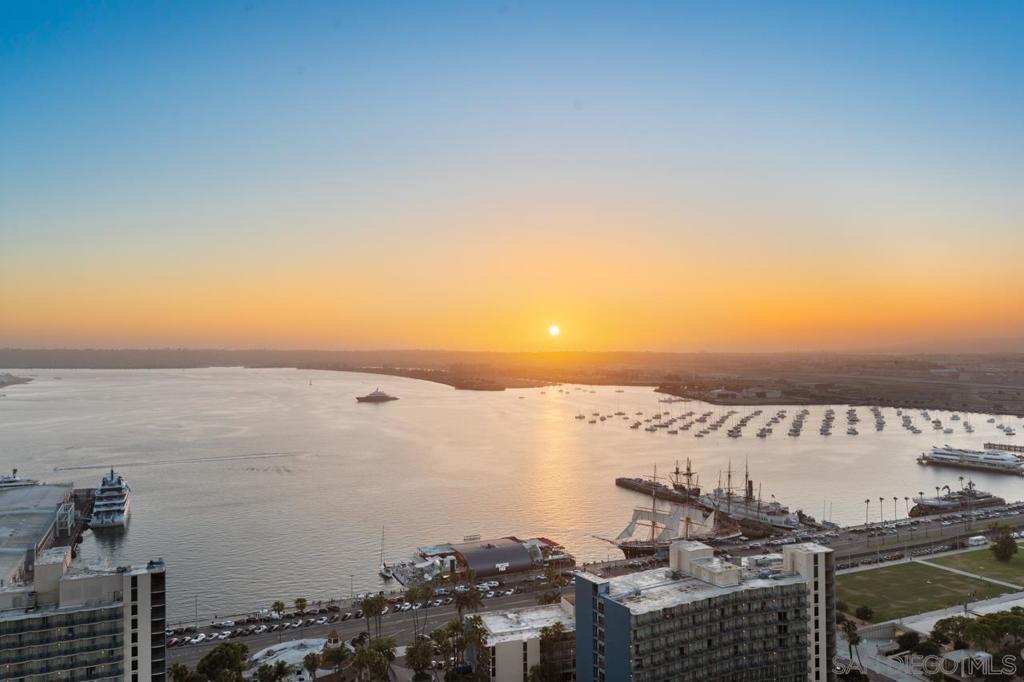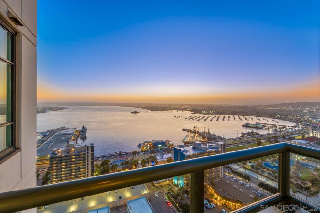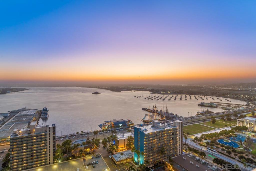 Soaring high above the city on the 31st floor of the distinguished Grande North, this rare corner residence commands a front-row seat to San Diego’s most breathtaking scenery. Walls of glass unveil an ever-changing canvas of San Diego Bay, the glittering skyline, distant mountains, and the vast Pacific beyond. From sunrise to sailboat regattas, golden sunsets to SeaWorld’s nightly fireworks—every moment is a masterpiece, best enjoyed from your own private terrace in the sky. This fully remodeled and professionally designed 2-bedroom, 2-bath home has been reimagined with a focus on luxury, comfort, and functionality. Both bathrooms have been completely renovated with designer finishes and thoughtful details. The chef-inspired kitchen is equipped with new Sub-Zero and Wolf appliances, quartz countertops, and sleek custom cabinetry. Enhancing the experience throughout the home is a state-of-the-art Bang & Olufsen surround sound system, delivering rich, immersive audio. Motorized window shades, custom closets, and built-in storage offer refined ease, while every design detail has been meticulously curated. This is more than a home—it’s a lifestyle inspired by The Art of Living. Whether you’re entertaining against a sunset backdrop or enjoying a quiet morning above the bay, this residence delivers a daily experience of beauty, style, and sophistication. Welcome home! Supplement...This residence in the sky has been completely reimagined with luxury, comfort, and style in mind. Every surface and system has been upgraded to create a refined, turnkey home. The chef’s kitchen features new Sub-Zero and Wolf appliances, custom cabinetry, and sleek quartz countertops—equally suited for everyday living and entertaining. Both the primary and guest baths have been fully renovated with spa-inspired finishes and designer touches. Thoughtful built-in storage enhances the primary bedroom, dining area, and guest room/office. Luxury vinyl flooring runs throughout, paired with electronic shades and custom lighting to elevate the ambiance. Additional upgrades include a Bang & Olufsen pre-wired sound system, new LG washer/dryer, updated plumbing with new shut-off valves, and a well-proportioned terrace perfect for enjoying panoramic sunsets and fireworks. The Grande North is one of San Diego’s most sought-after luxury high-rises, offering a full-service lifestyle just one block from the San Diego Bay and vibrant Little Italy. Residents enjoy an array of amenities including a striking lobby ( new furniture coming soon) with 24-hour security, high-definition surveillance, an 80’ heated lap pool, jacuzzi spa, BBQ area, and lush garden retreat. Additional features include concierge service, a well-equipped fitness center and elegant resident lounge. HOA covers high-speed Google fiber, gas, water, trash, and common area insurance. Moments away from the San Diego Bayfront, Rady Shell for waterfront concerts, the County Waterfront Park, Little Italy and the RADD District’s curated shops and restaurants, The Grande North blends urban sophistication with coastal charm—luxury living in the heart of San Diego. You are home!