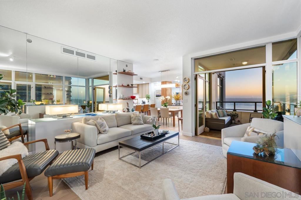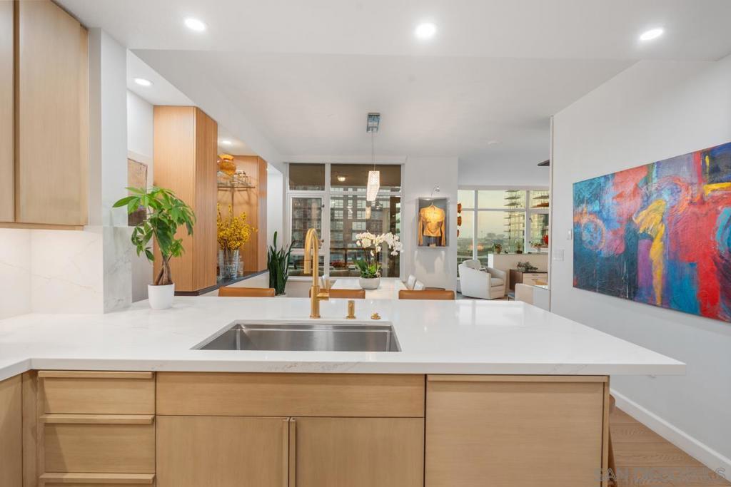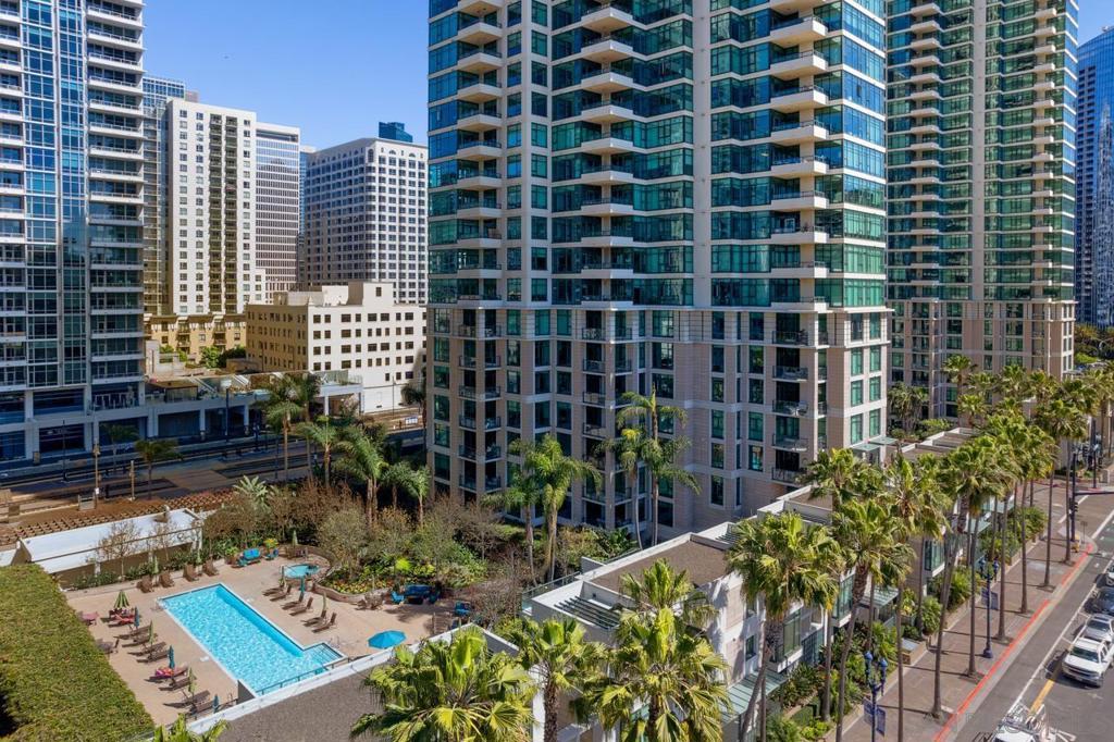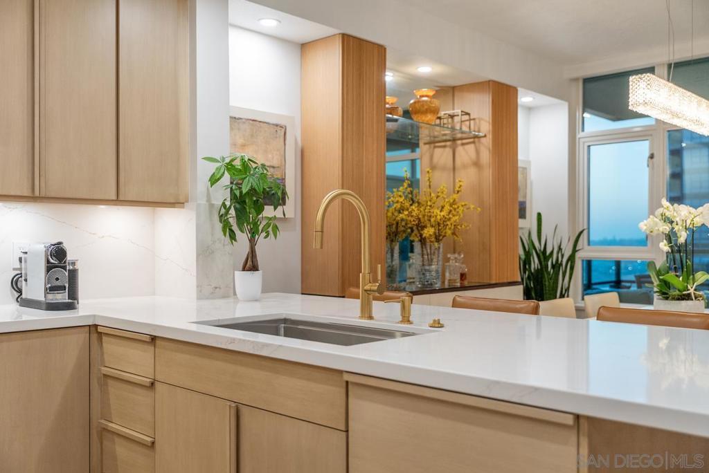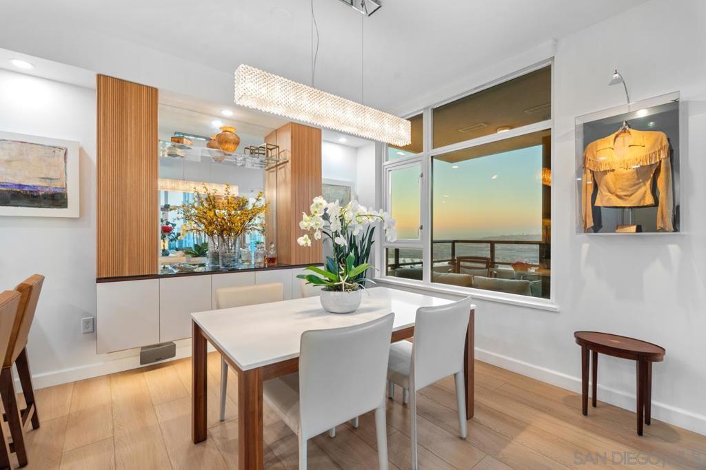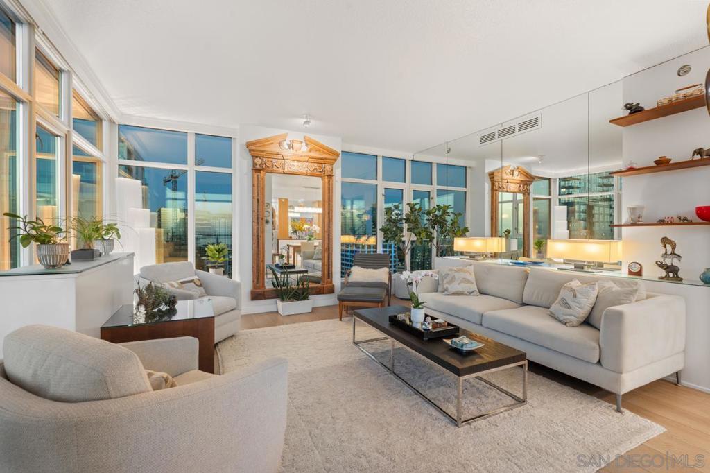 Soaring high above the city on the 31st floor of the distinguished Grande North, this rare corner residence commands a front-row seat to San Diego’s most breathtaking scenery. Walls of glass unveil an ever-changing canvas of San Diego Bay, the glittering skyline, distant mountains, and the vast Pacific beyond. From sunrise to sailboat regattas, golden sunsets to SeaWorld’s nightly fireworks—every moment is a masterpiece, best enjoyed from your own private terrace in the sky. This fully remodeled and professionally designed 2-bedroom, 2-bath home has been reimagined with a focus on luxury, comfort, and functionality. Both bathrooms have been completely renovated with designer finishes and thoughtful details. The chef-inspired kitchen is equipped with new Sub-Zero and Wolf appliances, quartz countertops, and sleek custom cabinetry. Enhancing the experience throughout the home is a state-of-the-art Bang & Olufsen surround sound system, delivering rich, immersive audio. Motorized window shades, custom closets, and built-in storage offer refined ease, while every design detail has been meticulously curated. This is more than a home—it’s a lifestyle inspired by The Art of Living. Whether you’re entertaining against a sunset backdrop or enjoying a quiet morning above the bay, this residence delivers a daily experience of beauty, style, and sophistication. Welcome home! Supplement...This residence in the sky has been completely reimagined with luxury, comfort, and style in mind. Every surface and system has been upgraded to create a refined, turnkey home. The chef’s kitchen features new Sub-Zero and Wolf appliances, custom cabinetry, and sleek quartz countertops—equally suited for everyday living and entertaining. Both the primary and guest baths have been fully renovated with spa-inspired finishes and designer touches. Thoughtful built-in storage enhances the primary bedroom, dining area, and guest room/office. Luxury vinyl flooring runs throughout, paired with electronic shades and custom lighting to elevate the ambiance. Additional upgrades include a Bang & Olufsen pre-wired sound system, new LG washer/dryer, updated plumbing with new shut-off valves, and a well-proportioned terrace perfect for enjoying panoramic sunsets and fireworks. The Grande North is one of San Diego’s most sought-after luxury high-rises, offering a full-service lifestyle just one block from the San Diego Bay and vibrant Little Italy. Residents enjoy an array of amenities including a striking lobby ( new furniture coming soon) with 24-hour security, high-definition surveillance, an 80’ heated lap pool, jacuzzi spa, BBQ area, and lush garden retreat. Additional features include concierge service, a well-equipped fitness center and elegant resident lounge. HOA covers high-speed Google fiber, gas, water, trash, and common area insurance. Moments away from the San Diego Bayfront, Rady Shell for waterfront concerts, the County Waterfront Park, Little Italy and the RADD District’s curated shops and restaurants, The Grande North blends urban sophistication with coastal charm—luxury living in the heart of San Diego. You are home!