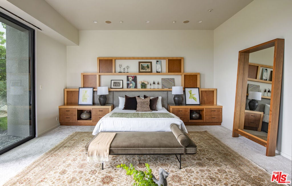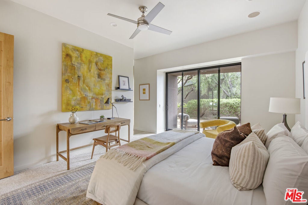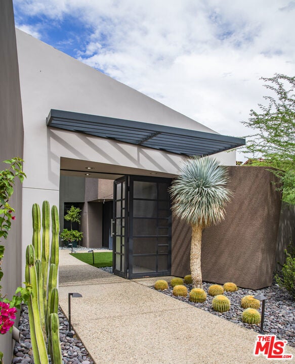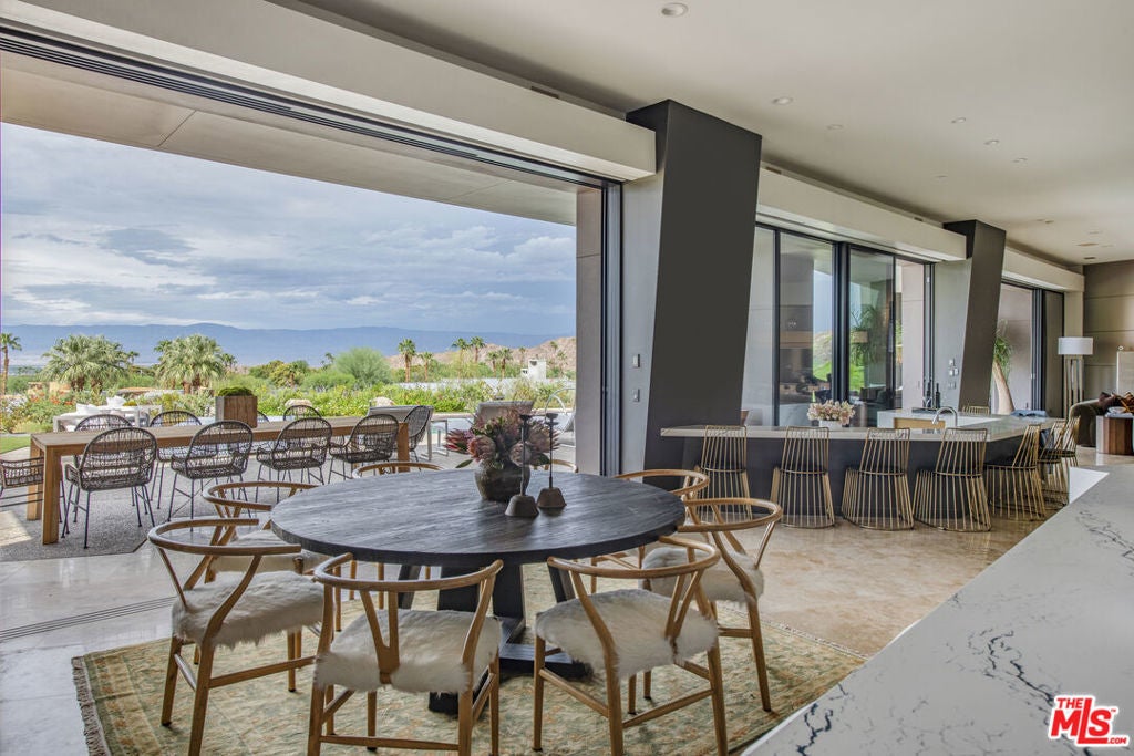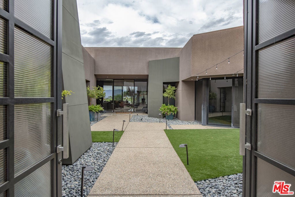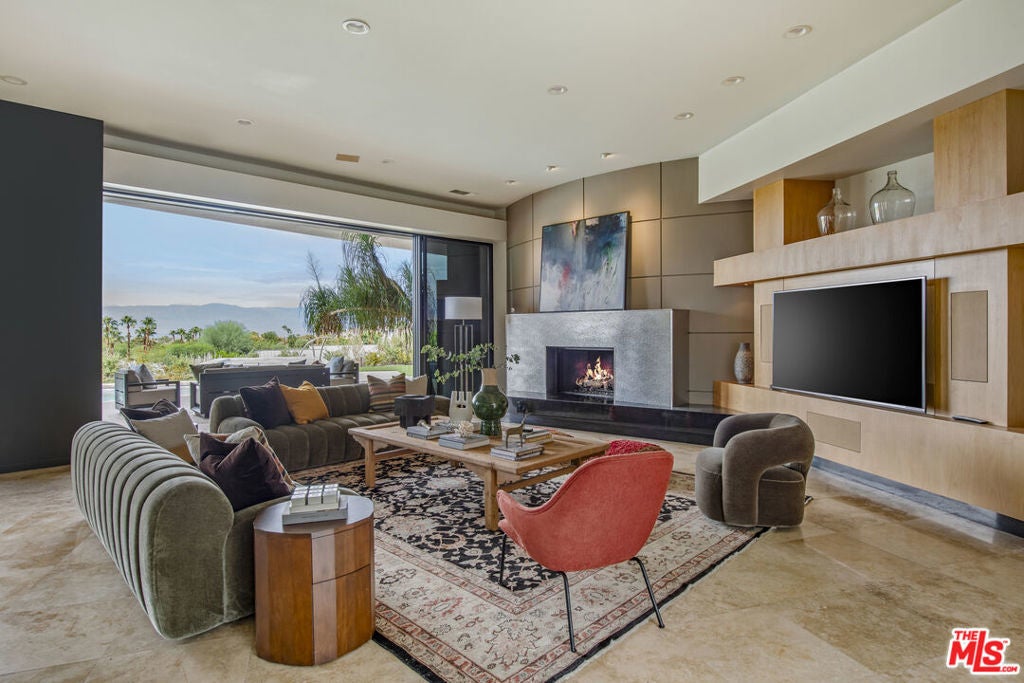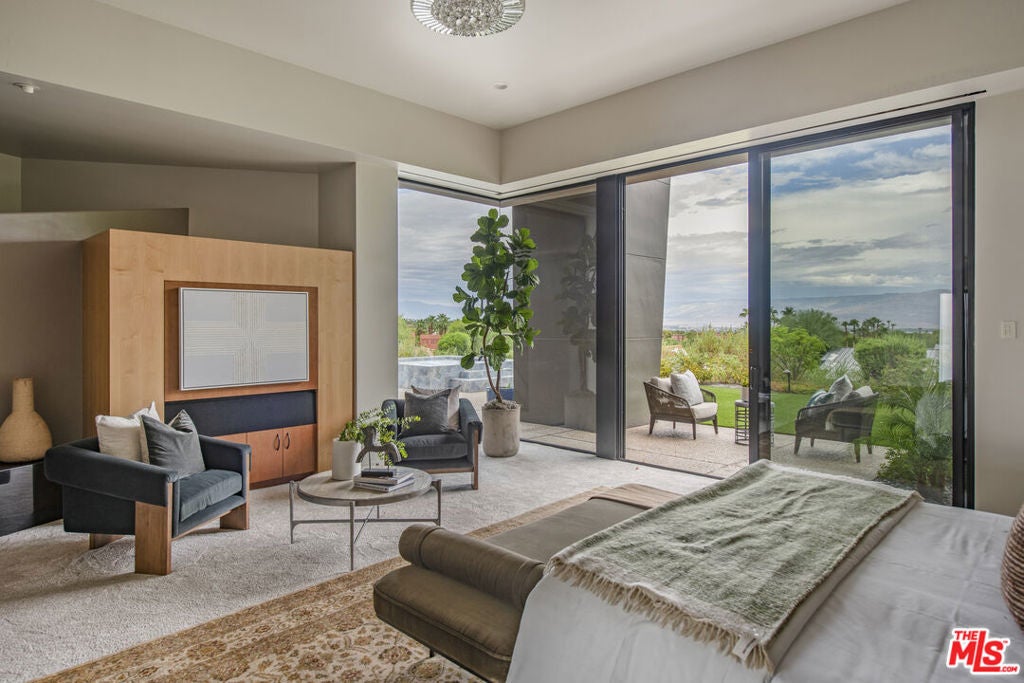 Located inside the gates of Ironwood Country Club, this striking modern home offers a rare blend of clean-lined design and effortless desert living. Walls of glass frame sweeping mountain and valley views, while natural light pours across the open layout. The residence features four bedrooms and four baths, including a dramatic primary suite with fireplace, dual walk-in closets, two water closets (one with smart toilet), and a spa-inspired bath with cold plunge tub and oversized shower. Two ensuite guest rooms add privacy, with a fourth bedroom currently serving as a fitness room. A newly updated chef's kitchen showcases premium appliances, built-in wine fridge, and oversized sunken wet bar perfect for entertaining against a backdrop of desert scenery. Outside, the refreshed pool and spa create a private retreat surrounded by drought-tolerant landscaping. Sustainability comes built-in with owned solar, newer HVAC, and a tankless water heater. Situated at the end of a cul-de-sac, this home delivers luxury, seclusion, and some of the most captivating views in the community.