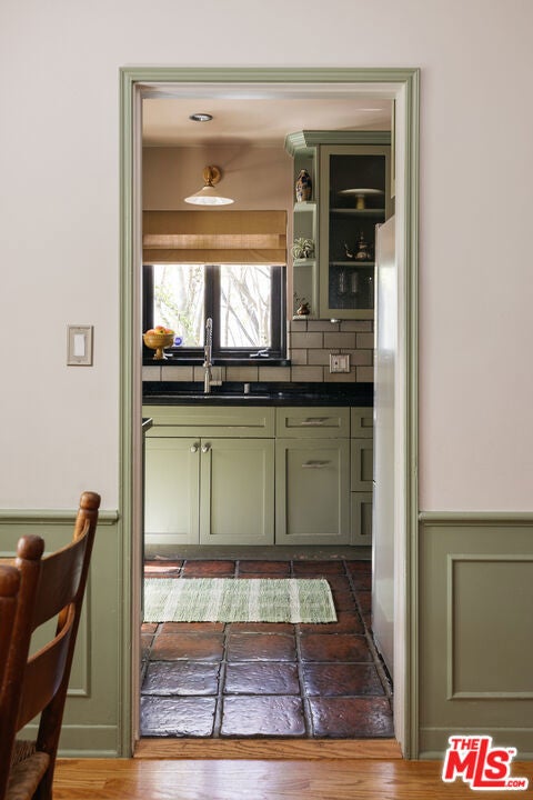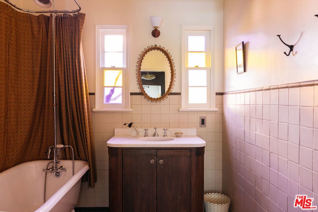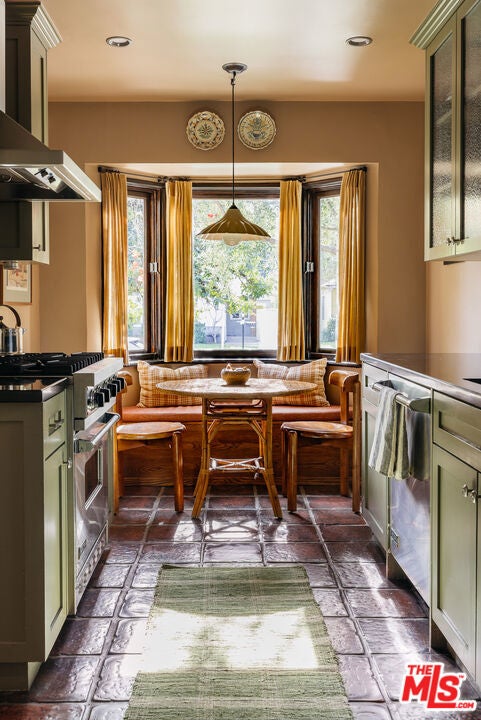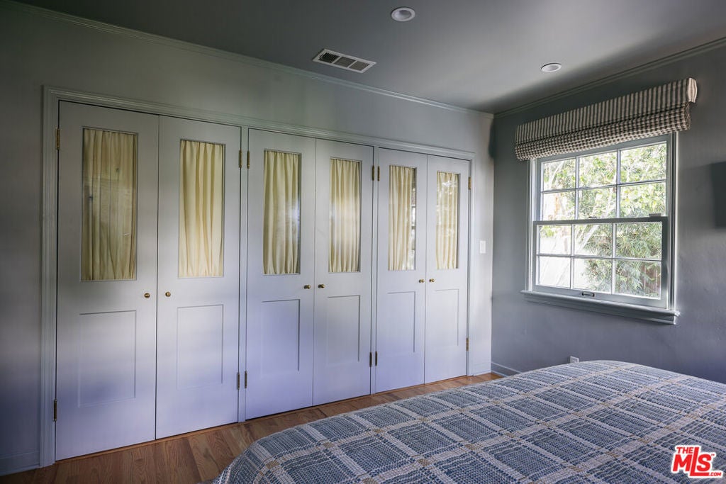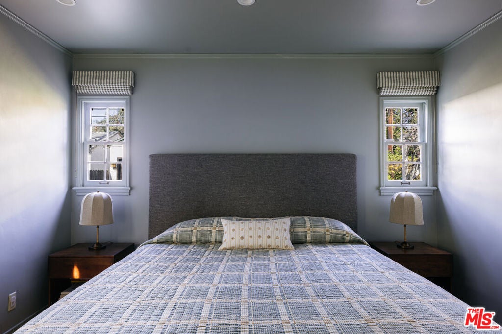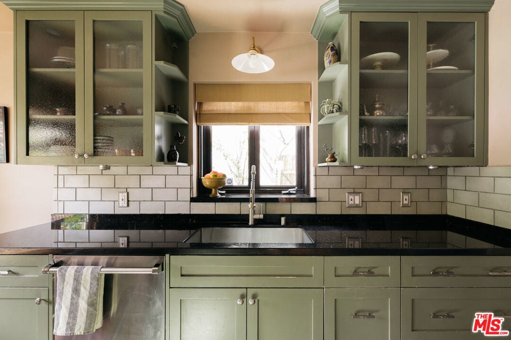 Picturesque traditional modern home with interior design by Garance Rousseau awash in mature trees and greenery with fully done detached recording studio or guest house available now. Stepping past the mature tree and grassy front yard into the home puts you in the living room, featuring original hardwood floors, wood framed windows, and bespoke fixtures. Through the cased transition is the formal dining room with wainscoting that gives way to the kitchen area, all accented with Farrow & Ball paint and detailing. The custom kitchen is framed by picture windows, a built-in breakfast nook, and features stainless steel high end appliances. The bathroom has been renovated with Rosso Alicante marble floor and Fireclay tile walls, Rejuvenation vanity and antique glass knobs, and clawfoot bathtub and shower. The guest bedroom has beautiful wood windows and a door to the backyard, while the primary bedroom has a custom closet with built-ins and room for a king bed. The gated backyard has a covered patio for al fresco dining and a koi pond surrounded by mature plants, vines and fruit trees. Across the small bridge over the koi pond through a door is a fully outfitted approximately 300 sf recording studio or guest house with its own powder room bathroom. It has been soundproofed, fitted with hardwood floors and recessed lighting, features a window looking out to the koi pond and greenery, and has its own dedicated mini split HVAC system. The home has central heating and cooling, EV car charger, custom built-out laundry closet, and parking in the driveway for two cars outside the gate. A special oasis in North Hollywood ready for its next steward.