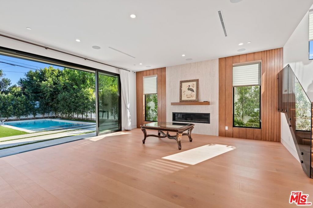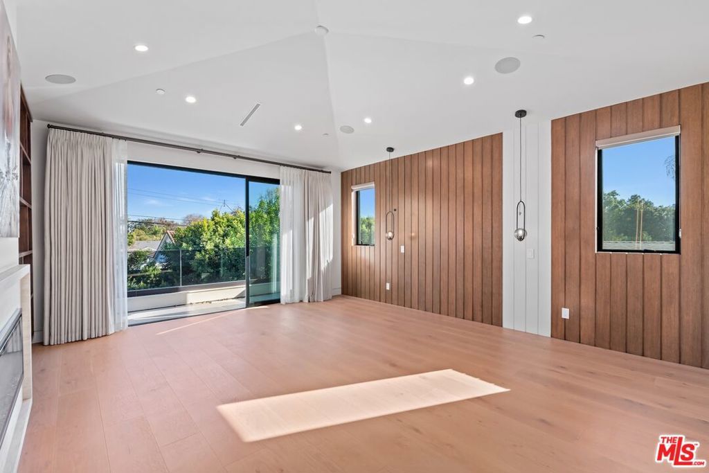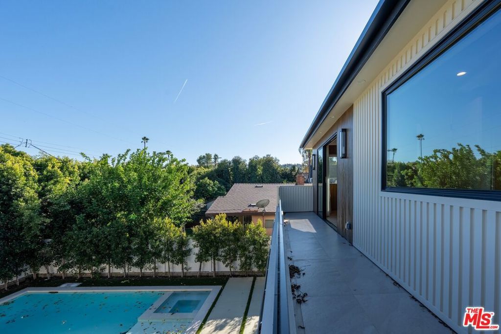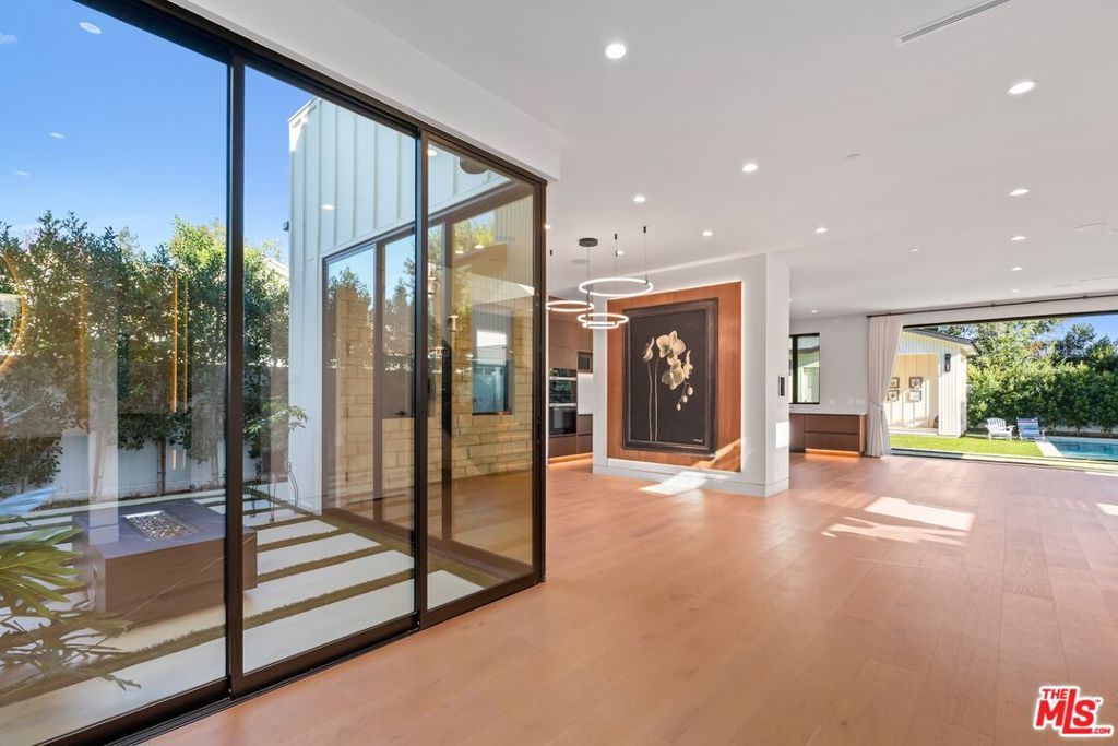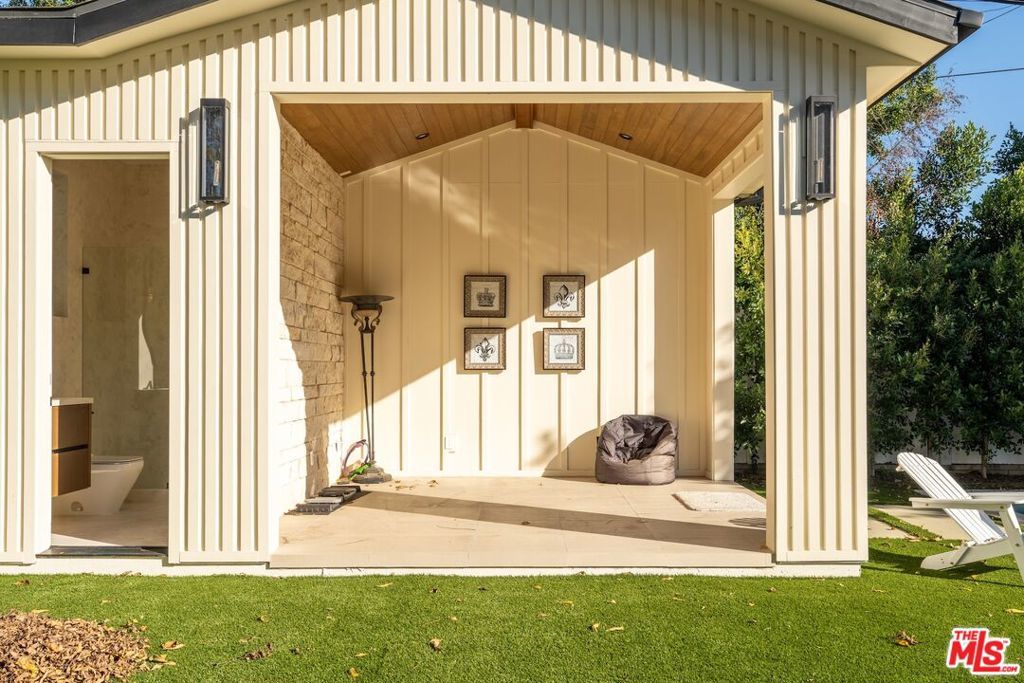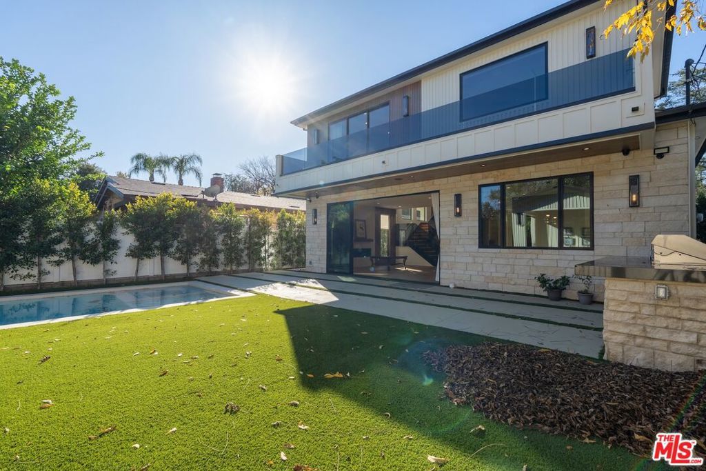 Welcome to The Noble - a gated modern farmhouse in one of Sherman Oaks' most sought-after neighborhoods. This 3,800 sqft architectural home features 4 bedrooms, 5.5 bathrooms, and a cabana, blending contemporary design with timeless elegance. Soaring ceilings, glass walls, and premium finishes including European oak floors, stone and wood accents, Venetian plaster, and designer lighting create a bright, open atmosphere. The open-concept layout connects the living, dining, and chef's kitchen, equipped with Miele smart appliances, quartz countertops, a waterfall island, and walk-in pantry. Sliding glass doors open to a private backyard oasis with pool, spa, fire pit, outdoor kitchen, BBQ, lawn, and a cabana with bath perfect for a gym or pool house.Upstairs offers three ensuite bedrooms and a luxurious primary suite with fireplace, walk-in closet, spa-like bath, and a balcony overlooking the yard. Additional highlights include a Crestron smart home system, EV charging prep, and a quiet tree-lined location just minutes from Ventura Blvd, with easy access to the 405 & 101.