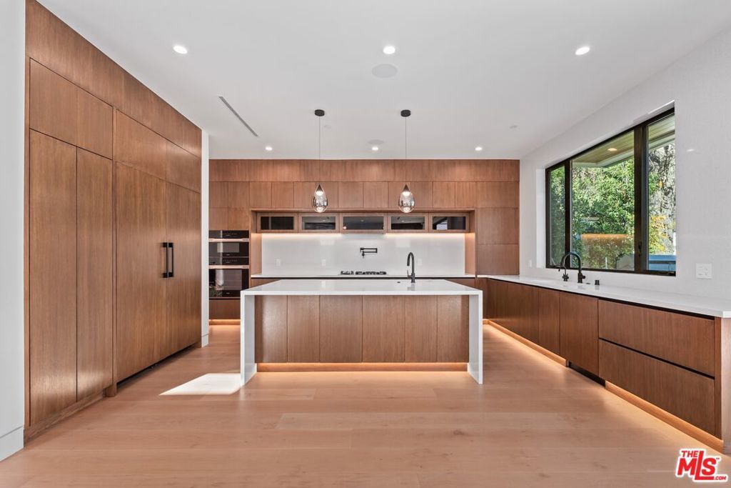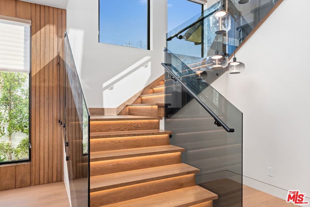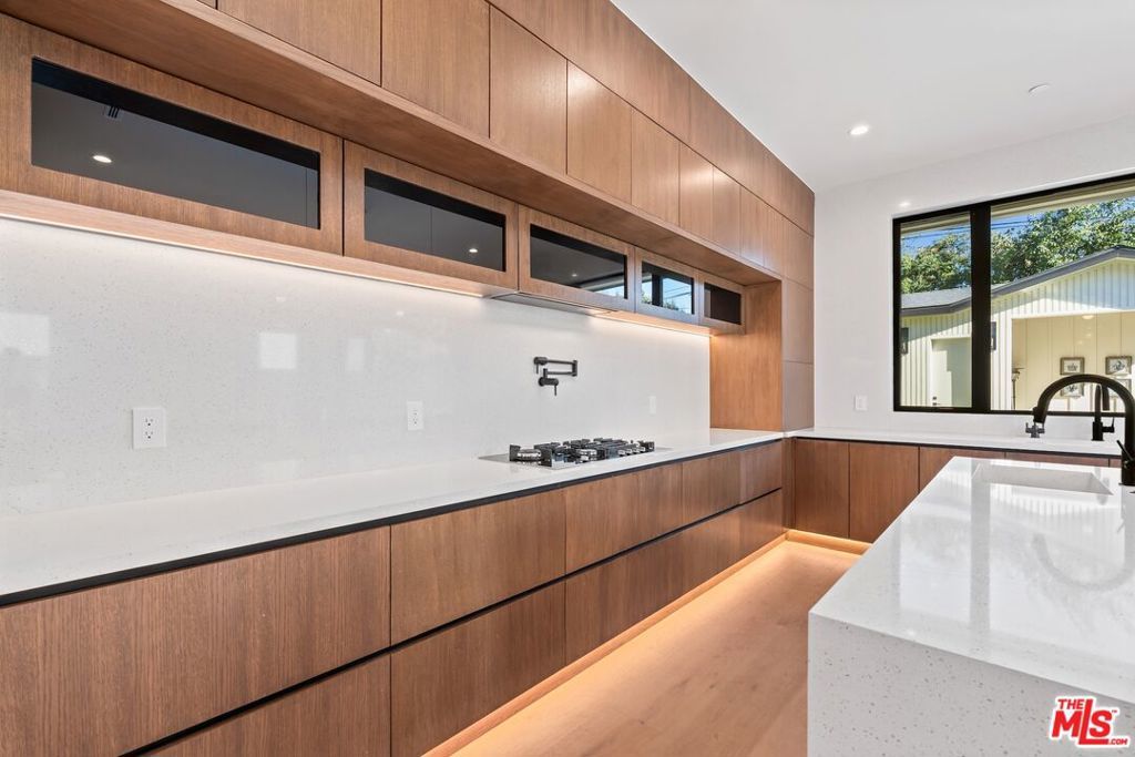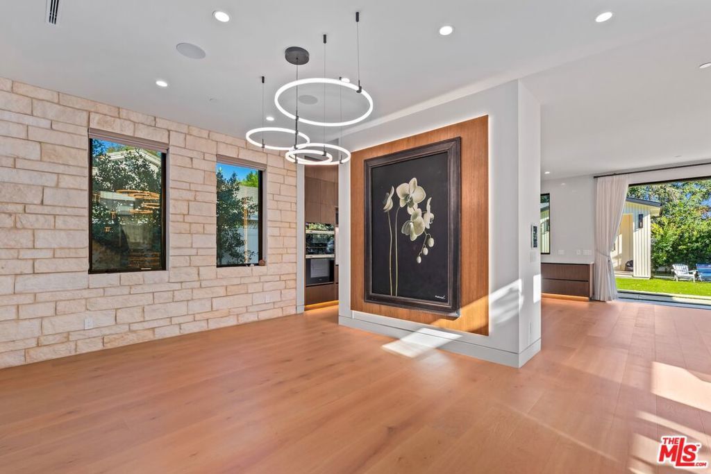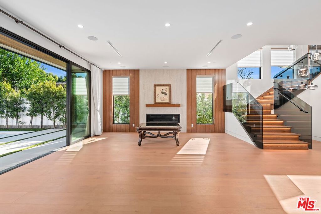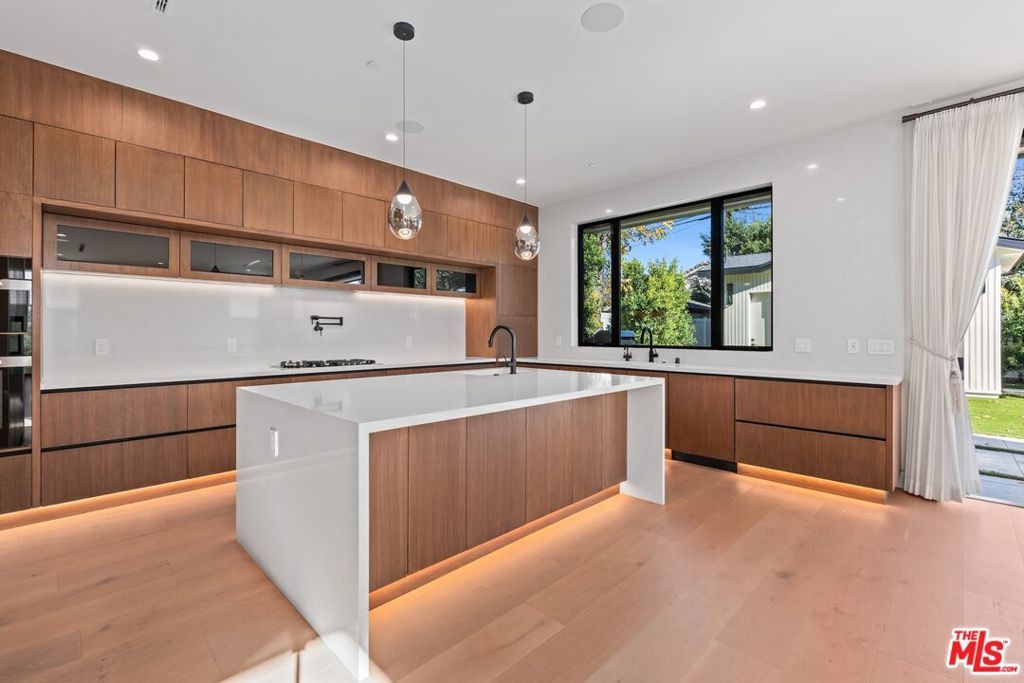 Welcome to The Noble - a gated modern farmhouse in one of Sherman Oaks' most sought-after neighborhoods. This 3,800 sqft architectural home features 4 bedrooms, 5.5 bathrooms, and a cabana, blending contemporary design with timeless elegance. Soaring ceilings, glass walls, and premium finishes including European oak floors, stone and wood accents, Venetian plaster, and designer lighting create a bright, open atmosphere. The open-concept layout connects the living, dining, and chef's kitchen, equipped with Miele smart appliances, quartz countertops, a waterfall island, and walk-in pantry. Sliding glass doors open to a private backyard oasis with pool, spa, fire pit, outdoor kitchen, BBQ, lawn, and a cabana with bath perfect for a gym or pool house.Upstairs offers three ensuite bedrooms and a luxurious primary suite with fireplace, walk-in closet, spa-like bath, and a balcony overlooking the yard. Additional highlights include a Crestron smart home system, EV charging prep, and a quiet tree-lined location just minutes from Ventura Blvd, with easy access to the 405 & 101.