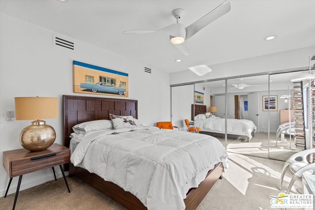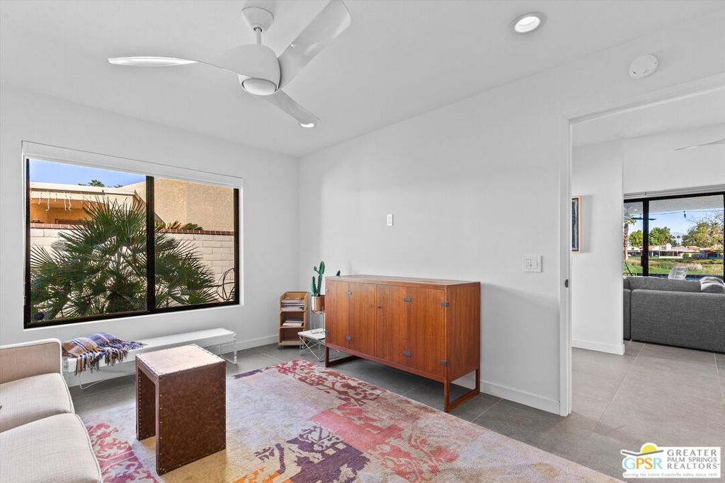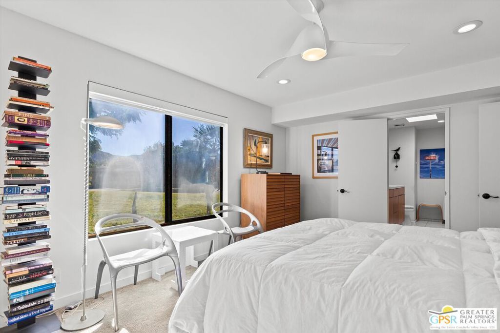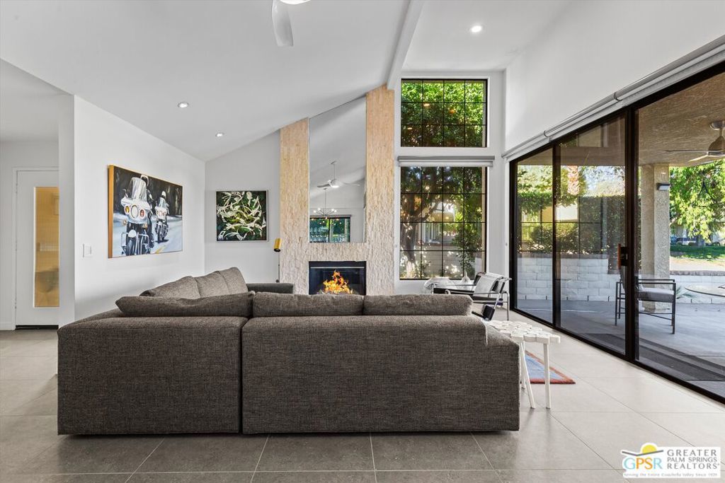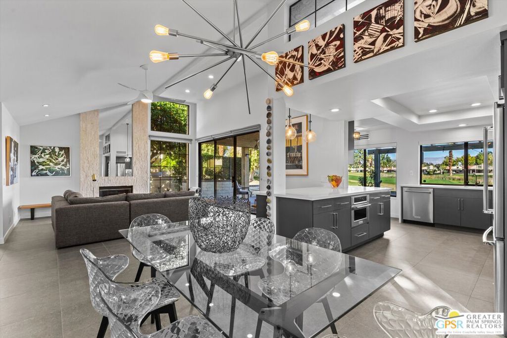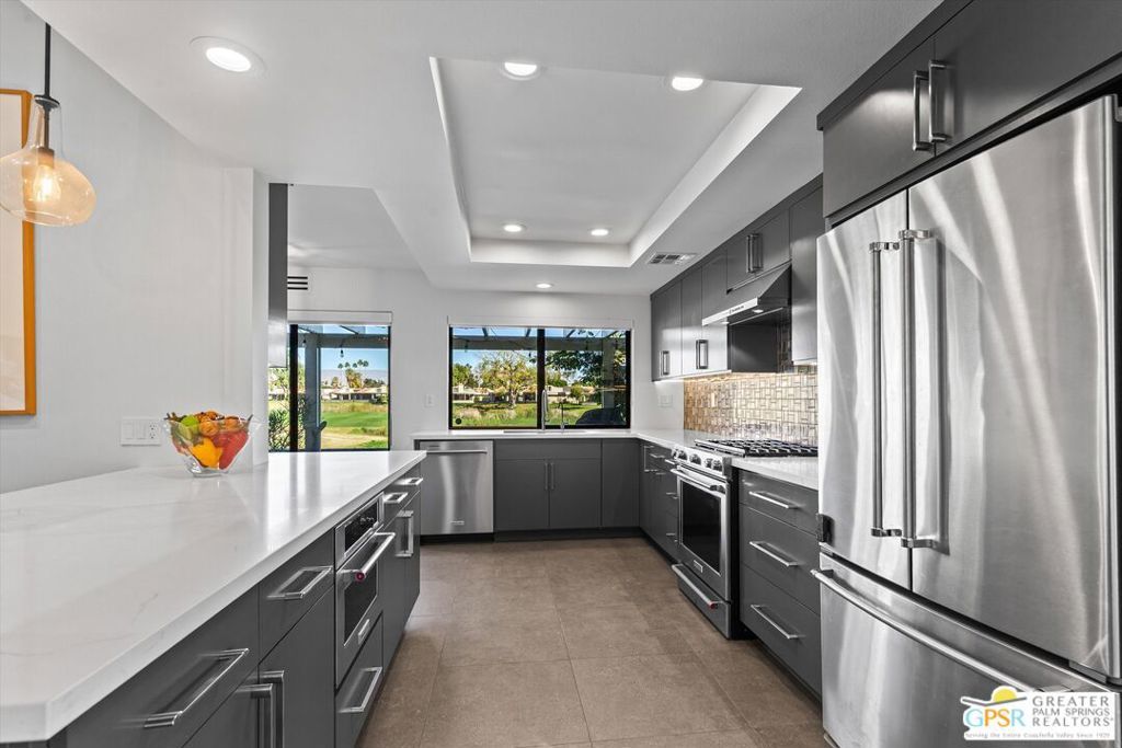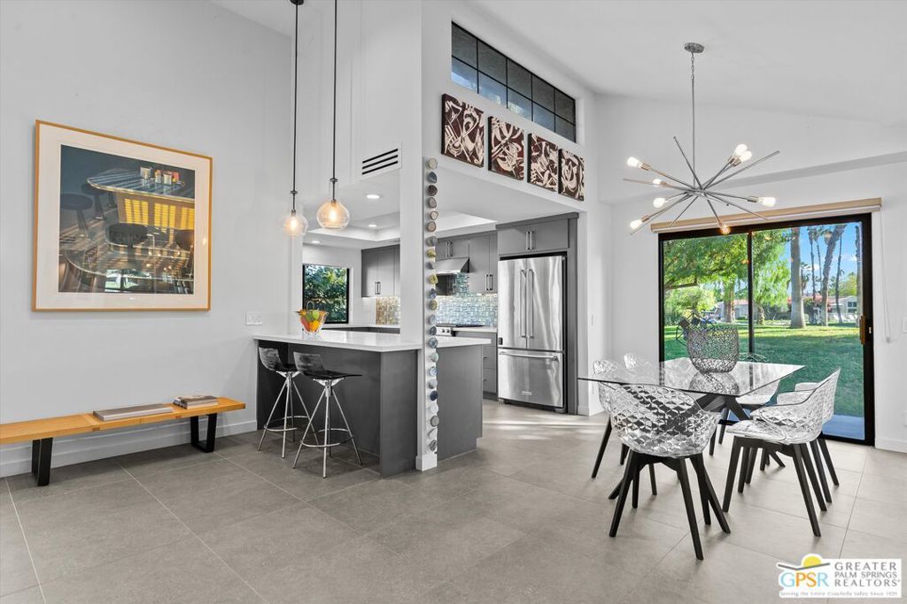 Tremendous opportunity to own a rare, detached freestanding condominium in Cathedral Canyon Country Club. Beautifully positioned to overlook a tranquil pond and the golf course, this home offers scenic views and exceptional privacy. Spanning 2,027 square feet, the well-designed floor plan includes three bedrooms (one currently used as a den) and two bathrooms. Vaulted ceilings in the living room and a cozy gas fireplace create an open, light-filled, and inviting atmosphere. The updated kitchen features contemporary cabinetry and countertops, stainless steel appliances, and is complemented by a spacious mirrored dining area and a separate breakfast nook. The generous primary suite includes vaulted ceilings with clerestory windows and a large walk-in closet. The remodeled en-suite bathroom features dual sinks, a soaking tub and an oversized walk-in shower. Additional highlights include an attached two-car garage with ample storage, a separate golf cart garage, and owned solar. This move-in-ready home is designed for comfort, convenience, and effortless desert living.