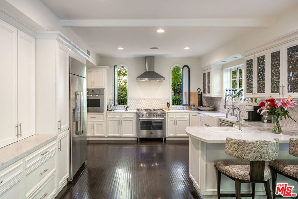 Set on a sprawling lot, this secluded Spanish Revival estate captures the allure of Old Hollywood with its harmonious blend of classic architecture and refined, warm living spaces. Tucked far back from the street behind a gated entry for complete privacy, the residence features a spacious motor court anchored by a majestic olive tree, offering a stately welcome to this remarkable sanctuary. Inside, a double-height entry foyer leads to a formal living room with a vintage fireplace and French doors that flood the space with natural light while seamlessly connecting to the lush outdoors. The estate's architectural details include tall, arched windows, intricate stained glass accents, and wrought iron embellishments, complemented by rich terra cotta elements and warm, dark woods. A chef-caliber kitchen flows effortlessly into a formal dining area, where French doors open to one of the home's many garden patios. Adjacent to the dining area is a timeless bar and game room, complete with a pool table, that extends to a private outdoor lounge and a covered dining areaideal for hosting and entertaining. The primary suite is a serene retreat, featuring vaulted ceilings, a cozy sitting area with a fireplace, and expansive windows framing picturesque views. Its spa-like ensuite bathroom is appointed with a dual vanity, rainfall shower, and indulgent soaking tub. Generously sized guest bedrooms provide comfort and privacy for family or visitors. Outdoors, the property transforms into a recreational haven. A full tennis and basketball court, sparkling pool, and jacuzzi are surrounded by lush tropical greenery, while a barrel sauna and cold plunge deliver the ultimate in relaxation. The outdoor kitchen and barbecue area, along with multiple alfresco and covered dining spaces, create endless opportunities for entertaining and embody true California luxury living. A hillside deck, perfect for stargazing, completes the exceptional backyard experience. Situated in a prime location in the Hollywood Hills, this residence offers easy access to the vibrant Sunset Strip while maintaining an air of tranquility. A masterpiece of privacy, elegance, and modern convenience, this property is a rare find, seamlessly blending the timeless charm of Spanish and Mediterranean architecture reminiscent of Old Hollywood with all the amenities of contemporary living