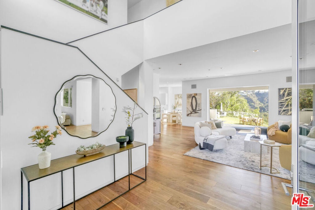 Sophisticated architectural residence in prime Bel Air with approx. 5,290 sq.ft., 5 bedrooms, 5.5 bathrooms, and full Control4 automation. Set on a rare flat pad with dual-sided views of the Pacific Ocean and the tranquil Bel Air canyons, this home offers seamless indoor-outdoor living and entertaining. A dramatic 20+ foot entry opens to an airy open floor plan with expansive living and dining areas, wide-plank wood floors, and walls of glass that frame lush views. The gourmet chef's kitchen features an oversized island, skylights, and direct flow to the dining and lounge spaces. Additional amenities include a home theater, gym, study, bar, and game area, while both the primary suite and living room enjoy fireplaces. The resort-style backyard is an entertainer's dream, complete with a sparkling pool and spa, expansive grassy yard, firepit lounge, and an outdoor dining loggia with a built-in BBQ kitchen. Multiple patios and terraces capture sweeping canyon and city vistas, while a private sports court offers both a basketball court and space for pickleball, providing year-round recreation. Ideally located just minutes to Sunset Blvd, the 405 Freeway, the Getty Center, and blocks from the prestigious John Thomas Dye School, this rare offering combines scale, privacy, and sophistication for the ultimate California lifestyle.