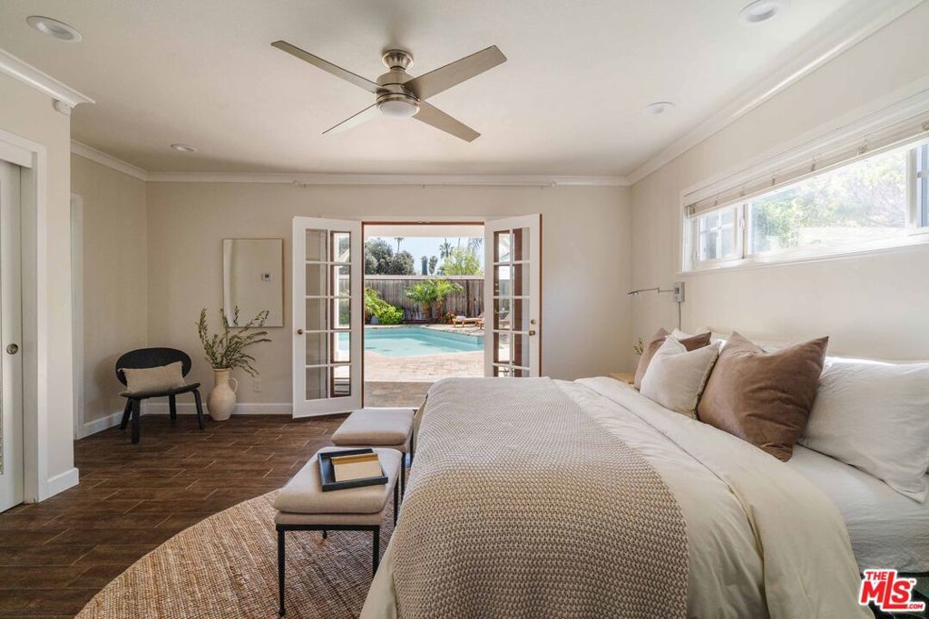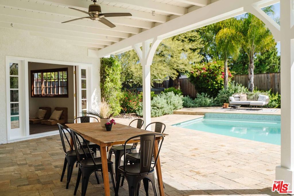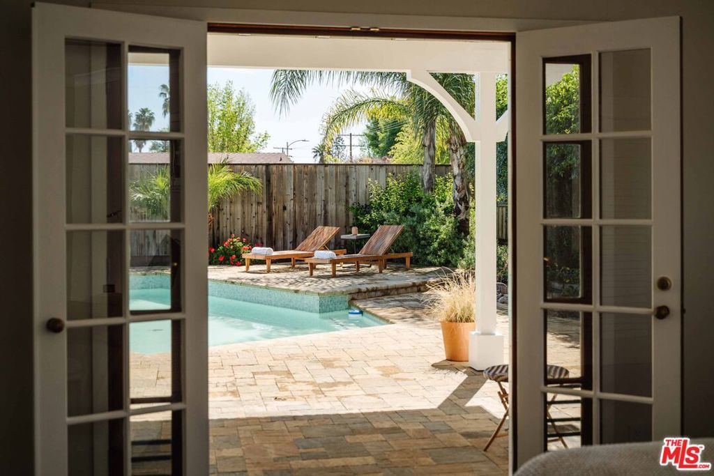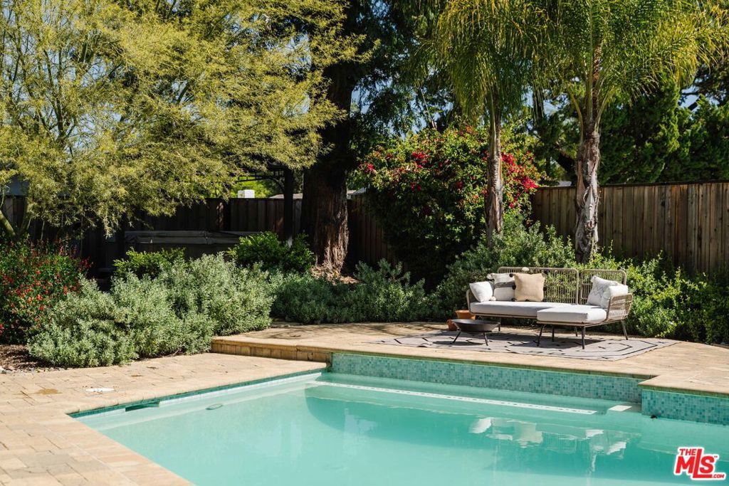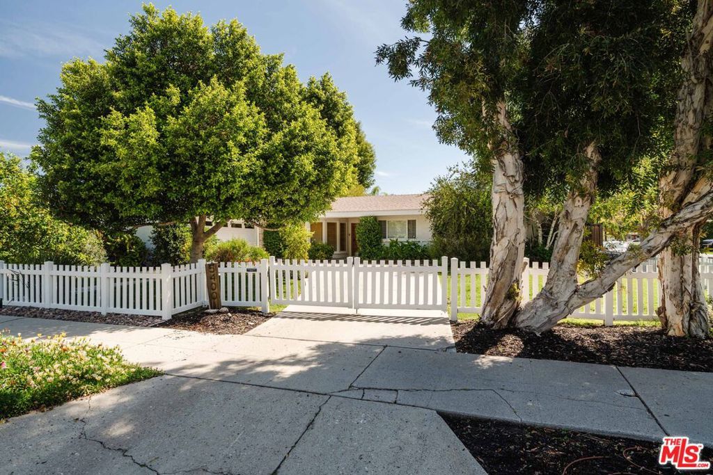 Nestled on a large corner lot, this beautifully remodeled and upgraded single-story, Mid-Century home boasts designer touches throughout. Through the front gate and past the white picket fence, guests are welcomed by lush landscaping, mature trees and long driveway. Inside, through the double wood entry doors, find a bright and open floor with an effortless flow throughout. The living room, perfect for gatherings or cozy evenings by the fireplace, connects to a gourmet kitchen equipped with stainless steel appliances, Caesarstone countertops, Carrara marble backsplash, and an island with seating. The kitchen also includes a wet bar, beverage fridge, and an adjacent dining area. The primary suite features a walk-in closet, a bathroom with a shower and dual vanity. Two spacious secondary bedrooms share an updated bathroom with dual vanities, large shower, and separate tub. French doors open to the back patio area where a gorgeous pool beckons afternoons spent lounging in the sun. Enjoy complete privacy, vibrant landscaping, and a covered al fresco dining area. Citrus trees, a plant-covered trellis, an herb garden, raised vegetable beds and garden walkways create a tranquil ambiance. With upgrades throughout including dual pane windows, newer roof, newer HVAC, new electrical panel, new drainage, privacy fencing and so much more. Located in a highly sought after neighborhood with award-winning schools, this is not a home you want to miss!