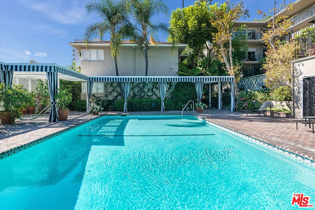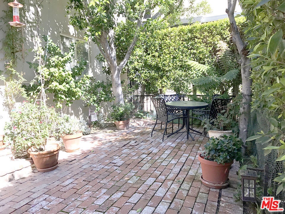 Outstanding Sunset Plaza Terrace building! Charming updated abode, with direct access to an enclosed, private brick, garden patio, a la a London mews street flat!! Sleek, open chef's kitchen with center island, adjacent hang out area and breakfast bar. Master with updated bath having a spa tub. Second bedroom or den with bath. Inside private laundry. Exceptional swimmers pool and spa surrounded by brick terraces & koi pond. Close proximity to shops and restaurants in fashionable Sunset Plaza. A gem!