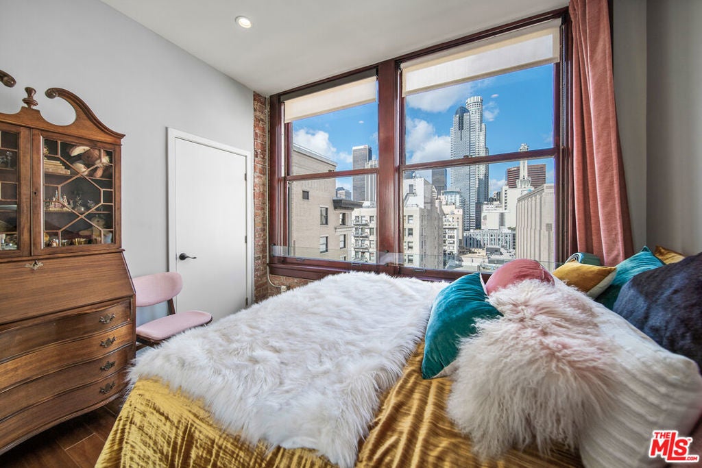 Stunning, upgraded 2 BED, 2 BATH, 12th floor loft in the historic Rowan Building with rare city skyline views and treetops of Spring Street Park. The west-facing LIVE/WORK loft is situated just below the penthouse level, and features one of the largest floorplans of nearly 1430sf. There is a bedroom and bath each on opposite ends of the unit. Take in natural light and gorgeous city views from ten oversized mahogany windows framed by beautifully restored exposed brick that span the entire length of the unit from room to room. The loft boasts over 10ft tall ceilings & hardwood floors throughout, and an open living area that's ideal for entertaining. There is a custom designer working electric fireplace and heater with temperature control and built-in storage and bench. The kitchen features Scavolini cabinetry, stainless steel appliances that include Bosch stovetop, dishwasher and Italian Fulgor oven, stainless steel fridge and microwave, and quartz countertops. Primary bedroom is separated by custom shelving, and features a massive closet & ensuite bath with quartz countertops. There is a second completely walled in regular bedroom with a door, and massive windows, wall-to-wall mirrored closet, and a guest bath just outside. Other features of this unique loft is a Bosch W/D in the unit, central heat/AC, Toto fixtures in bathrooms, ceiling fans, ambient window shades, and dimmable recessed lighting throughout. Rent includes water, trash, gas. Amenities include 24/7 front desk security and reception desk that can accept and hold deliveries, outdoor deck that features hot and cold plunge pools, resident lounge, BBQs, outdoor dining/lounge area, extra basement storage options. Few short blocks to Grand Central Market, Metro, Arts District, The Broad, Walt Disney Concert Hall, MOCA, Little Tokyo, Whole Foods, Grand Park, tons of coffee shops & dining hot spots! Optional parking is available in the adjacent covered garage structure for an additional fee.