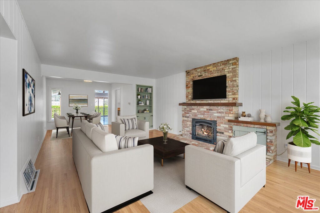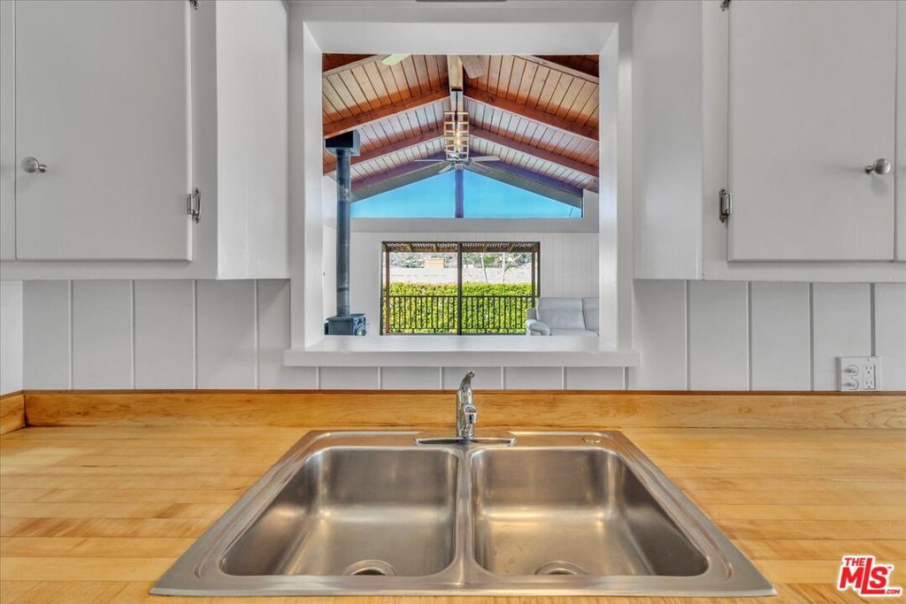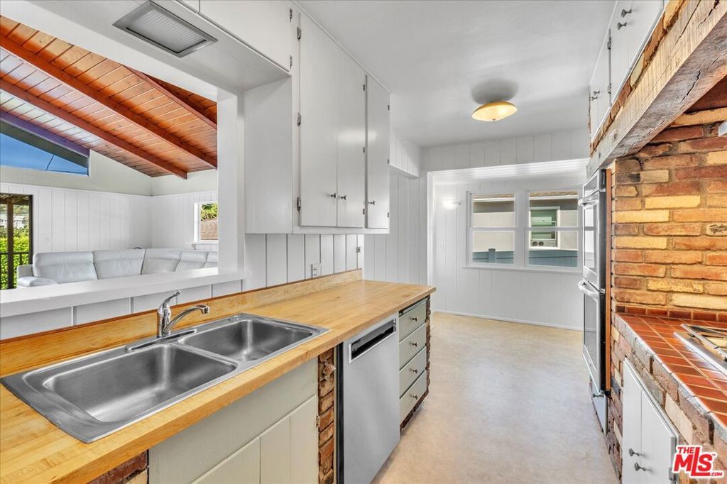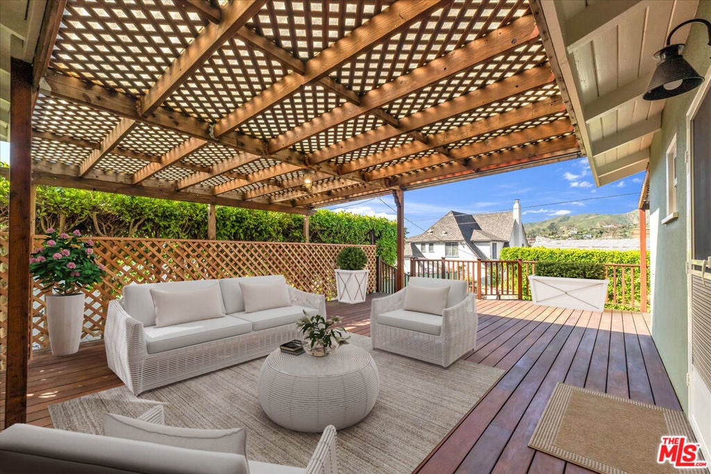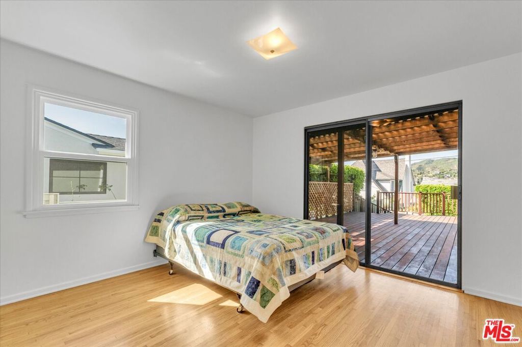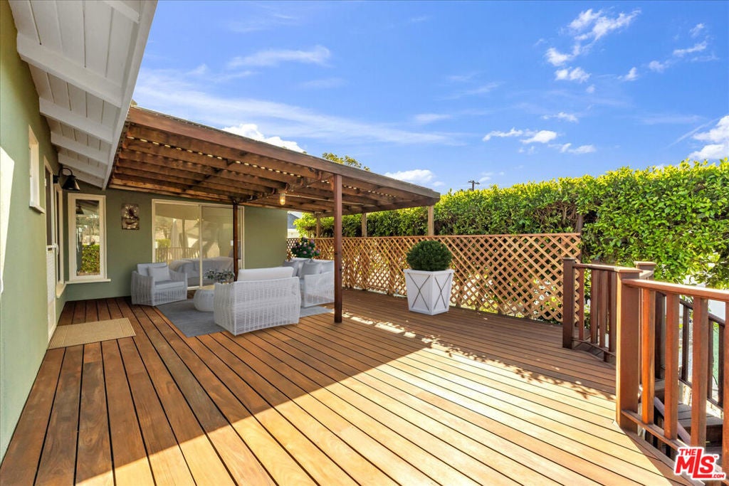 First Time on the Market in Over 60 Years. Welcome to this pristine single level 1952 Traditional home in the highly sought after El Medio Bluffs, offering a rare opportunity to own in one of Pacific Palisades' most desirable coastal neighborhoods. Recently refreshed and lovingly maintained, this classic residence is ready for its next chapter. A charming covered front veranda welcomes you inside to a central living room anchored by a cozy fireplace, flanked by the bedroom wing featuring two bedrooms and a primary bathroom. The galley style kitchen, equipped with newer stainless steel appliances, opens seamlessly to a dramatic great room with cathedral wood beamed ceilings and a second rustic barrel stove fireplace, creating a warm and inviting space ideal for entertaining or everyday living. This expansive great room also includes a second bathroom and opens to a newly refinished, trellis-shaded Ipe (Brazilian Walnut) wrap-around deck, offering multiple outdoor living and dining areas with mountain and treetop view perfect for enjoying the Southern California lifestyle. The private rear yard features a vintage brick pathway winding through a raised planter garden, ideal for gardening or outdoor relaxation. Extensive upgrades include a newer air conditioning system, updated electrical, new primary gas lines, a presidential composition roof, new gutters, Milgard single and double hung windows, and fresh interior and exterior paint. Surrounded by larger, newly constructed homes, this property presents an exceptional opportunity to live comfortably while rebuilding, expand, or hold as a long-term investment as the surrounding neighborhood continues to evolve. A rare offering, this home tells a story of resilience, community, and timeless California charm ready to be claimed by its next fortunate owner.