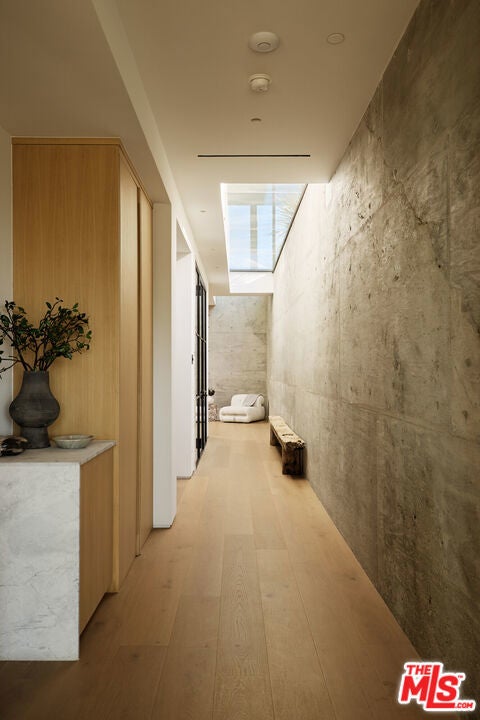 The Glassridge Residence. A Tadao Ando inspired organic modern with walls of glass that open to ocean and Getty views. Privately gated and set along one of Bel Air's most prominent ridgelines, the estate was newly completed in 2025 by Studio MD - AIA, with interiors by James Rosen. The main level is conceived as an open-plan environment with soaring 12' ceilings and sliding glass walls that connect living, dining, and kitchen spaces directly to the surrounding landscape. The kitchen reads like a gallery installation, featuring full-height travertine surfaces, a 15' waterfall island, and seamless, handle-less cabinetry that conceals an integrated Miele appliance suite, including double ovens and a built-in espresso machine. On the top level, a private vestibule with a stone-clad prep bar, integrated sink, and refrigerator precedes the primary suite, creating a quiet transition before the view reveals itself. Designed to honor its breathtaking setting, the bedroom is lined with floor-to-ceiling sliding glass walls that open to a wraparound private terrace, extending the suite outdoors and framing uninterrupted hillside and ocean views. The en-suite bath is resort-caliber, finished in travertine with a freestanding soaking tub, walk-in shower, and custom double floating vanities. A linear skylight draws natural light into the space, while a custom walk-in closet sits adjacent, integrated with matching wood millwork. The lower level is organized as a sequence of architectural moments featuring a linear corridor set against an exposed board-formed concrete wall, left intentionally raw, accented by wide-plank oak flooring. This level includes a private three-tier theater, temperature-controlled wine room, gym and steam shower, bar and lounge area that opens to a separate outdoor deck, all designed as a self-contained environment for leisure, wellness, and entertaining. A fully integrated Control4 system manages lighting, climate, audio, and security. The backyard showcases a 41' infinity pool that visually disappears into the landscape, flowing into a waterfall feature visible from the lower deck below. Lounge areas, dining zones, a built-in Alfa wood-fired pizza oven, grill, and a level lawn are arranged as distinct outdoor settings, all oriented toward the surrounding hills. 1149 Linda Flora Drive stands apart as an architecturally distinguished estate thoughtfully designed for privacy and wellness.