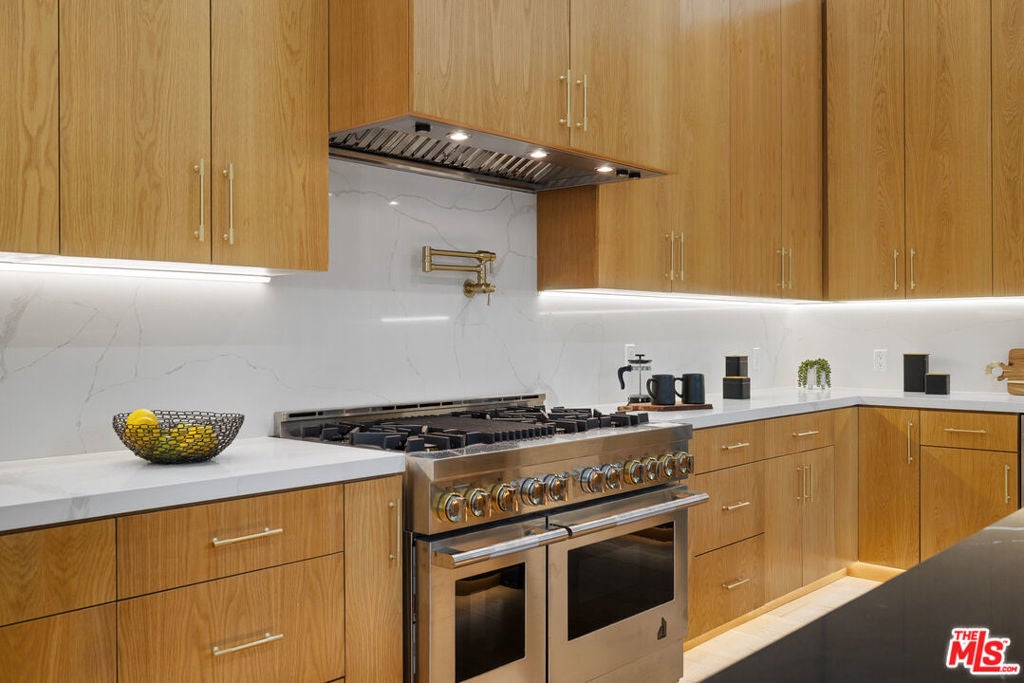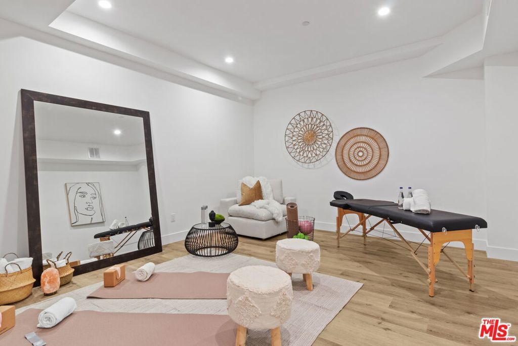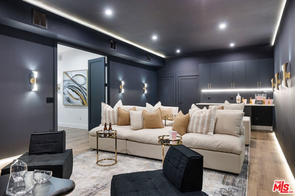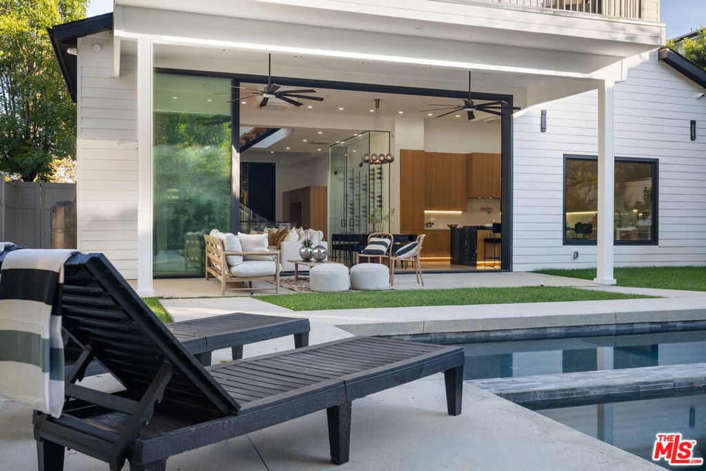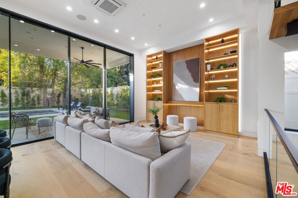 Welcome to this Stunning New Construction Home in the Heart of Encino, South of the Blvd. This Home features 5 Bedrooms + Gym + Theater, Pool, Spa, Private Yard in the Front and Back. This Home also features 13 foot Ceilings, Living Room and Den with Built in Bookshelves with Lighting, Engineered Hardwood Floors Throughout, Glass Staircase leads Through all 3 levels with Gorgeous Drop Chandelier. Custom Built Kitchen Cabinets, Jennair Appliances, Quartz Countertops, Floor to Ceiling Glass Wine Cellar, Large Kitchen Island. Home features 12 Foot Sliding Glass Door opening the Entire Den and Dining area to Covered Patio and Backyard. Great Place to Entertain, Al fresco Dining and sit with a Glass of Wine. Grass Backyard with Pool and Baja Spa and Built in BBQ. Private Tree Lined Yard faces West with Great Afternoon Sun Exposure. Upstairs is a Large Primary Suite with Double Door Balcony that overlooks the Backyard, Beautiful Double Door Balcony to Sit outside and enjoy LA Sunsets. Two Large Kids Bedrooms, Each Room features En-suite Bathrooms with Gorgeous Tiled Showers. Kids Bedrooms have Shared Balcony, Primary has Large Custom Built Closet. Primary Bath also features Soaking Tub, Double Shower Head Walk-in Shower. 4th Bedroom/Office with En-suite Bathroom on Main level. 5th Bedroom/Maids or Nanny Suite on Bottom Level with Gym and Separate Bathroom. Double Door Entry to Home Theater with Theater lighting and Projection Screen. This Home Features a European Air/Heat with each room able to control it's on temperatures, 3 HVACs, 2 tankless Water Heaters, Completely Wired for Surround Sound Plus Speakers, Laser Perimeter Alarm, Cameras, Side by Side Laundry, Paid Solar Panels, Tree lined front for Privacy, 2 Car Garage with Extra Storage. This Home is One of a Kind.