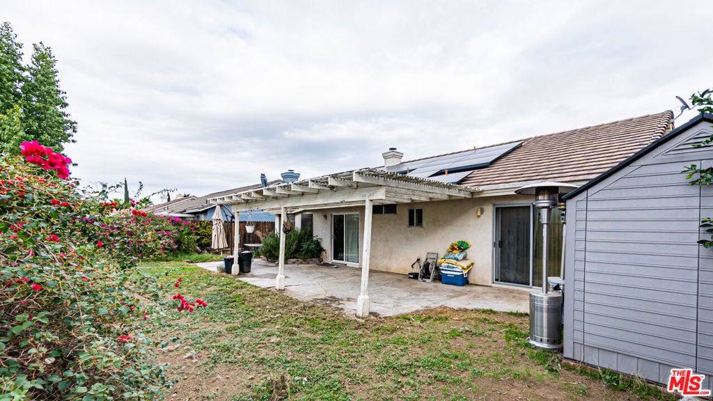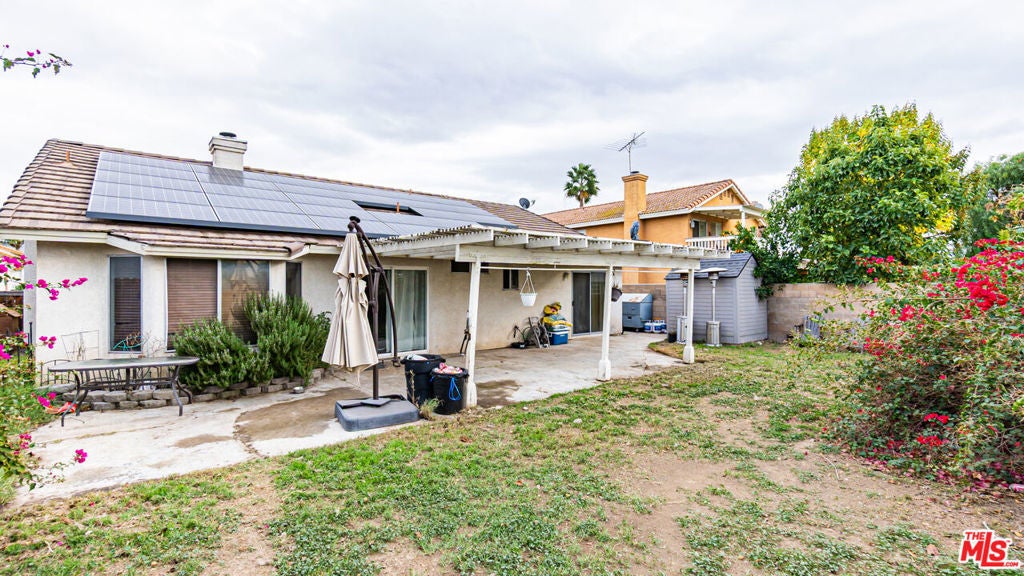 Beautiful 4-Bedroom Home on Cul-De-Sac in Moreno Valley! This home features an open modern-concept layout w/ soaring vaulted ceilings throughout. Living room w/ dual-sided fireplace. Adjacent family room. Kitchen w/ quartz countertops, stainless-steel appliances, & breakfast area w/ bay windows. Spacious bedrooms w/ lots of closet space. Master Bedroom w/ jetted tub & access to backyard. Laundry room w/ storage. Central AC + heat. Huge private backyard w/ covered patio & grassy area - perfect for entertaining! Storage shed. Fully paid-off Tesla solar system. 3-car garage w/ plenty of driveway parking. Just minutes to Lake Perris & the best shopping, dining, & entertainment the area has to offer. A fantastic opportunity in a great neighborhood!