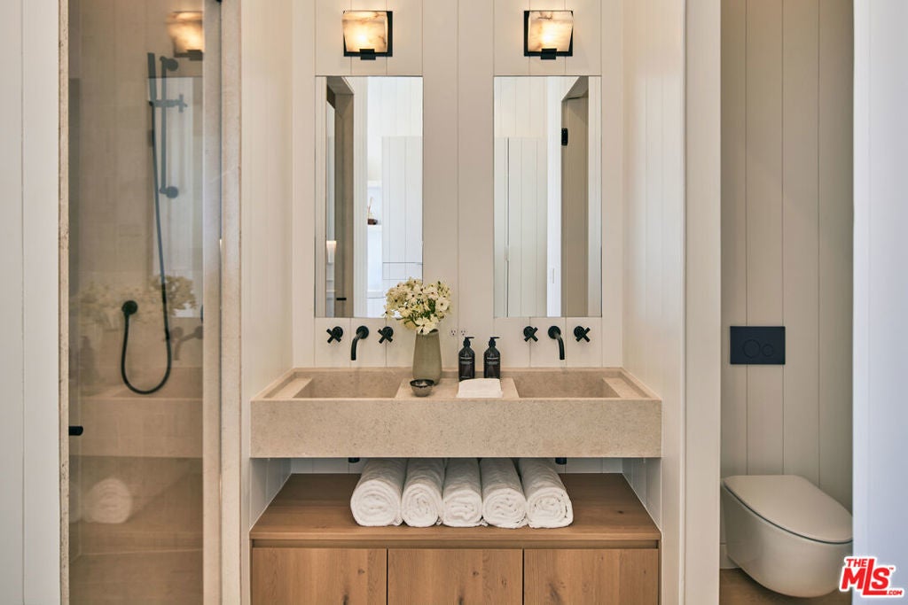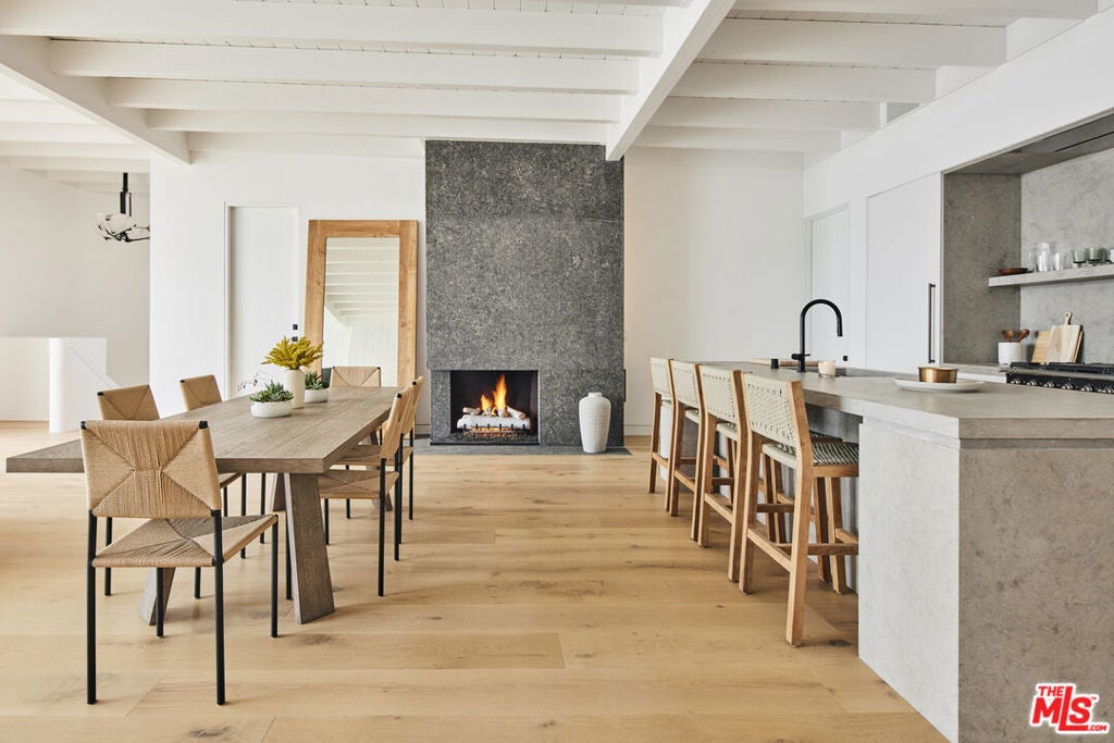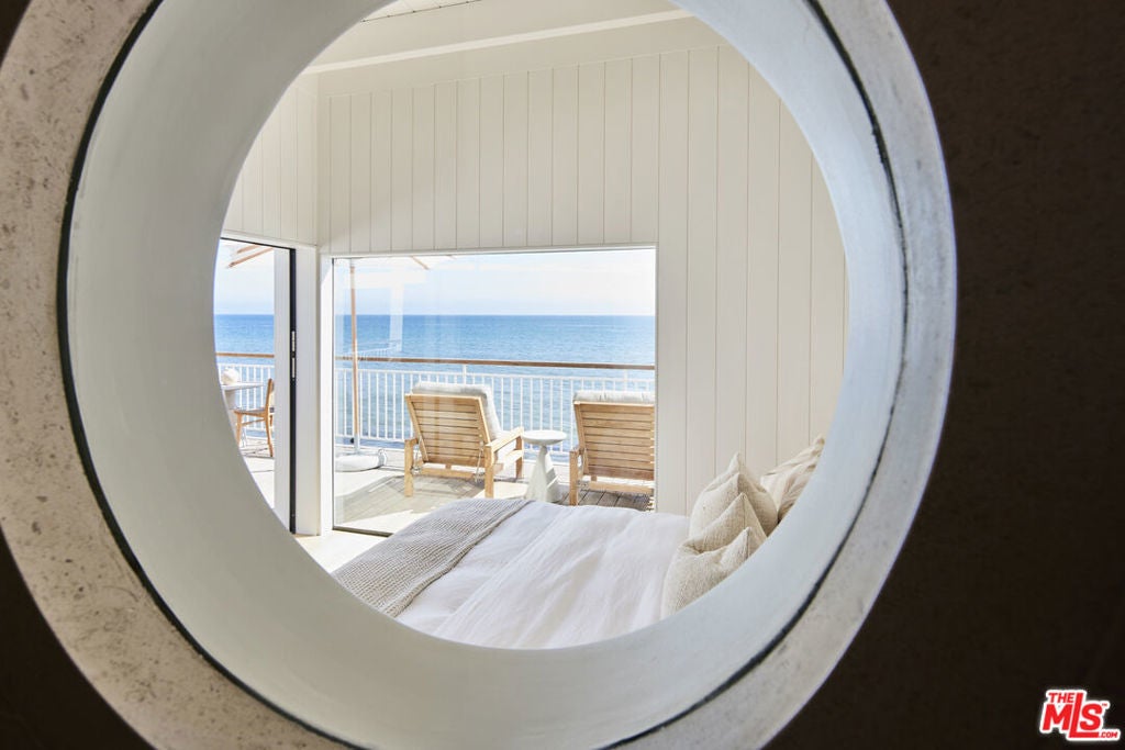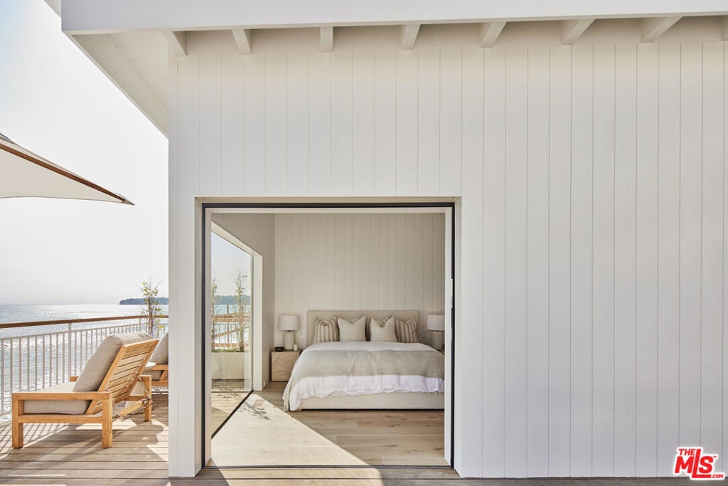 Located on the private Escondido Beach Road, this move-in-ready Mid-Century beachfront residence sits on 50 feet of coveted Escondido Beach. Recently and meticulously reimagined by design team Warren Garrett, the newly completed home blends timeless materials with modern amenities throughout. The turnkey property offers 4 bedrooms and 4.5 baths, two levels of oceanfront decks, and a striking French grey plaster pool just steps from the sand. Positioned near the end of a private street, the home enjoys privacy and separation from Pacific Coast Highway while remaining moments from Geoffrey's Restaurant and a scenic beach walk to Paradise Cove Beach Cafe. The clean exterior opens to panoramic ocean views, white oak floors, exposed beam ceilings, and an open-concept gourmet kitchen featuring an Italian limestone island, La Cornue range, stone shelving, and new high-end appliances. Three en-suite bedrooms are located on the main level, with a fourth bedroom, full bath, and secondary bar and kitchen on the lower level, ideal for beach and poolside entertaining. Available fully furnished and move-in ready with all new Jenni Kayne Home furnishings. ***Seller financing available***