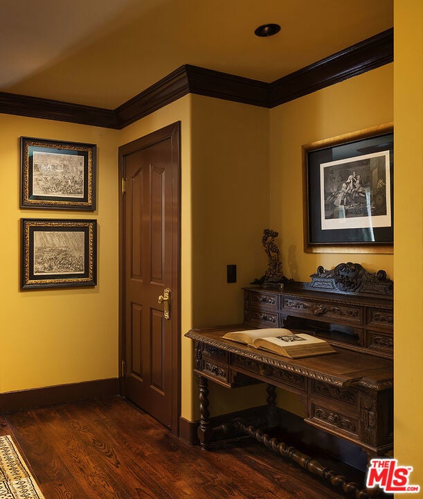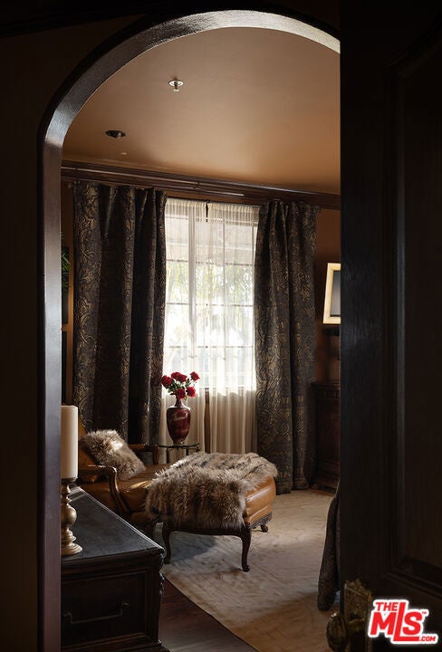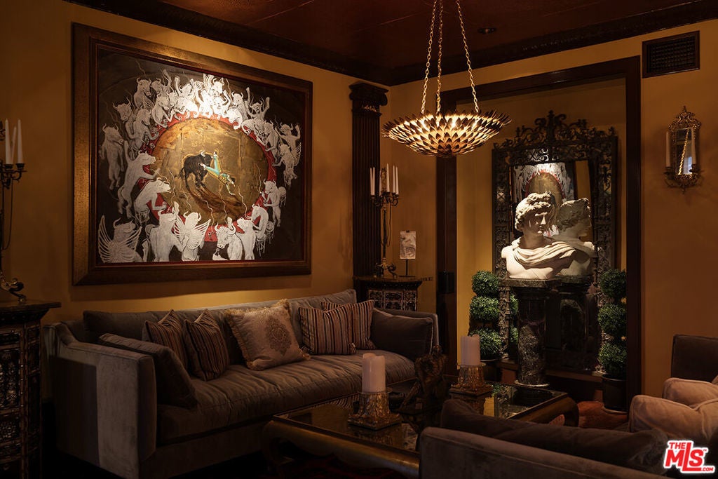 An extraordinary opportunity to acquire a fully furnished work of art delivered complete with museum-quality antiques, custom furnishings, original artwork, and curated decor sourced from around the world. Every piece was hand-selected specifically for this residence, offering a rare chance to own a complete Old Hollywood-inspired masterpiece at list price. This meticulously remodeled two-story townhome in West Hollywood's coveted Norma Triangle blends Gilded Age sophistication with modern comfort. The light-filled two-bedroom, two-and-a-half-bath layout offers exceptional flow for entertaining. The main level features stunning copper leaf tin ceilings throughout the living room, dining room, and breakfast alcove. A museum-quality Grand Tour marble bust of Apollo anchors the formal living room, centered on a spectacular fireplace. The dining room opens through double doors to a private covered terrace with immersive faux boxwood walls. The well-appointed kitchen includes a Viking six-burner gas range and connects seamlessly to both dining spaces. The powder room is a showpiece, with black crocodile-embossed walls, tin faux-brick wainscoting, and nineteenth-century Flemish infinity mirrors. The lower level (the building's second floor) offers a second private entrance, a home office nook with an antique French walnut desk, and two bedroom suites. The primary suite includes a butler's pantry with a hidden refrigerator, a generous walk-in closet, a luxurious bath with a separate tub and shower, and a private terrace with electric awnings. Two dedicated parking spaces, private storage, and access to the building's south-facing pool, fitness center, and rooftop deck with panoramic views. Steps from Sunset Plaza, SoHo House, and moments to Rodeo Drive.