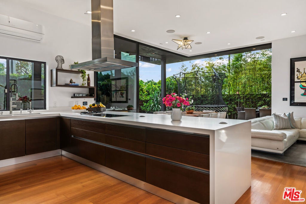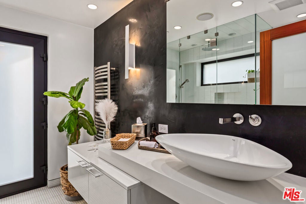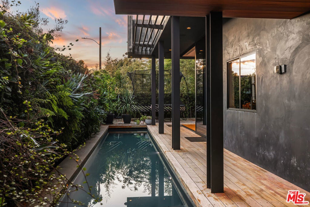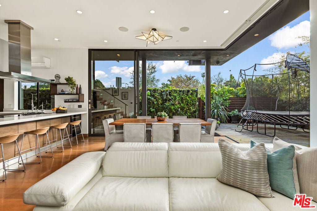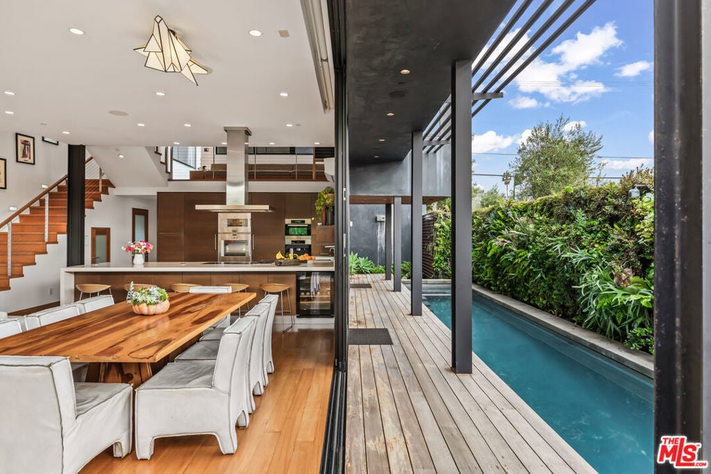 Situated in Venice's coveted Silver Triangle, welcome to this architectural home designed by David Hertz, known as The Butterfly House, a rare union of design pedigree and effortless livability, thoughtfully crafted for coastal life at its most elevated. Past a discreet facade, the house opens in one sweep: pocketing walls of glass dissolve the boundary between the great room and a lush, private courtyard where a slender lap pool and spa run alongside warm decking and verdant living walls. Inside, engineered teak floors and soaring ceilings set a calm, modern tone, while the open kitchen integrates appliances and beautifully detailed cabinetry, framing everyday life and easy entertaining. The flow is intuitive: dine with the sliders open to the outside, linger by the sleek fireplace, then drift upstairs along a sculptural stair to a mezzanine that overlooks it all. Performance quietly powers the experience. Radiant-heated floors carry warmth throughout. A full Crestron system puts the home in your pocket, open and close windows, tune whole-home surround sound, and manage heat in every zone thanks to split systems in each room. The structure is engineered for longevity and quiet, from robust glazing and invisible hinges to an exterior air barrier with stainless-steel cladding accents. The house even self-ventilates for fresh air, while extensive wiring and interior/exterior security cameras provide modern peace of mind. The private primary suite is a sanctuary: a sunlit retreat with custom-built-in storage, terrace-like views into mature greenery, and a generous walk-in closet. Its spa-level bath pairs a freestanding soaking tub with a glass shower and dual vanities, all bathed in soft natural light, an everyday ritual made luxurious. The second and third bedrooms are thoughtfully placed, with a Jack-and-Jill bathroom that maximizes flexibility for family or guests. Two laundry rooms simplify daily rhythms, and the rear building's interior walls are non-structuraloffering future-proofing for whatever you imagine next. Sustainability is built in, not bolted on. Solar power and solar thermal tubes preheat domestic water before it reaches the heater, with any surplus heat directed to the pool; the home runs predominantly electric with a single auxiliary gas burner. From African mahogany Sapelle doors to exceptionally strong glass, every material choice reflects lasting quality. And because everything is wired and thoughtfully automated, you can arrive to comfort, windows, music, and radiant heat set just how you like, at the touch of a phone. Moments to the Venice Canals, Abbot Kinney, Rose Avenue, and the beach, this move-in-ready residence distills the best of the Silver Triangle: an architectural statement that lives beautifully, functions intelligently, and delivers resort-style tranquility right where you want to be.