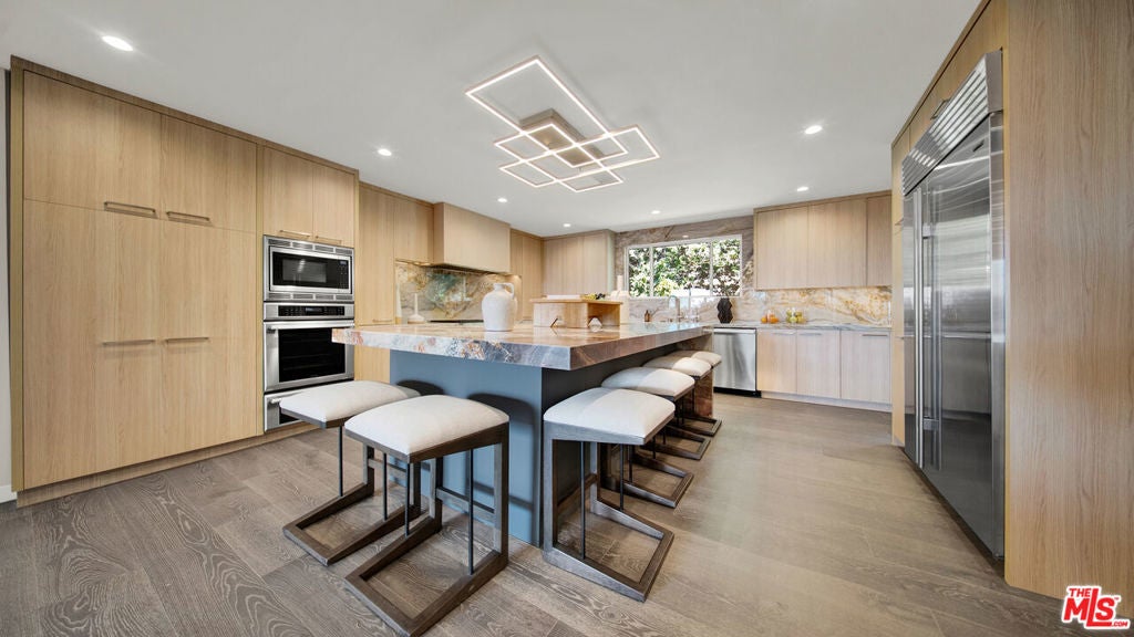 11601 Bellagio Road, Bel Air - where modern elegance meets effortless California living. Tucked within one of Bel Air's most coveted enclaves, this newly built contemporary residence welcomes you with warmth, style, and refined sophistication. Sunlight pours through an expansive wall of glass, bathing the interiors in a soft golden glow and framing serene canyon vistas that instantly calm the senses. The spacious living areas flow seamlessly outdoors, creating an ideal environment for elevated indoor-outdoor living. Entertain with ease in the chef's kitchen and sleek bar, gather for memorable moments with friends, and dine al fresco as the sun sets over the canyon backdrop. Every space is designed to feel natural, airy, and effortlessly luxurious. The primary suite serves as a tranquil retreat generous in scale, serene in atmosphere, and complete with a spa-inspired bath designed for pure relaxation. Each additional bedroom features its own en-suite bath, offering exceptional comfort and privacy for family and guests. A versatile fourth bedroom adapts perfectly to your lifestyle, whether as a guest suite, private office, or fitness studio. Outdoors, the expansive backyard opens to breathtaking canyon views, providing the perfect setting for morning coffee, sunset cocktails, or quiet evenings beneath the stars. This is a rare Bel Air offering fresh, inviting, and thoughtfully designed for those who value beauty, light, and the very best of California living.