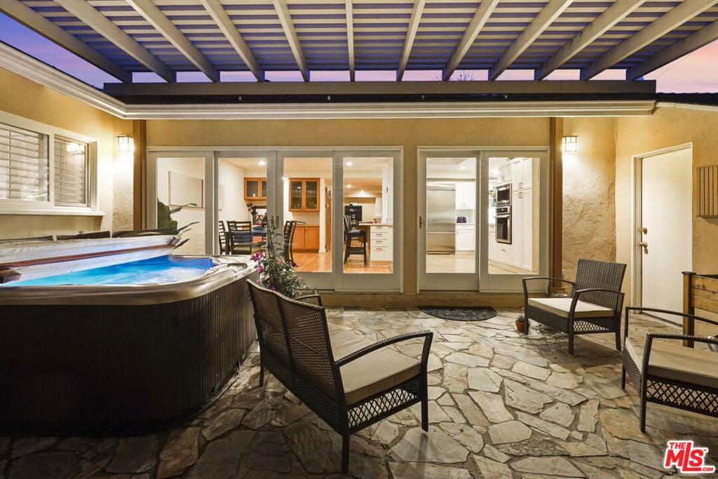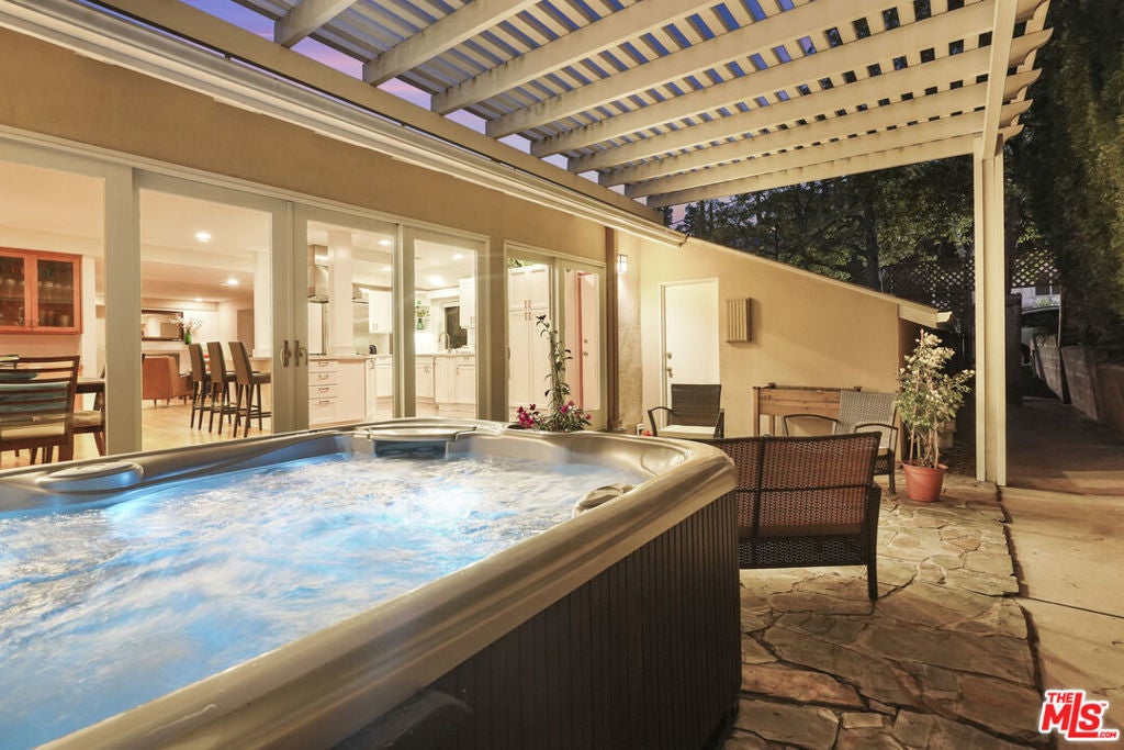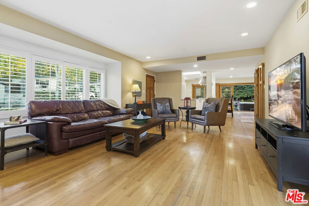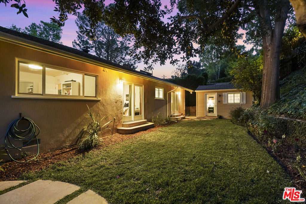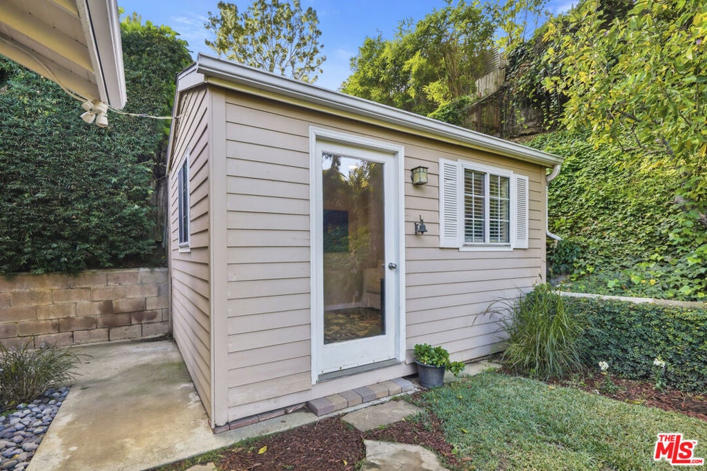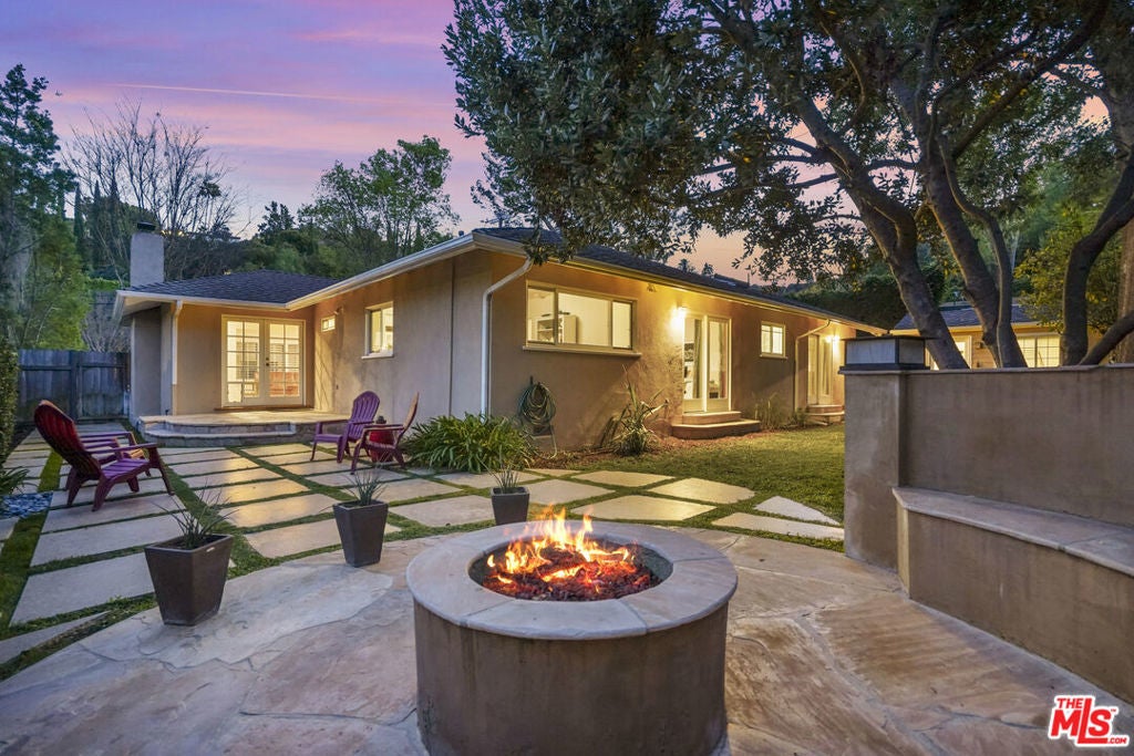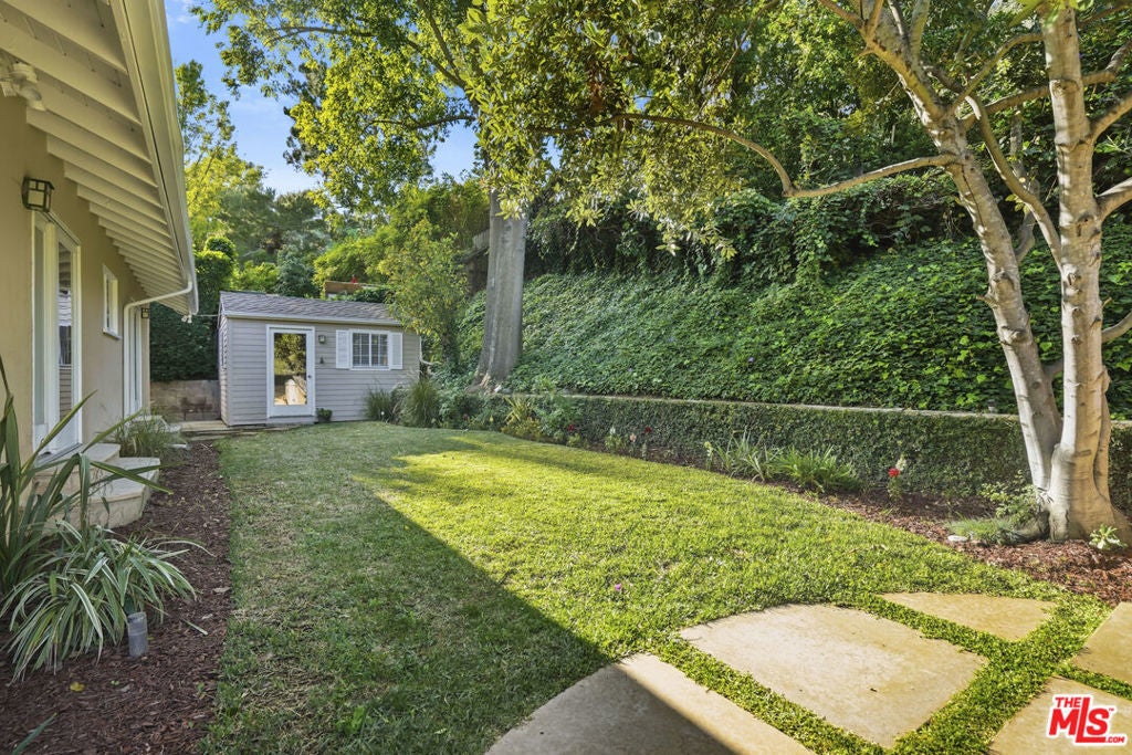 Built in 1954, this reimagined California ranch offers a clean, single-level layout with strong indoor-outdoor flow. The main living spaces sit at the center of the home, where natural light fills the living room and highlights hardwood floors, a clean fireplace surround, and built-in cabinetry. French doors open directly to the backyard, while a wide front window provides consistent daylight throughout the day. The living room flows seamlessly into the fully remodeled kitchen (2025). A skylit island anchors the space and creates a natural gathering point, complemented by generous cabinetry, quartz countertops, open shelving, and new stainless steel appliances. The kitchen opens to a spacious dining area and dry bar, with glass doors framing views of the patio and hillside beyond, enhancing everyday living and entertaining. The bedroom wing is set apart from the main living areas, providing privacy and a quieter atmosphere. The primary suite includes its own bathroom and direct access to the yard. Two additional bedrooms allow the home to function as a true three-bedroom layout, offering flexibility for guests, work, or changing needs. Both bathrooms have been updated with clean, thoughtful finishes. One features a skylit walk-in shower, while the other includes a travertine-tiled tub with a glass enclosure. Outdoor spaces are private and inviting, shaped by mature trees, layered landscaping, and the natural rise of the hillside. A pergola-covered patio with a spa tub extends the dining area outdoors, while a curved built-in bench surrounds the fire pit for evening gatherings. The fenced lawn provides space to relax, play, or garden while maintaining a cohesive setting. A detached office sits slightly apart from the main house, offering a quiet, independent space well suited for work or creative use. Recent interior updates allow the home's mid-century architecture and layout to shine. Located in a desirable Sherman Oaks pocket near the Village, with easy access to the 405 and 101 freeways.